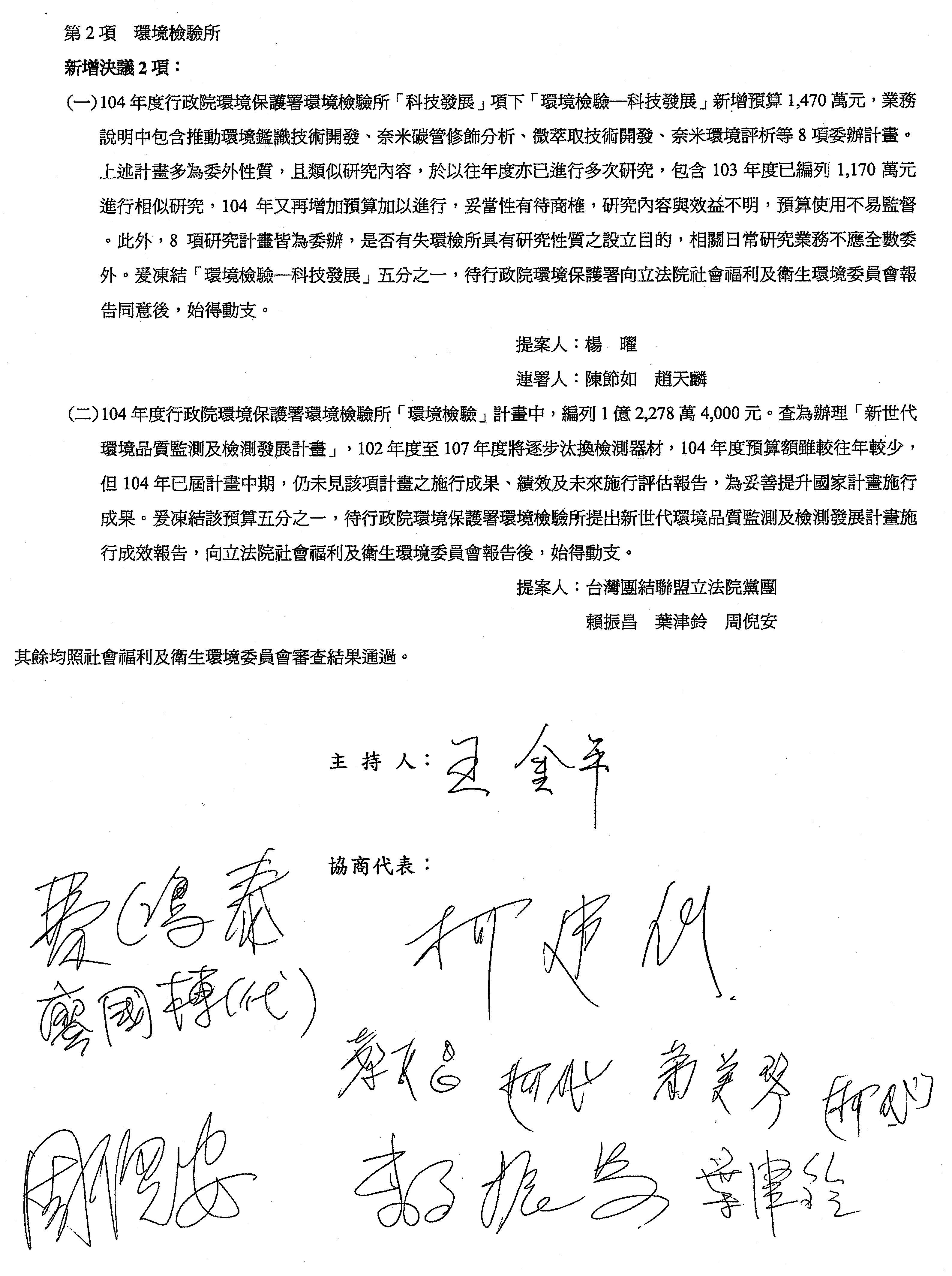(二)104年度行政院環境保護署「綜合計畫」項下「綜合企劃」之經費編列8,012萬1,000元。其中3,069萬6,000元係用於實施環境影響評估之相關經費,但有鑑近來我國許多重大環境影響評估案,例如臺東縣美麗灣開發計畫與臺南市鐵路地下化工程等都屢屢發生糾紛,顯示環評制度有進行澈底檢討之必要,爰凍結100萬元,待行政院環境保護署至立法院社會福利及衛生環境委員會針對環評法規與環評審查作業之修正進行報告後,始得動支。