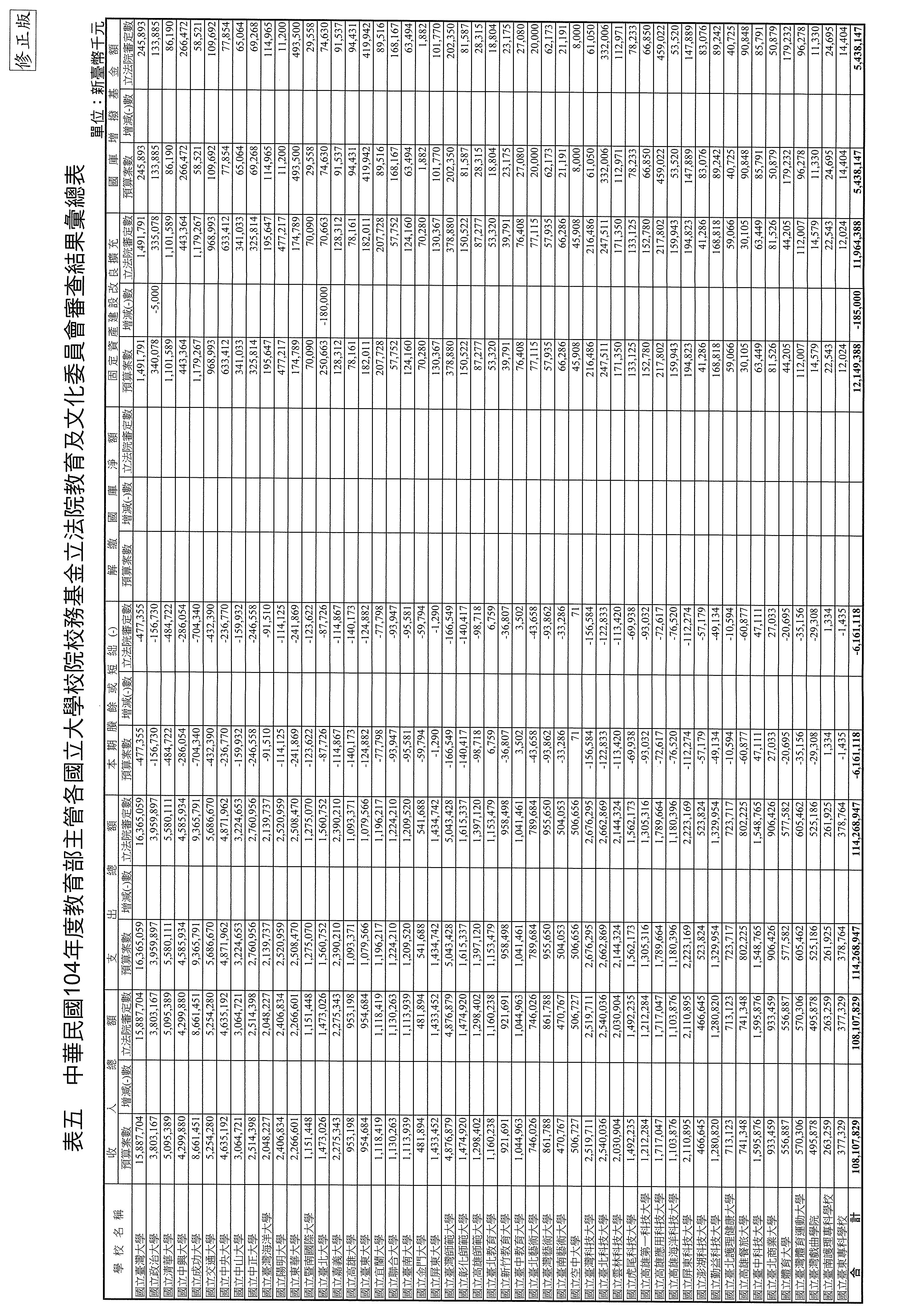 (四)資本計畫基金原列基金來源193億1,009萬6,000元,基金用途41億2,329萬9,000元,本期賸餘151億8,679萬7,000元。審查結果,減列基金用途5萬元,增列本期賸餘5萬元(詳表六修正版)。