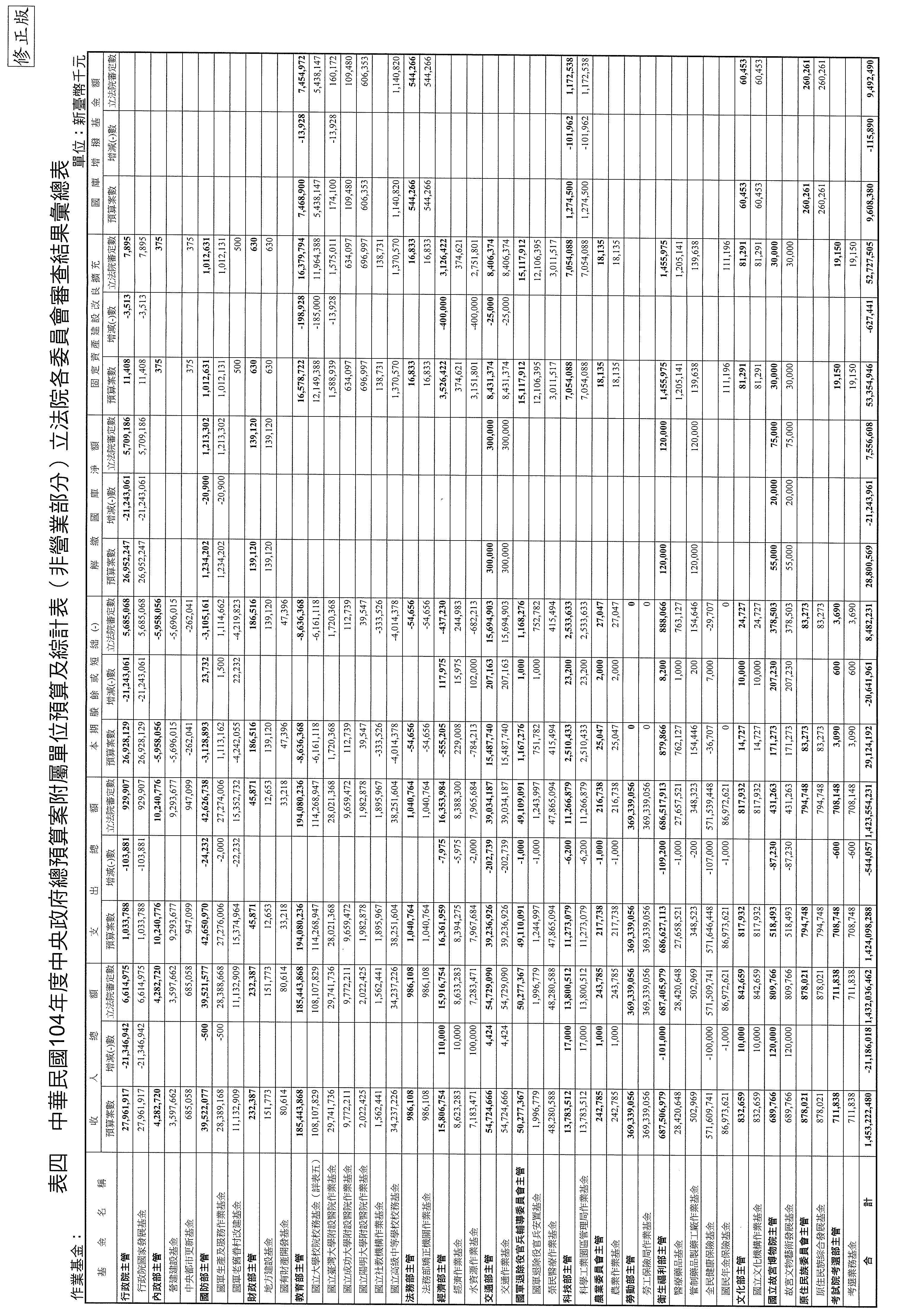 四、中華民國104年度中央政府總預算案經本院第8屆第6會期第19次會議審議結果,其涉及附屬單位預算營業及非營業部分均暫照列,應隨同本(附屬單位預算)案審議結果調整,其中歲入歲出之調整,仍應依本院審議中華民國104年度中央政府總預算之決議及預算法等規定辦理。
