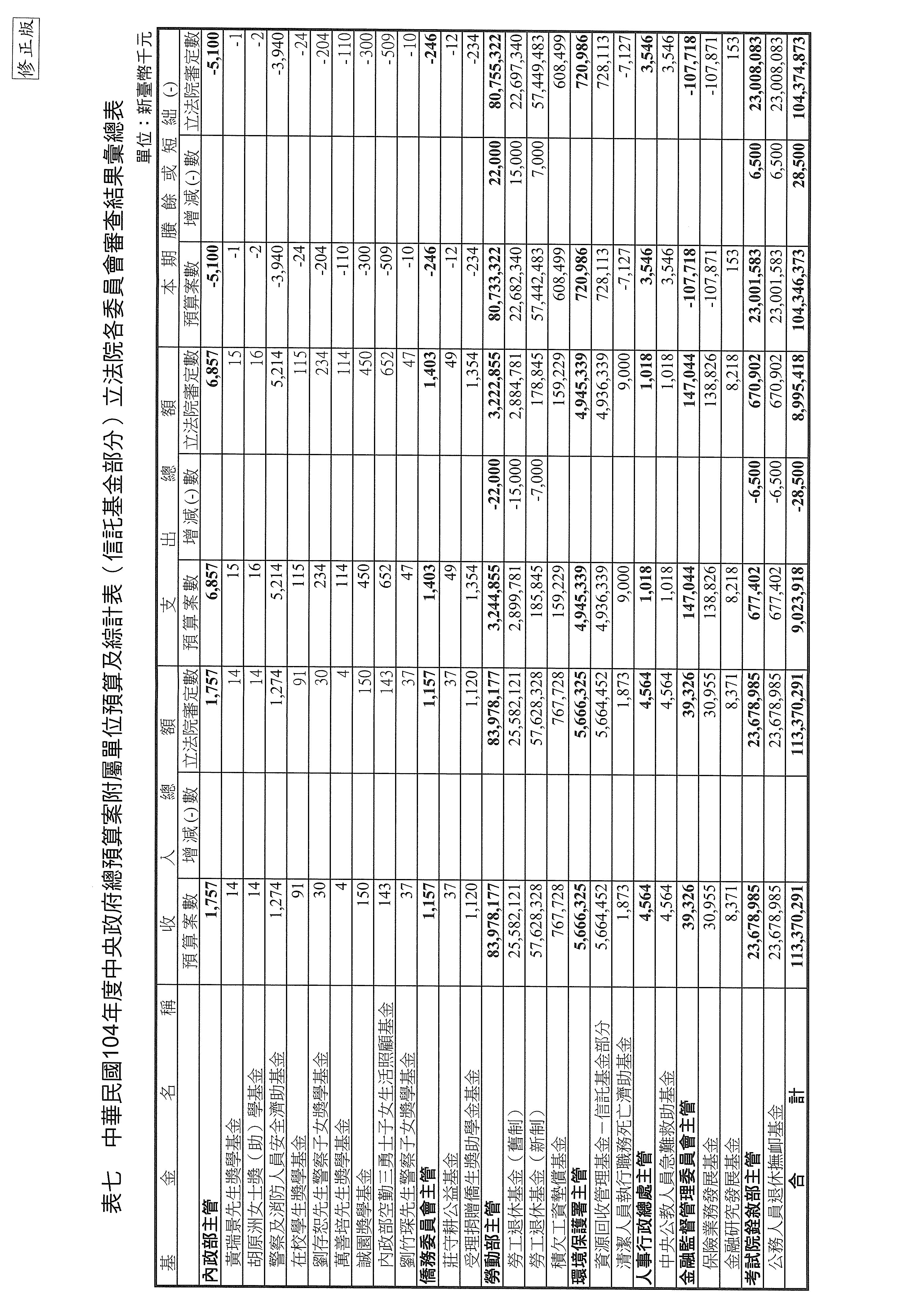 中華民國104年度中央政府總預算案附屬單位預算及綜計表非營業部分—信託基金項下,計有勞工退休基金(舊制)、勞工退休基金(新制)、積欠工資墊償基金、資源回收管理基金-信託基金部分、保險業務發展基金及公務人員退休撫卹基金等20個基金,共編列總收入1,133億7,029萬1,000元,總支出90億2,391萬8,000元,本期賸餘1,043億4,637萬3,000元。審查結果,減列總支出2,850萬元,增列本期賸餘2,850萬元(詳表七修正版)。