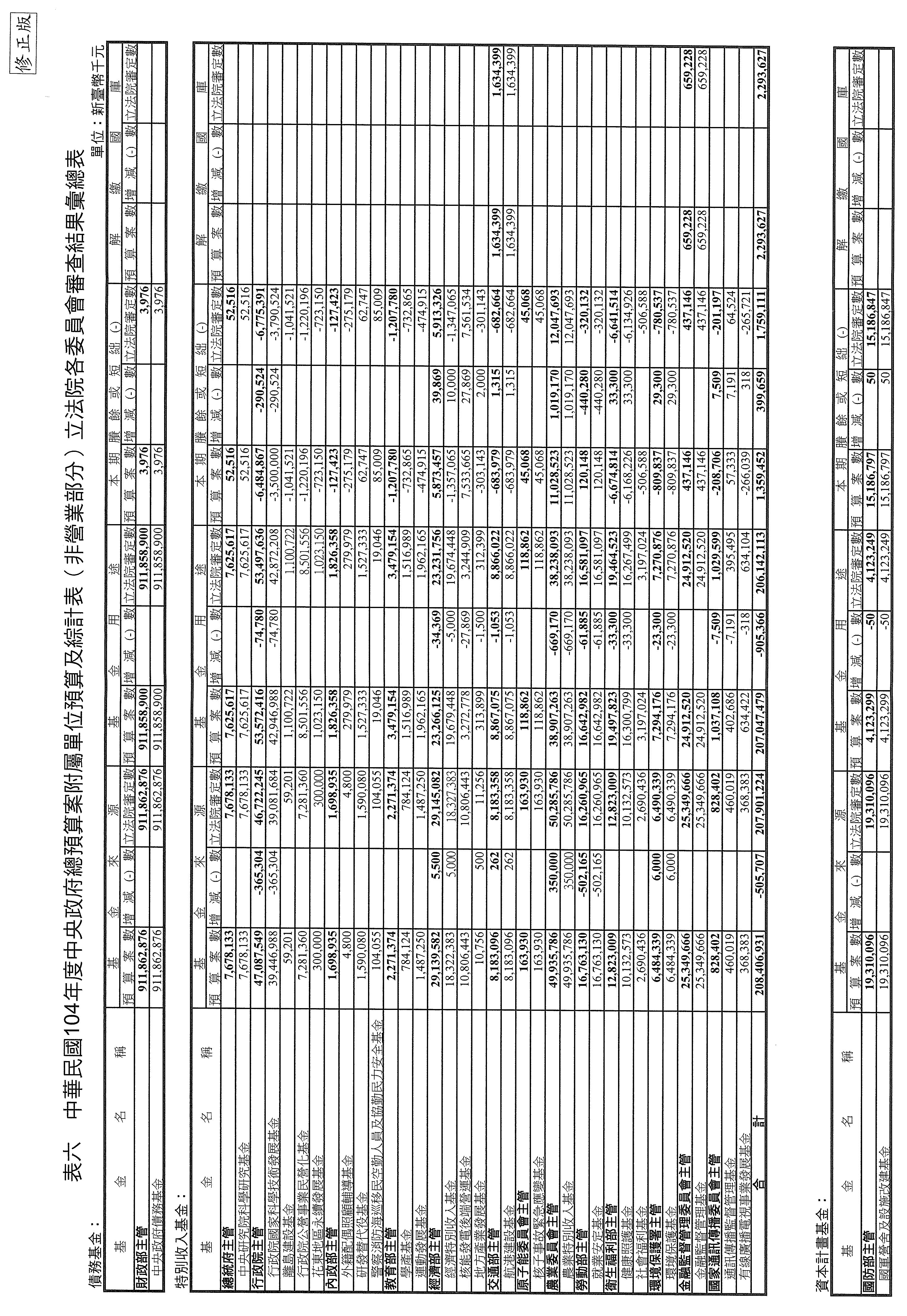 中華民國104年度中央政府總預算案附屬單位預算及綜計表營業部分,原列營業總收入3兆1,222億5,613萬2,000元,營業總支出2兆9,568億8,507萬7,000元,稅後淨利1,653億7,105萬5,000元。審查結果,減列營業總收入1,879億8,218萬1,000元,減列營業總支出(不含所得稅費用)2,333億5,995萬9,000元,增列稅前淨利453億7,777萬8,000元(詳表三修正版)。至於所得稅費用及盈虧撥補事項,俟院會審議確定後,再由行政院依法核算及分配。各單位有關之業務計畫、轉投資、重大建設、資金運用及資產負債預計等部分,應分別依本案審定數額予以調整。