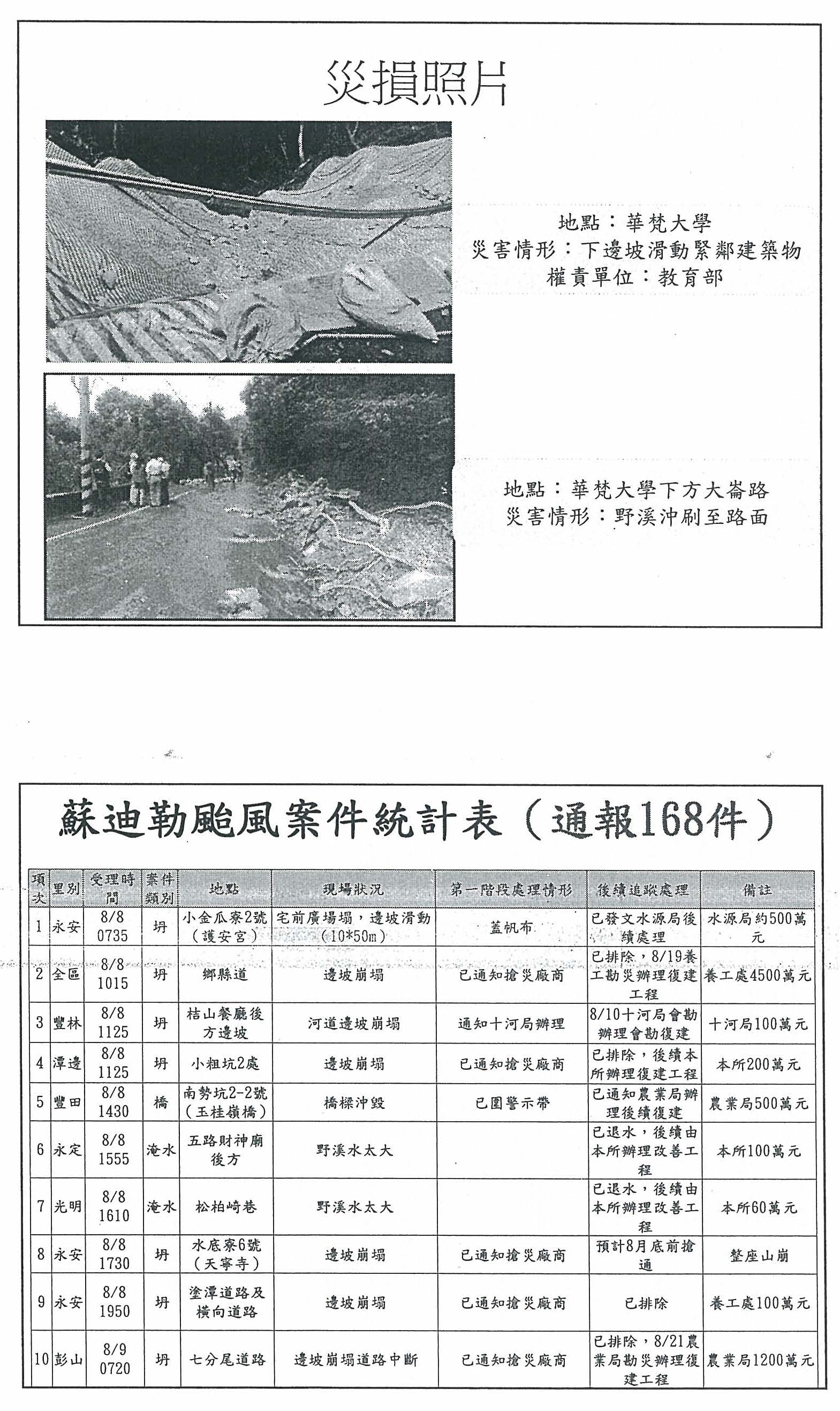 廖委員國棟:(16時57分)主席、行政院毛院長、石主計長、張部長、鄧部長、各部會首長、各位同仁。院長辛苦了,你從早上到現在都沒有休息,本席是今天最後一位質詢的委員,所以我們就輕鬆一點,但是我所要講的問題絕對不輕鬆,本席要跟你談的就是流域綜合治理計畫相關預算的編製。在討論這個問題之前,本席要先詢問關於兩個地方的事務,第一,早上已經有其他委員問過關於原住民地區林木禁伐補償這件事情嗎?