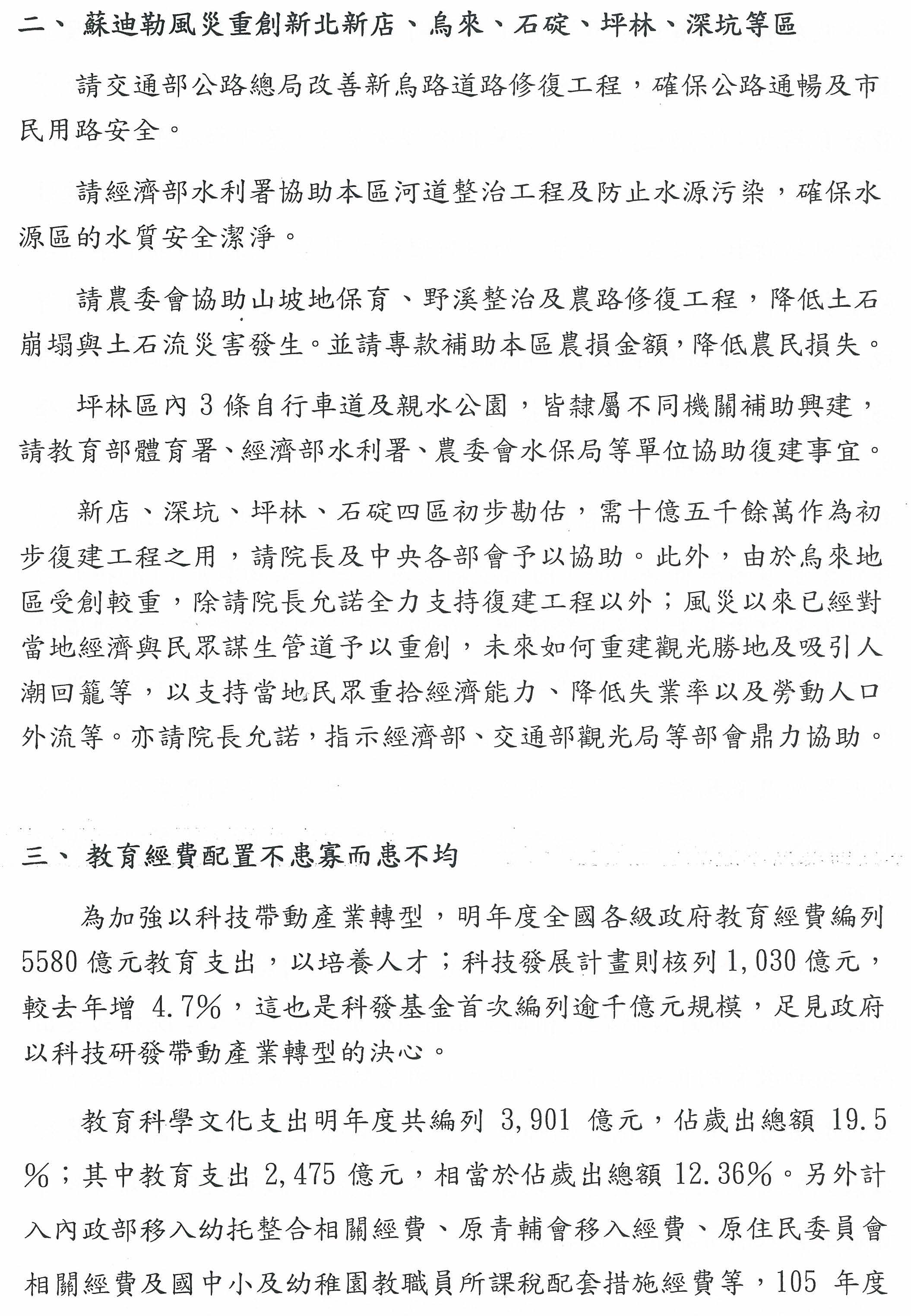 主席:現在繼續開會,對行政院院長、主計長、財政部部長、經濟部部長及相關部會首長列席報告「105年度中央政府總預算案」及「105年度至106年度中央政府流域綜合治理計畫第2期特別預算案」編製經過繼續進行質詢。