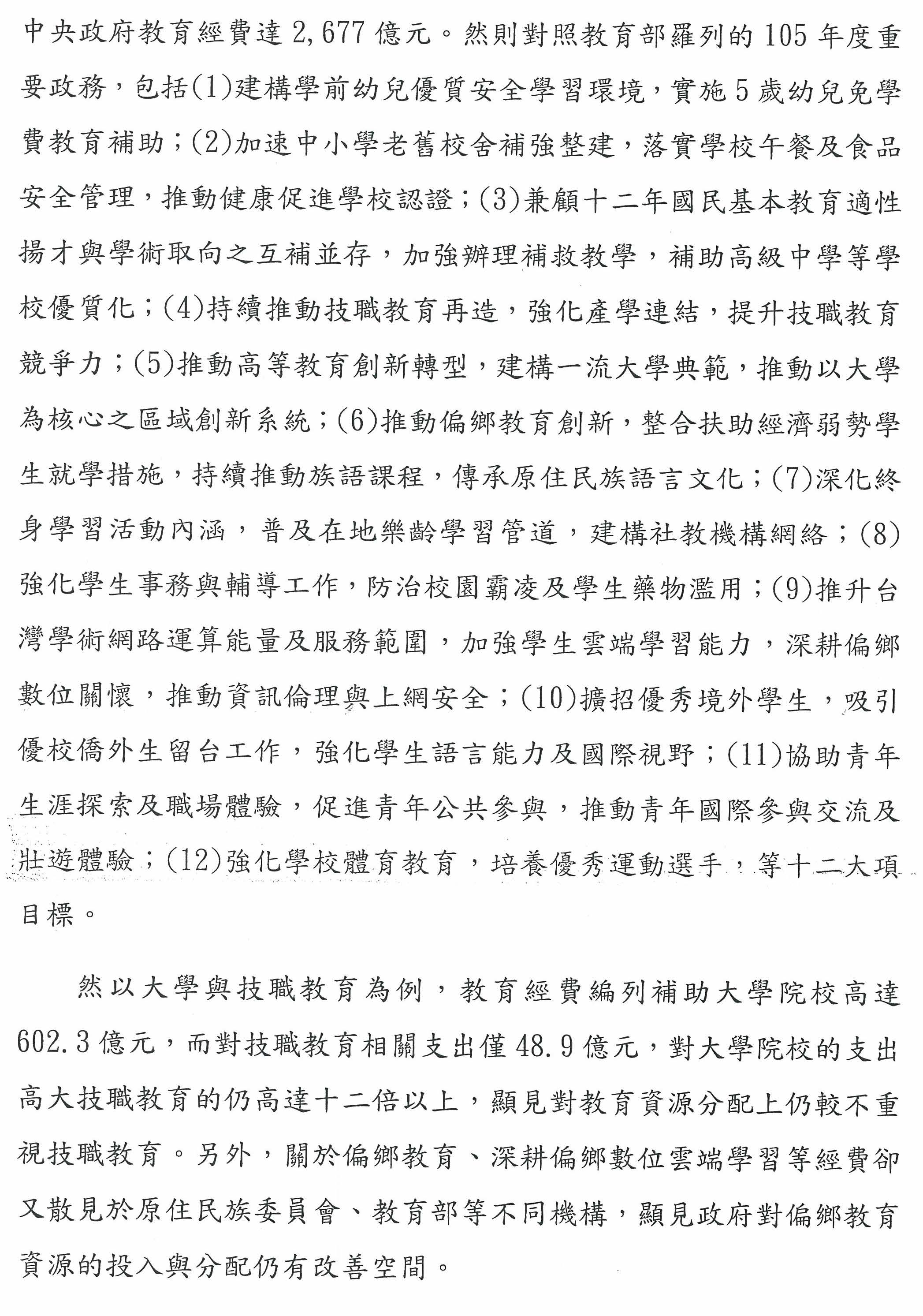 蔣委員乃辛:(15時6分)主席、行政院毛院長、石主計長、張部長、鄧部長、各部會首長、各位同仁。本席詳閱105年度中央政府總預算,發現有關教育及人才培育的問題,根據預算書載明:「人才是國家繁榮的資產;教育是人才培育的搖籃……世界先進國家莫不以教育做為國家長期發展的根基……」我們也看到今年與明年教育經費相較增加87億元,起先我們看到這樣的數據感到高興,還誤以為行政院增列教育經費87億元,但本席詳閱教育經費內容如下:學校退撫經費高達60億元;學生就學貸款利息補貼為20億元;勞工退休準備金為6.5億元;私校公保費用為1點多億元,上述經費總計超過87億元。到底教育經費增加抑或減少?事實上,教育經費的多寡攸關12年國教、頂尖大學、技職改造及弱勢學生補助之發展方向,在在都與人才培育相關,但是,若從預算上所顯現的數據來看,事實並非如同預算書載明著:「世界先進國家莫不以教育做為國家長期發展的根基……」我國並未重視教育經費。既然如此,本席試著將我國與先進國家的教育經費進行比較,我們姑且不論教育金額的多寡,我們先從教育經費的比例來看,事實上,我國教育經費根本比不上先進國家教育經費的比例。我們常常講一句話:「窮不能窮教育;苦不能苦孩子」,行政院能否增列一些教育經費?
