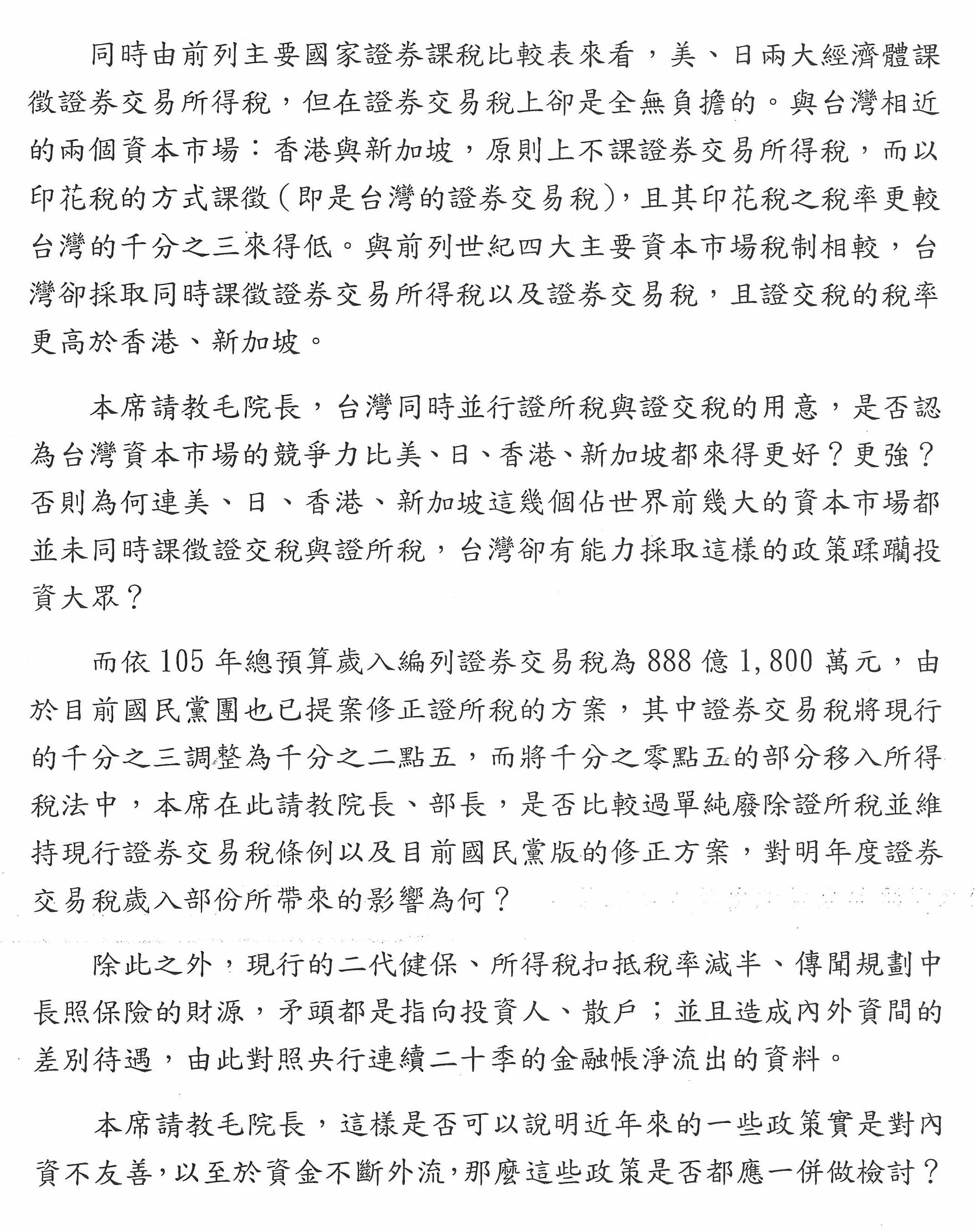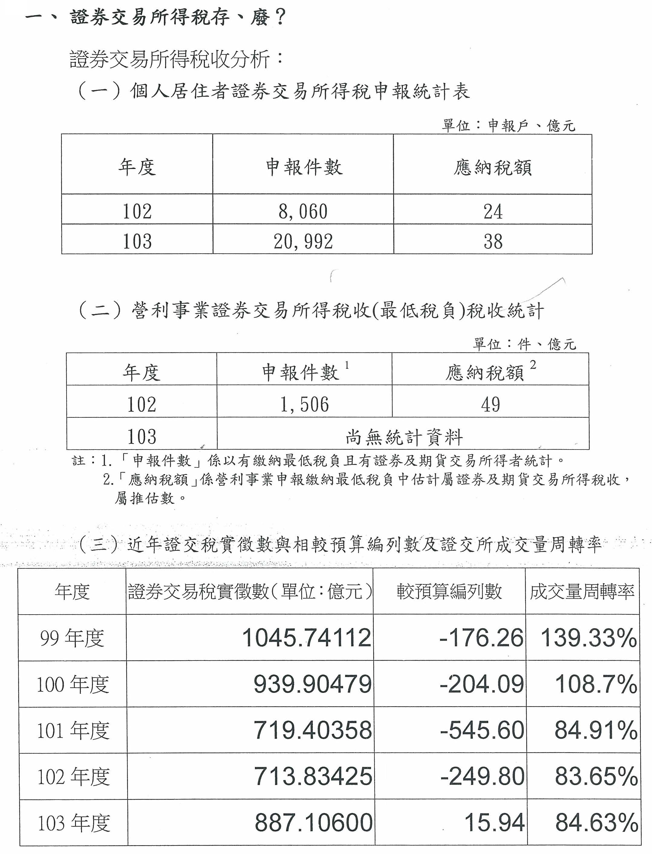 羅委員明才:稅超徵了那麼多,事實上,我們都希望把台灣打造成一個國際的運籌中心,所有的資金可以很大量的回來。我們看了最近的一些報導,覺得有很多部分都是由於稅賦的原因,譬如說證所稅、證交稅,還有很多的問題,像台商有很多的資金,現在有五兆多的海外保留盈餘都想要匯回來。事實上,台灣的股市、台灣的經濟,正面性很多,其體質是好的,只是有很多錢沒有匯回來,所以本席認為是不是可以就證所稅或證交稅做一個調整,最好是把證所稅廢掉,採就源課繳的精神,讓海外很多的資金可以進進出出,這樣很方便,甚至像陸客來台,不要只是買鳳梨酥而已,以後也可以買股票啊!如果這整個帶動起來的話,我想對於台灣的經濟發展會有正向的影響。