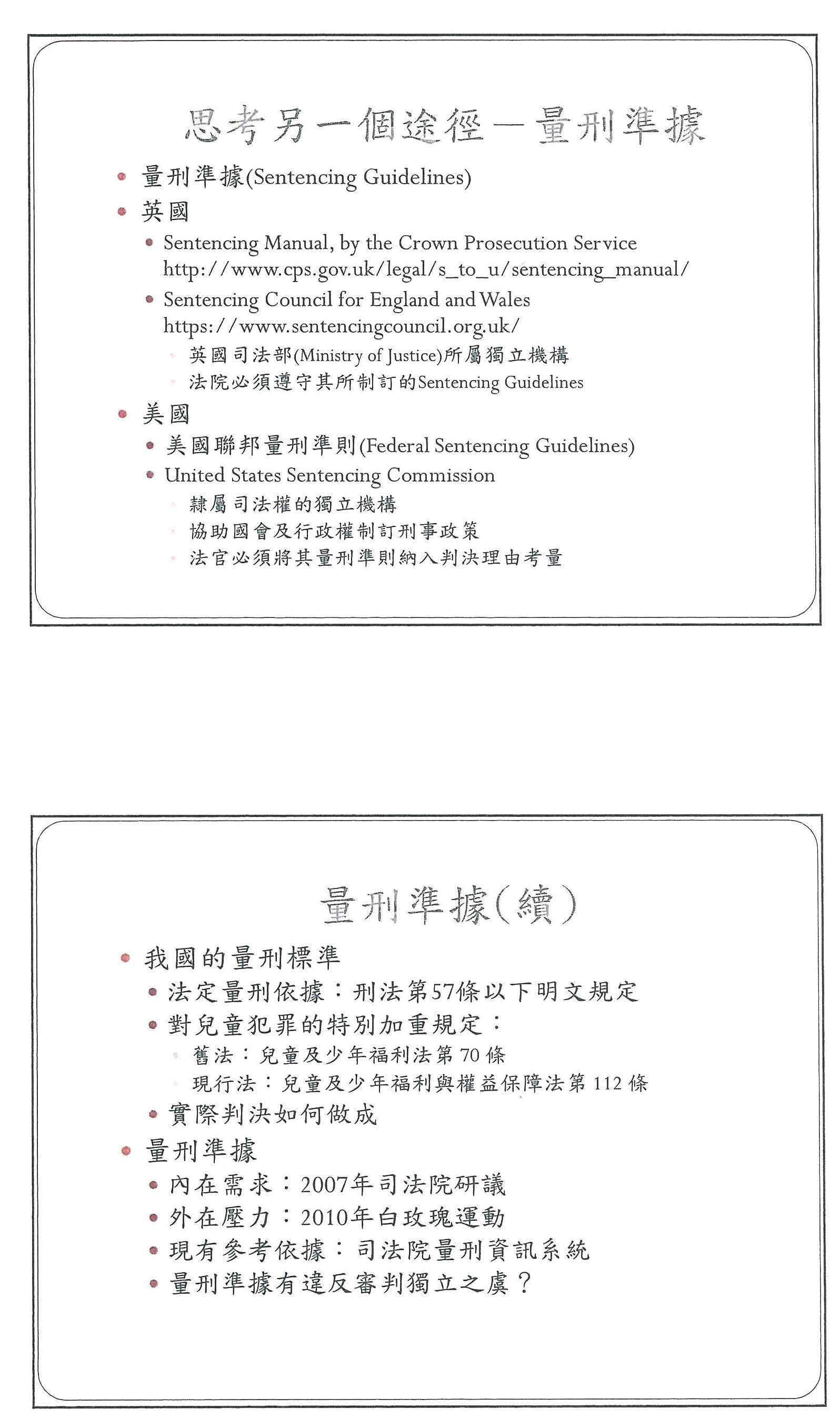 我今天主要想報告的是另外一個比較實際且可能的解決途徑,就是所謂的量刑準據(Sentencing Guidelines)。其實台灣已經討論很久了,在英美各國也都施行很多年了,就英國的情況來講,在Crown Prosecution Service,就是有點類似台灣各地地檢署的司法機關,它其實有一個Sentencing Guidelines的Manual,這個Manual有非常詳盡的說明,在哪種情況之下刑事要如何加重或減輕,特別是配合剛剛提到Criminal Justice Act的新立法,對於各個不同刑事犯罪的態樣有一個附件,並表列各種犯罪態樣的基本刑度,因為我剛剛有提到,他們的新立法是以長期的自由刑為基準。另外針對Schedule 21的殺人部分,在它的Sentencing Manual裡面其實有特別詳列各種情況,簡單講就是類型化到非常非常細,只要符合它上面的特定條件,基本上就可以知道應該要怎樣判刑。另外,他們有一個非常重要的組織叫Sentencing Council for England and Wales,是屬於英國司法部的獨立機構,而且最重要的是,對於Sentencing Council所做的量刑準據,法院有遵守的義務,這部分等一下會跟美國與我國的情況來一併討論。