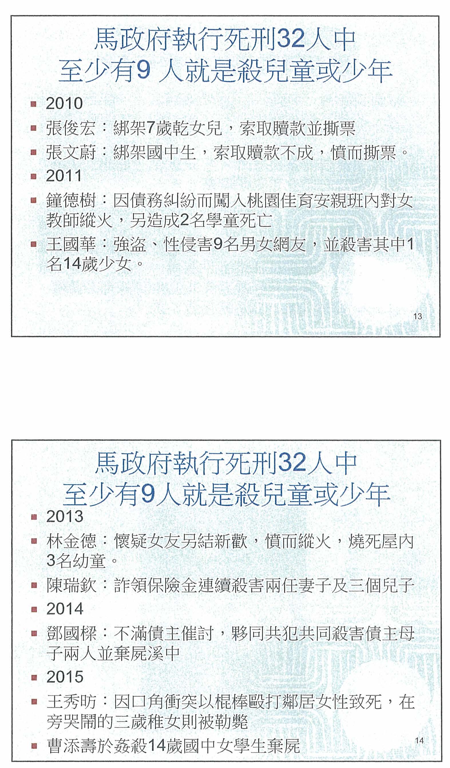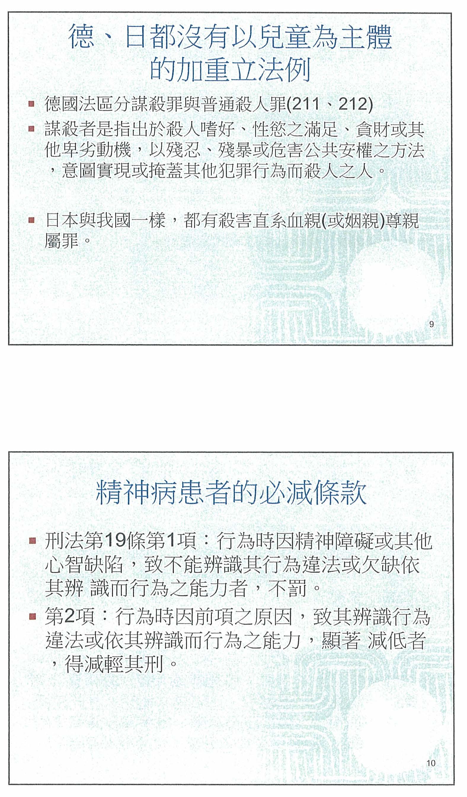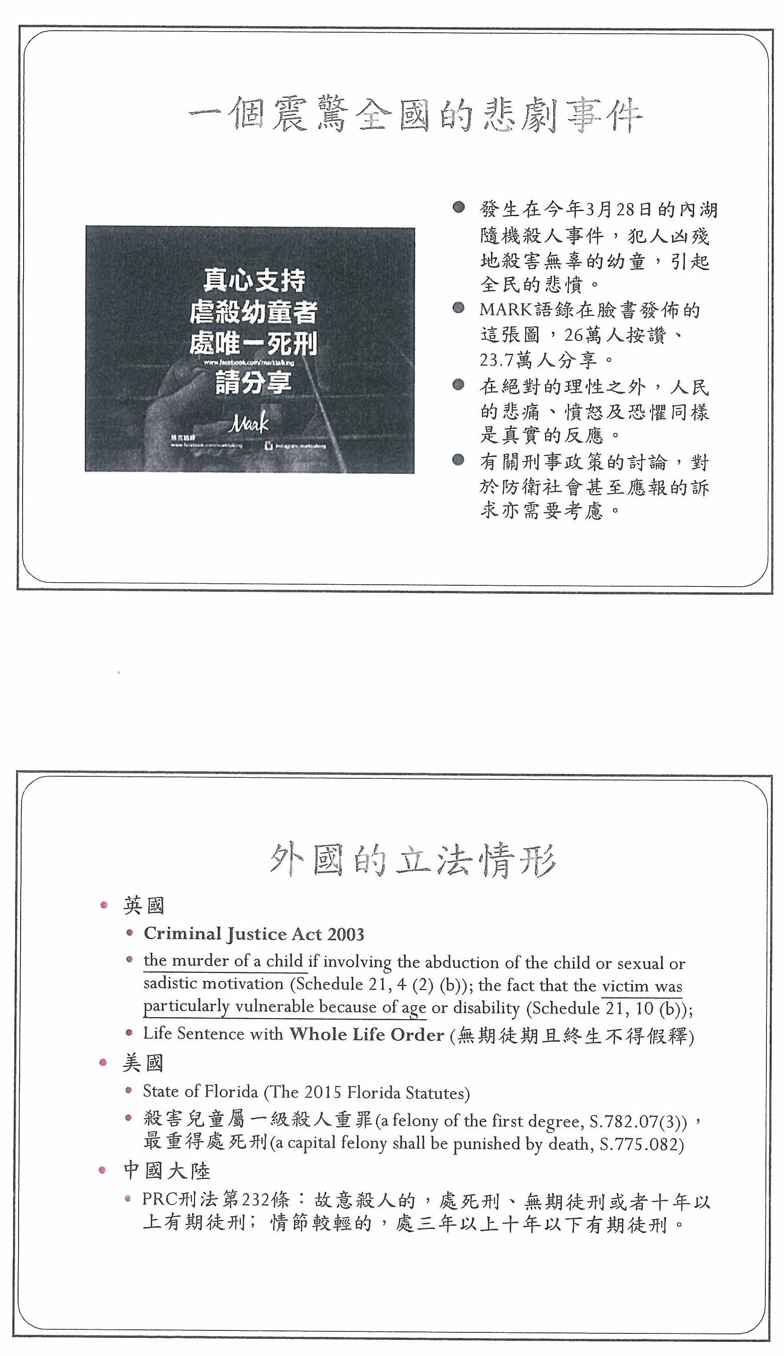 首先是針對殺害幼童的部分,我先簡單列出相關可能的立法,因為我個人是去英國跟美國留學的,所以我主要會從英國跟美國的立法例來說明。英國在2003年的時候,立了一個Criminal Justice Act,因為英國在加入歐盟之後廢除死刑,但是在2003年的新立法,英國又將刑事政策改由長期監禁,特別是以暴力手段殺害幼童的情況,法官最高可以判處到不得假釋的終生監禁,當然這樣後續會產生一些獄政上的問題,剛剛其實刑事政策的專家吳教授已經說明得非常清楚,所以我就不再多提。再來是美國的部分,目前只有佛羅里達州有針對殺害兒童而特別立法,它認為殺害兒童屬於一級謀殺的重罪,所以最高可以判處到死刑。至於大家認為最嚴刑峻法的中國大陸,反而對於殺害幼童這件事情沒有特別立法,但是他們基本的刑法第二百三十二條就已經有規定,對於故意殺人的人,本來就可以判處死刑或無期徒刑的罪責。