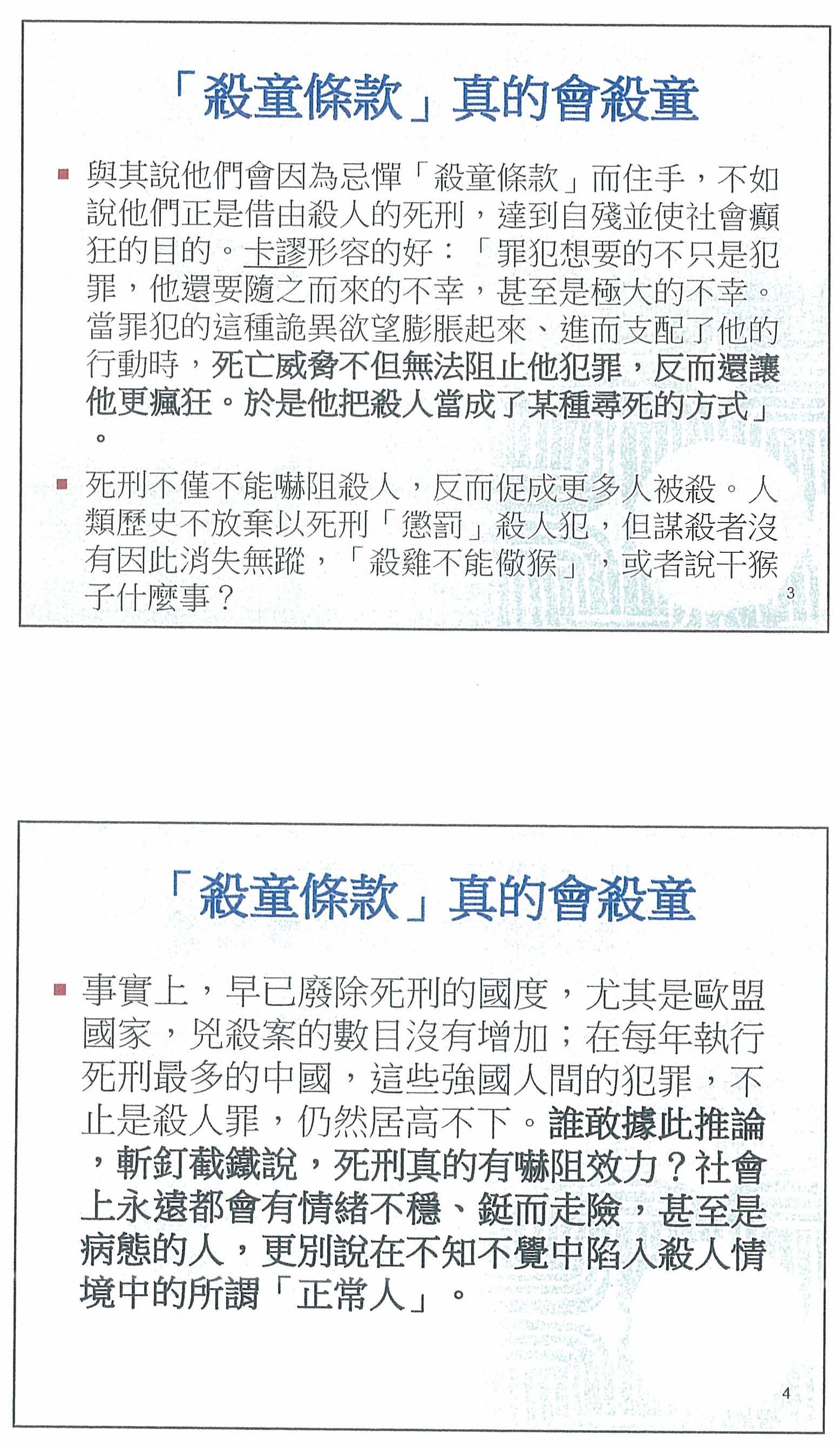 第四,為了保障兒童生命權而加重殺害者的刑罰,但眾人皆知我們已有兒童及少年權益保障法,針對殺害兒童的情況得加重其刑罰,也就是我們在法律上其實已有特別考量這種情況而給予特別的保護,若要再增加刑罰的程度,可能要更慎重地思考。