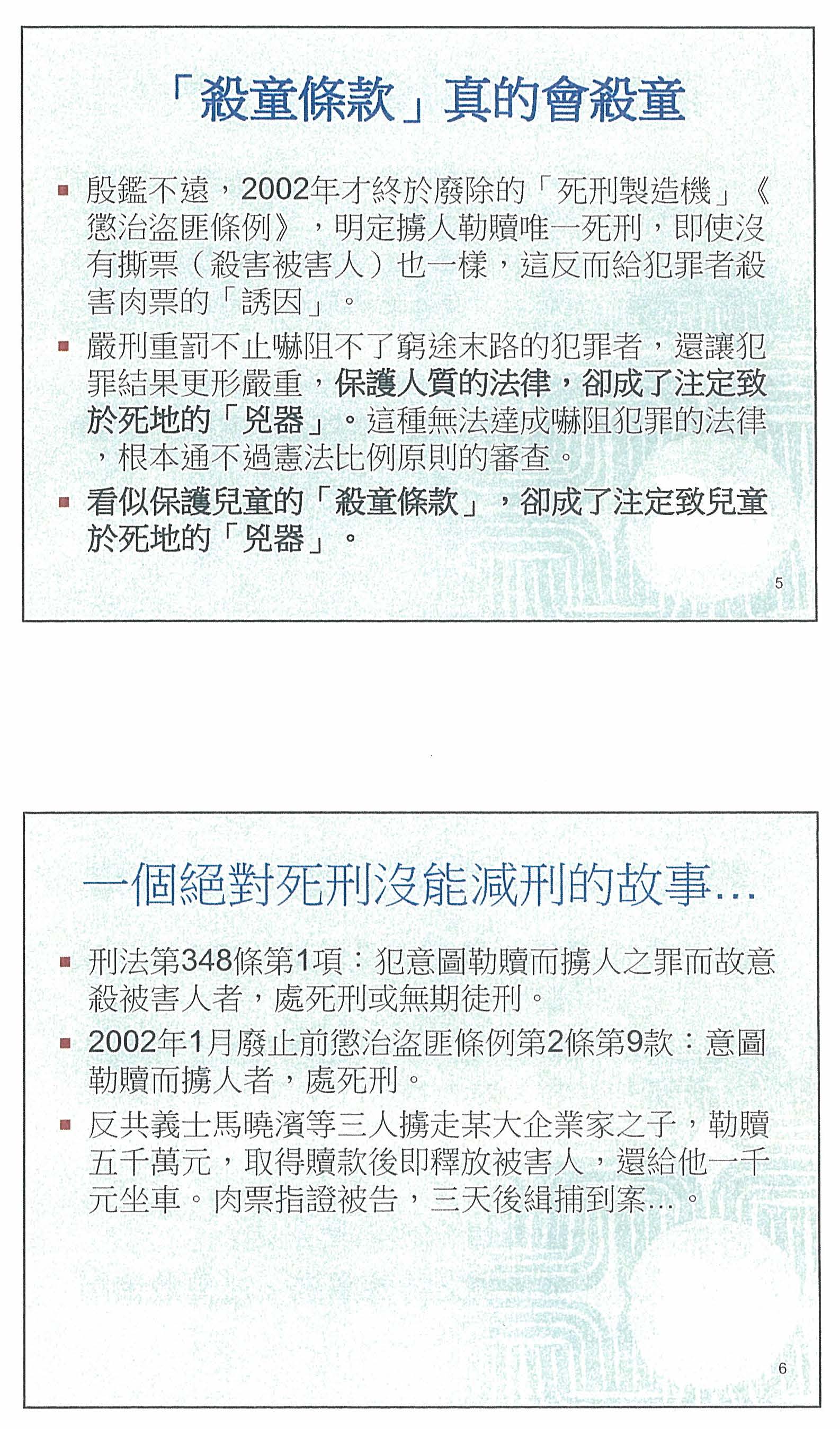 第三,提案的理由舉出聯合國兒童權利公約中對兒童生命權的特別保障概念,但我個人的理解是,兒童權利公約對兒童的定義是18歲以下之人,如果我們的提案是針對12歲以下,或許我們也應該要思考為什麼兒童權利公約所規範的是18歲以下,而我們所提的刑法修正案卻只針對12歲以下的被害人主體?這個概念恐怕並不能完整地保障兒童。另外一個核心的問題是,兒童權利公約是國際上最普世化的人權條約,它總共有174個會員國,幾乎全世界所有的國家都是會員國,因此我們可以思考其他國家如何實踐兒童權利公約,特別是對於兒童生命權的保障。許多專家都提出了一個概念,可是我們到目前為止好像很少聽到一個真正的實例是針對殺死12歲以下兒童而採用必須判死刑或無期徒刑,甚至是終身監禁不得假釋的刑罰。如果這真正是一個可以實踐兒童權利公約的規範,其他國家應該會有這樣實踐的方法。所以,我覺得應從核心去思考所謂對兒童生命權的保障,這當然代表某種國家的義務,國家的義務最主要是在前端必須讓兒童不發生被剝奪生命的情況,跟對於一個殺害兒童的人,你後來對他如何處以刑罰,我認為是兩件事情,我們必須要衡量,最重要的是在保障兒童的生命不要被剝奪。