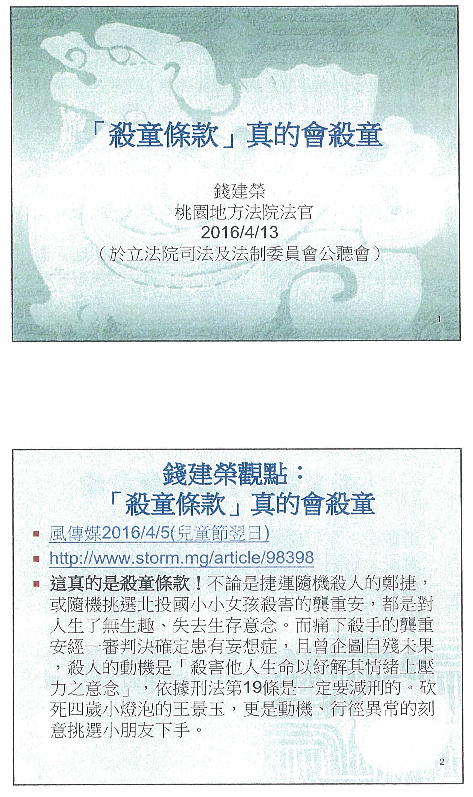 蔡昆洲律師:主席、各位委員。首先跟大家介紹一下我的背景,大家可以看到我的學經歷,我完全是一個商務律師的類型,我相信今天來這邊的絕大多數都是刑事法跟公法的專家,當時我收到國會邀請的時候,也有思考過為什麼會邀請我來講這個題目。相較於大部分從事刑事案件的律師而言,他們會覺得商務律師可能是少數會支持死刑的法律人。另外還有一件事情,就是當初我可能是極少數在臉書上有公開轉貼這張圖的律師之一。為什麼我要把這張圖在國會現場再秀一次呢?我想今天我們之所以會在這邊討論是否要增訂殺害幼童的條文,不可否認就是因為有一個具體的社會事件發生。