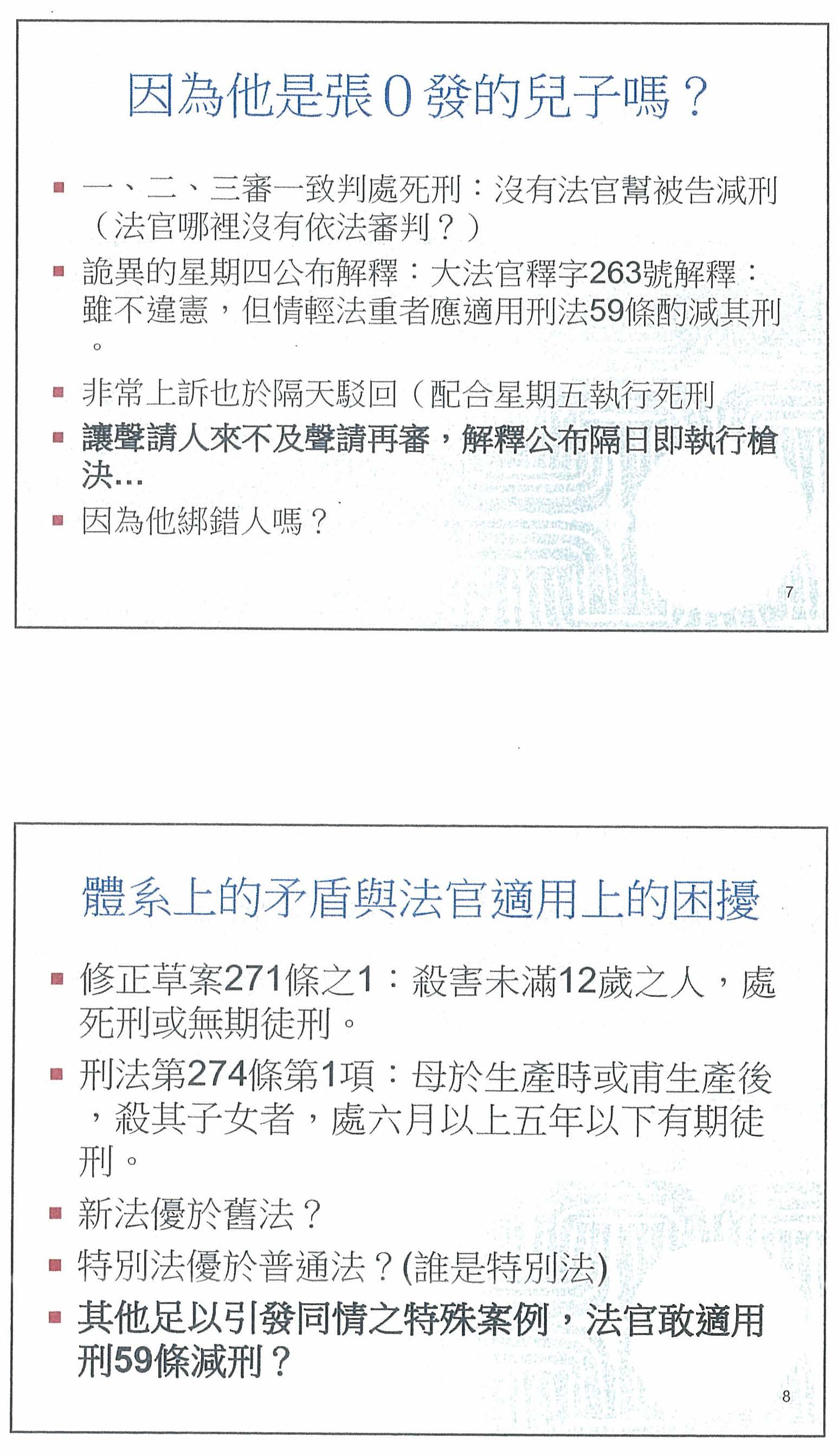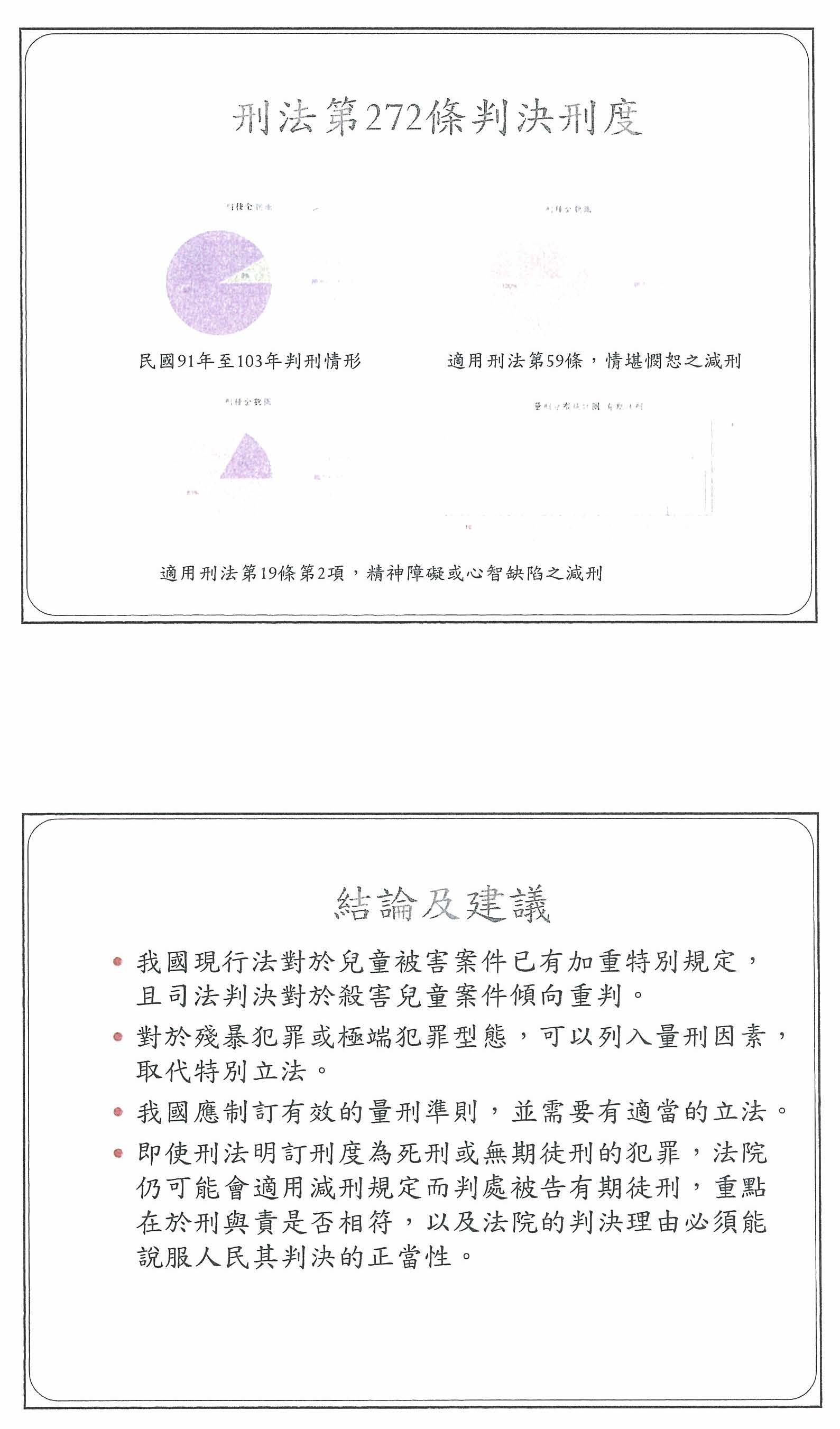 我們再來看一下隔壁鄰近的日本,很多人說如果我們制定了這樣的法律,台灣就會變成不文明。請問,日本有不文明嗎?在今年的3月25日日本法務省又執行了兩名死刑犯的死刑,其中一名就是殺害9歲女童的死刑犯。我請問各位,近幾年來台灣有執行過任何一件關於殺害幼童的死刑案件嗎?我們的司法體系有作過任何判決嗎?從來沒有。所以,當然不會執行。大家說我們的法律已經夠用了,我們的兒少法規定加重其刑,所以不需要。我要請各位看看實務上我們用了沒?如果都有達到,很好!表示我們的法律已經夠用。剛剛也有人說是執行面的問題,說得太好了!正是執行面的問題。刑法第二百七十一條已經有定了,為什麼就是判不上去?理由何在?問題在哪裡,我們看到了嗎?就是因為我們的實務面沒有做到執行嘛!我很感謝剛剛有專家學者提出很好的意見,比如說,量刑系統,這是非常有正面、積極意義的。如果在目前法律尚未修訂的情況下,可以去把量刑系統做好,讓大家知道我們國家的法律對於殺害兒童或傷害兒童,就是要加重其刑二分之一。我們的刑法第二百七十一條到現在都沒有廢除死刑,就是有死刑可以用這樣子的情況。我覺得,這個就是一個很正面的建議。我們可以採用這樣的模式,怎麼樣讓我們的司法判決更符合孩子的公平、正義。我覺得,在這一點上面大家是可以討論的。法務部也提出來,如果真的要修法,刑法第二百七十二條已經規定殺直系血親尊親屬者,就是處死刑或無期徒刑。我們今天提出來的修法意見,只是比照第二百七十二條的法意而已。剛剛有一位法官說,殺害直系血親尊親屬與殺害兒童哪一個罪重?他認為是殺害直系血親尊親屬。我想,這件事情還有待社會來討論。不一定是這個答案,為什麼?殺害直系血親尊親屬可能是成人之間的謀殺,有恩怨。今天我們社會為什麼對於殺害一個手無寸鐵的孩子的憤怒是如此的巨大?家庭之間的悲劇還不見得引發社會這麼大的抗議,就是因為他傷害的是一個沒有能力保護自己的人,這完全違反了一般人對於正義的看法,傷害了人民的情感。所以,如果要討論殺害直系血親尊親屬與殺害幼童哪一個在法律上應該要接受更嚴重的懲罰,我覺得這個問題是大家可以討論的。但是,我必須告訴大家,從聯合國兒童權利公約到我們國內兒少法的精神,大家在講的都是你一個大人去殺害一個未成年的、手無寸鐵的兒童,就是大家無法接受的,就是應該要加重其刑的、就是應該要去懲罰的。我想,這樣一個根本的道理走到世界其實都會是通的。所以在很多事情上,傷害孩子的事情是要特別規定的,聯合國要特別去訂定兒童權利公約,為什麼?在很多戰亂危急的時候,為什麼優先顧慮的都是兒童?因為他還沒有長大,需要這個社會的保護啊!所以如果任何人以他為對象,試圖要傷害他,甚至剝奪他的生命,那麼我想這不僅是法律上不允許,很多人在情感上、道德的紅線上,都是無法接受的。