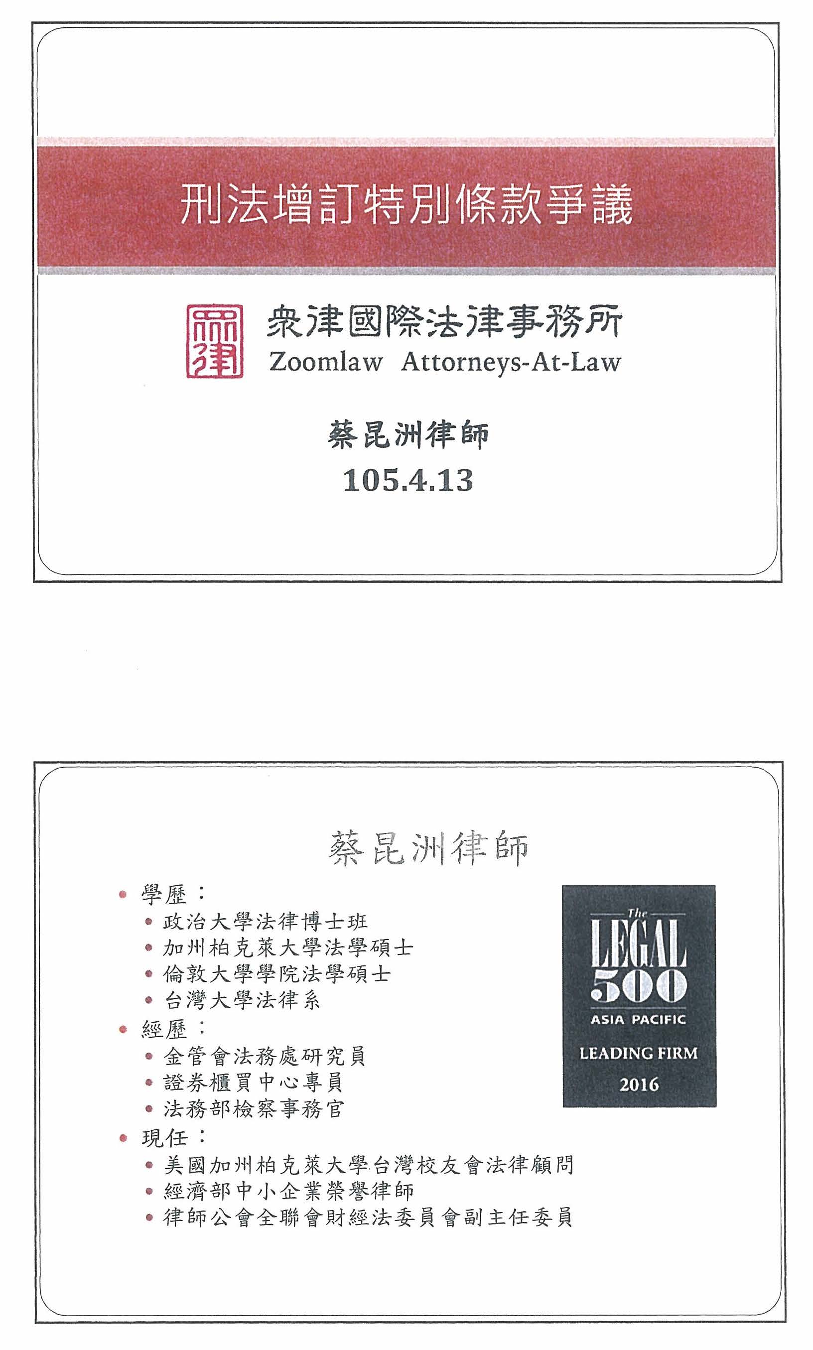 請眾律國際法律事務所蔡昆洲律師發言。