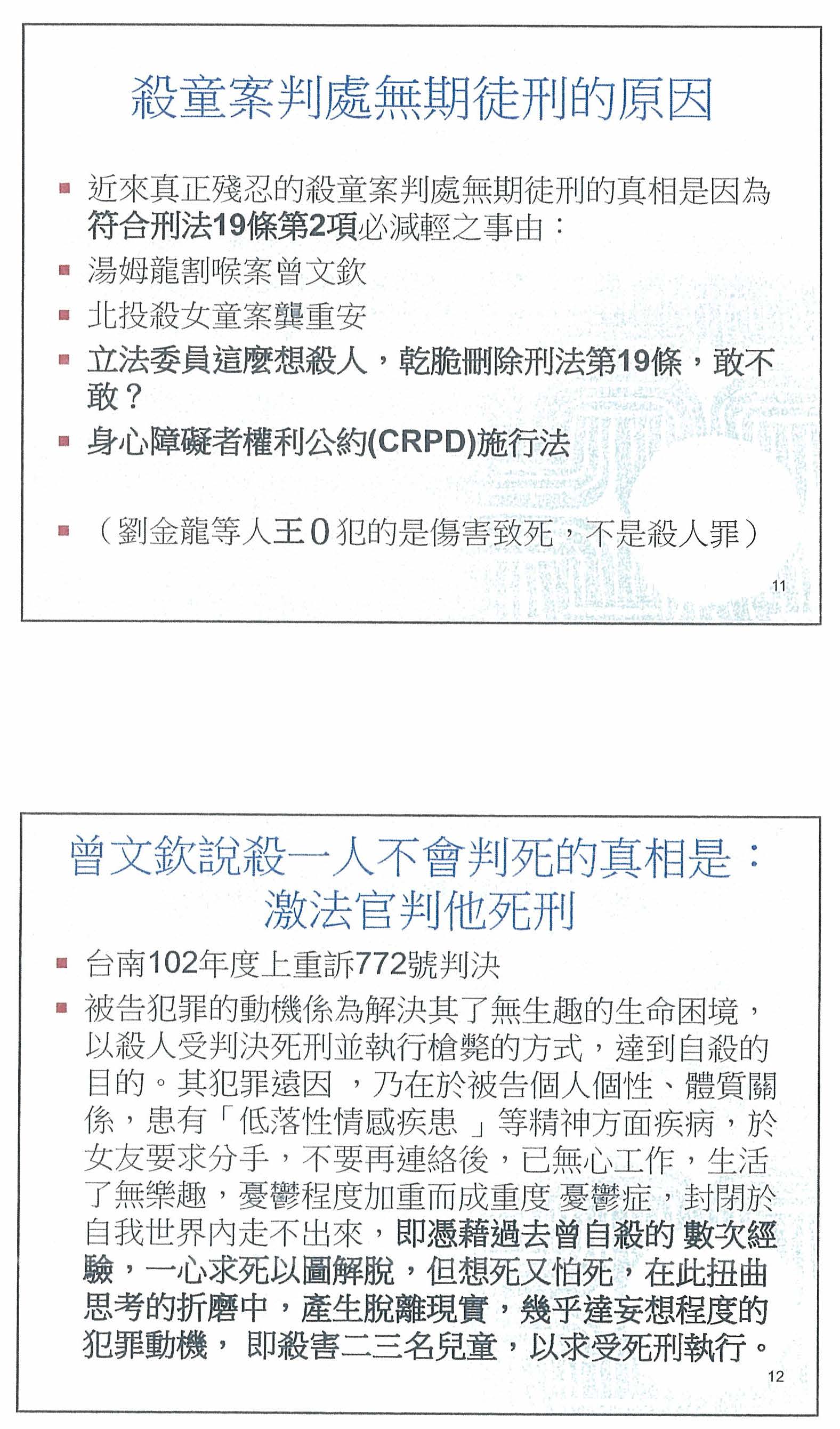 我們最近看到很多殺人罪,大概沒有經過正式鑑定,但看起來很像是精神病患。假設他今天鑑定的結果真的是精神病,符合刑法第十九條那種心神喪失的,那是要判無罪的。如果是精神耗弱,是要減刑。一減刑之後,你想判死刑也都判不了了。也就是說,我們這個社會怎麼可以容許一個精神病患趴趴走?這是社會的恥辱!我們的社區醫療沒有建立,我們沒有公醫制度、沒有公共護士制度,也沒有防護網。當精神病患到處犯案,才需要用死刑來威嚇,這是做不到的!就算只要殺人就唯一死刑,也嚇阻不了精神病患殺人。所以,這個不是刑法的輕重問題,也不是死刑存廢的問題,這個是有待我們社會全面去改善的問題。所以,我的結論就是,這個草案的兩項都不可行,希望立法委員可以撤回提案。法官要不要判死刑,讓法官個案去決定就好了。謝謝各位。