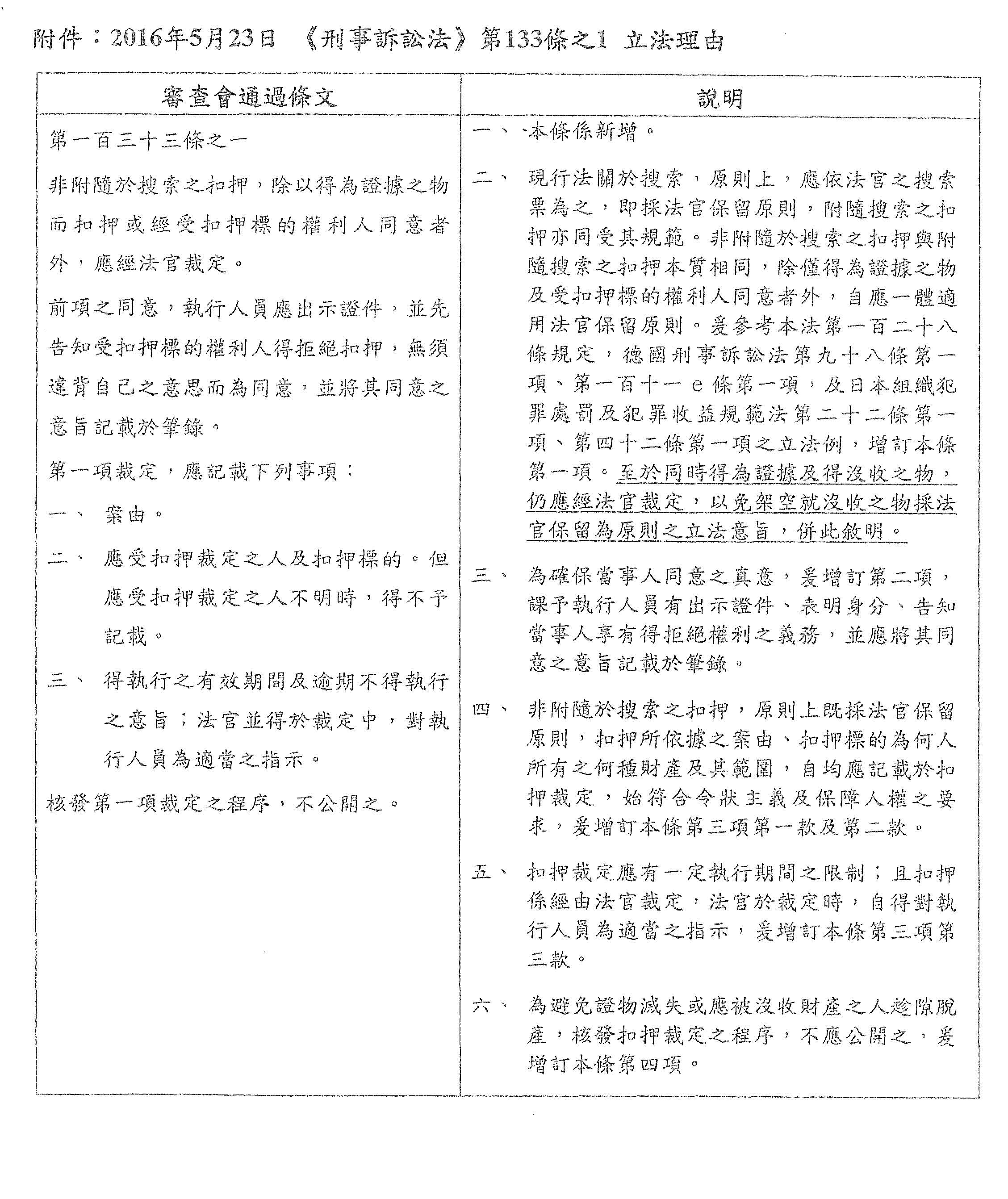 主席:這部分請顧立雄委員代為草擬刑事訴訟法第一百三十三條之一的立法理由,這部分稍後會補充上去。