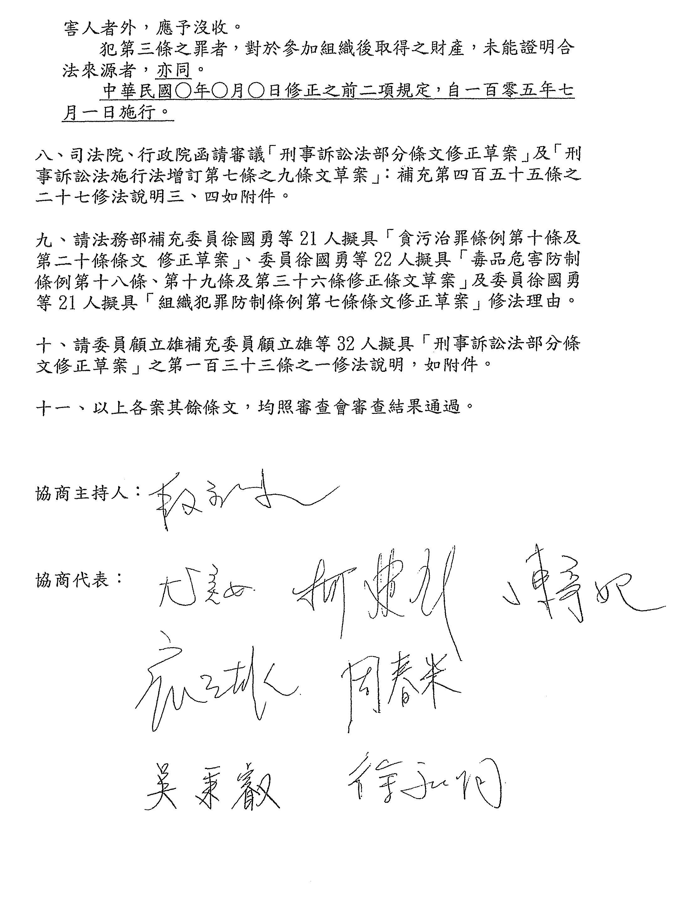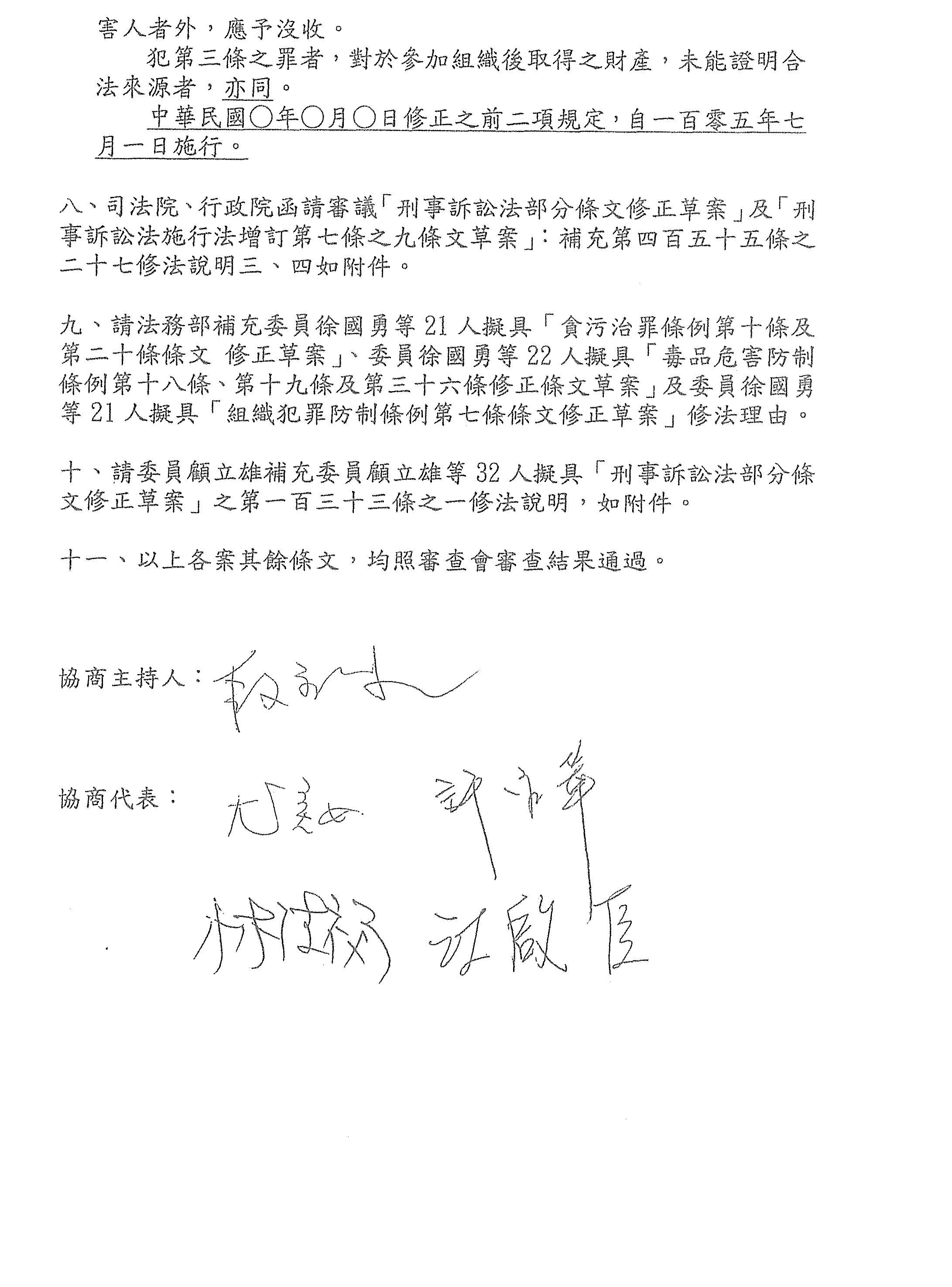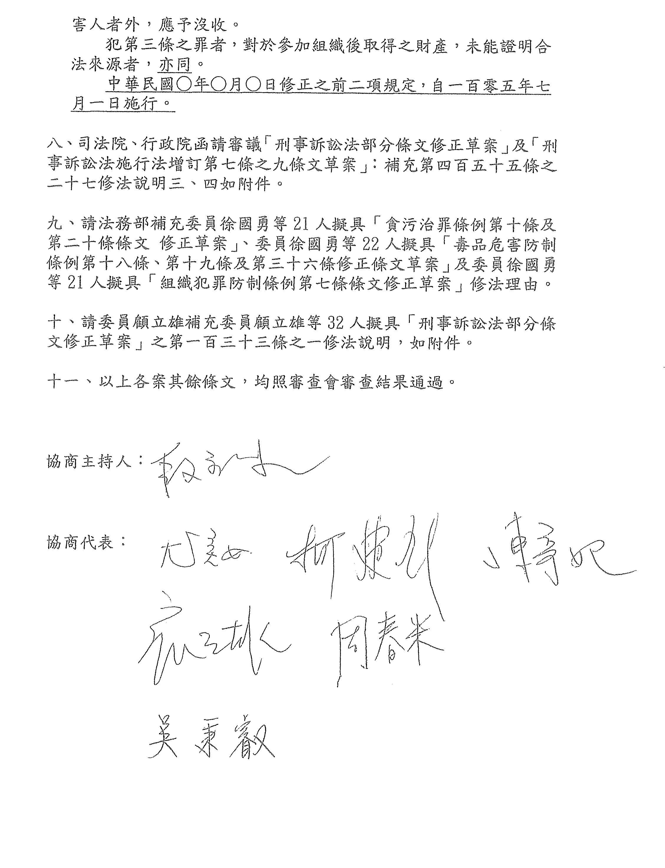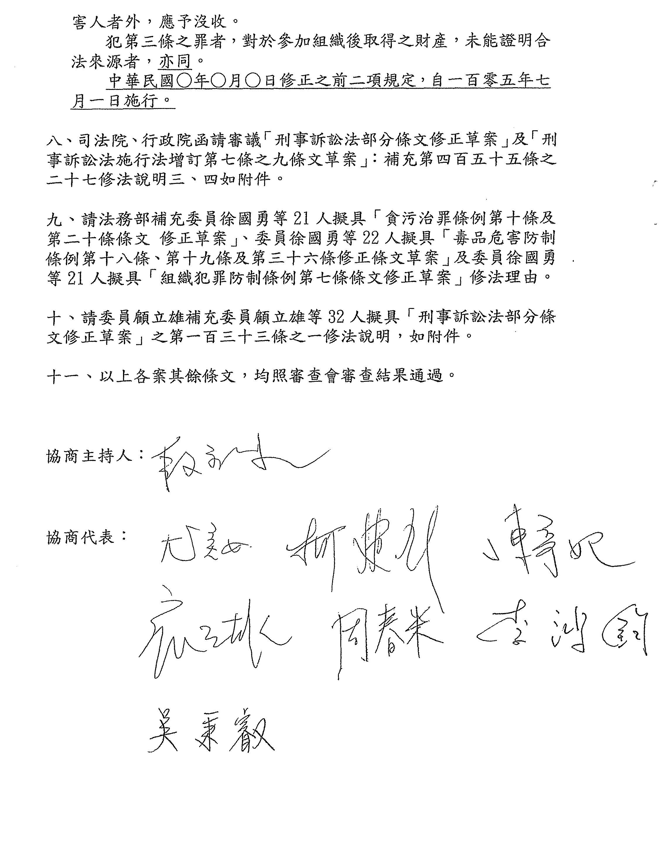 主席:現在繼續開會。方才宣讀的協商結論中,增列第八點:「八、司法院、行政院函請審議『刑事訴訟法部分條文修正草案』及『刑事訴訟法施行法增訂第七條之九條文草案』:補充第四百五十五條之二十七修法說明三、四如附件。」原列第八點改列第九點。
