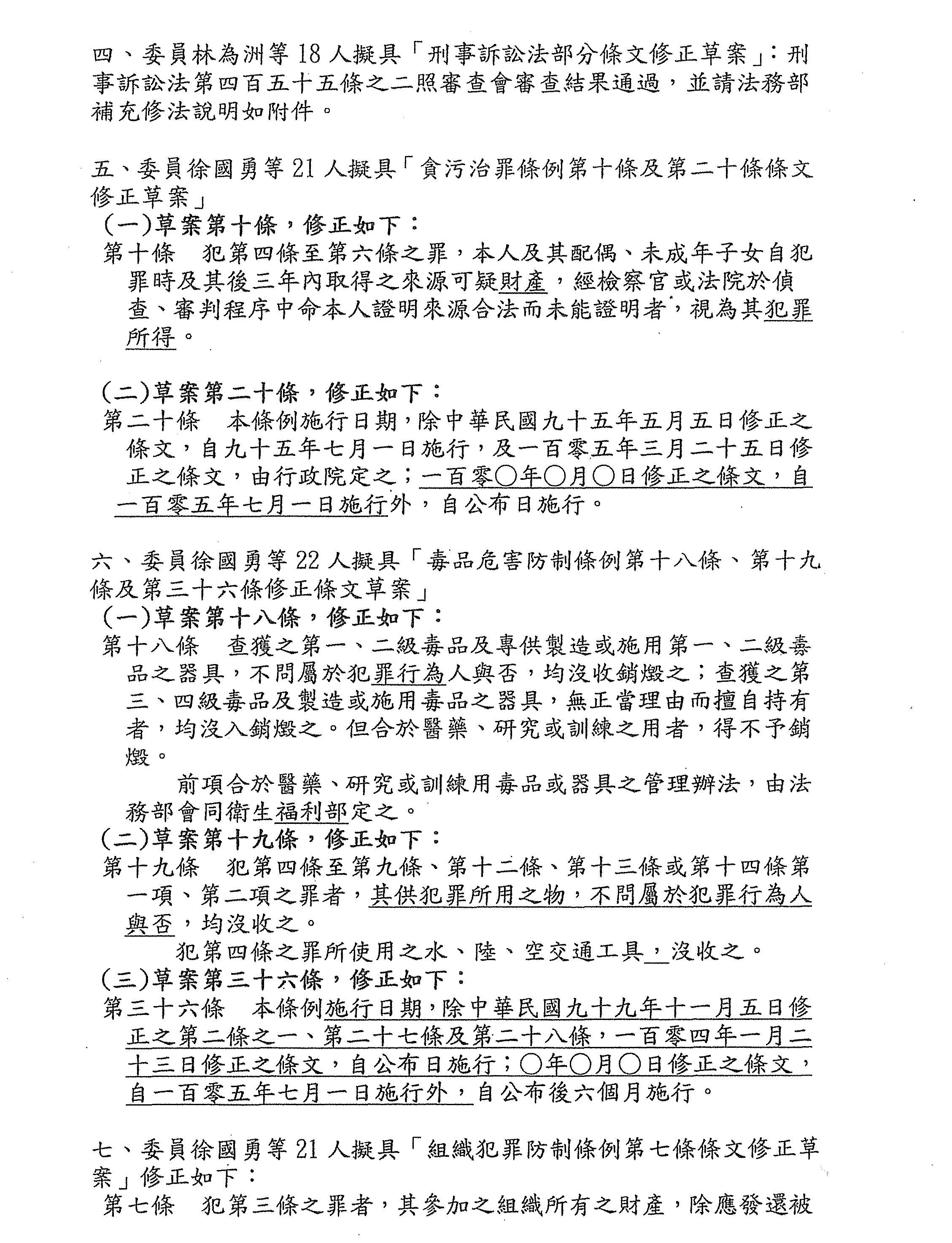 另外,還有委員徐國勇等21人擬具「組織犯罪防制條例第七條條文修正草案」;委員徐國勇等21人擬具「貪污治罪條例第十條及第二十條條文修正草案」;委員徐國勇等22人擬具「毒品危害防制條例第十八條、第十九條及第三十六條條文修正草案」,這部分是在5月20日(上週五)第13次院會決議逕付二讀、交付協商的條文。以上跟大家報告的總共有9案。