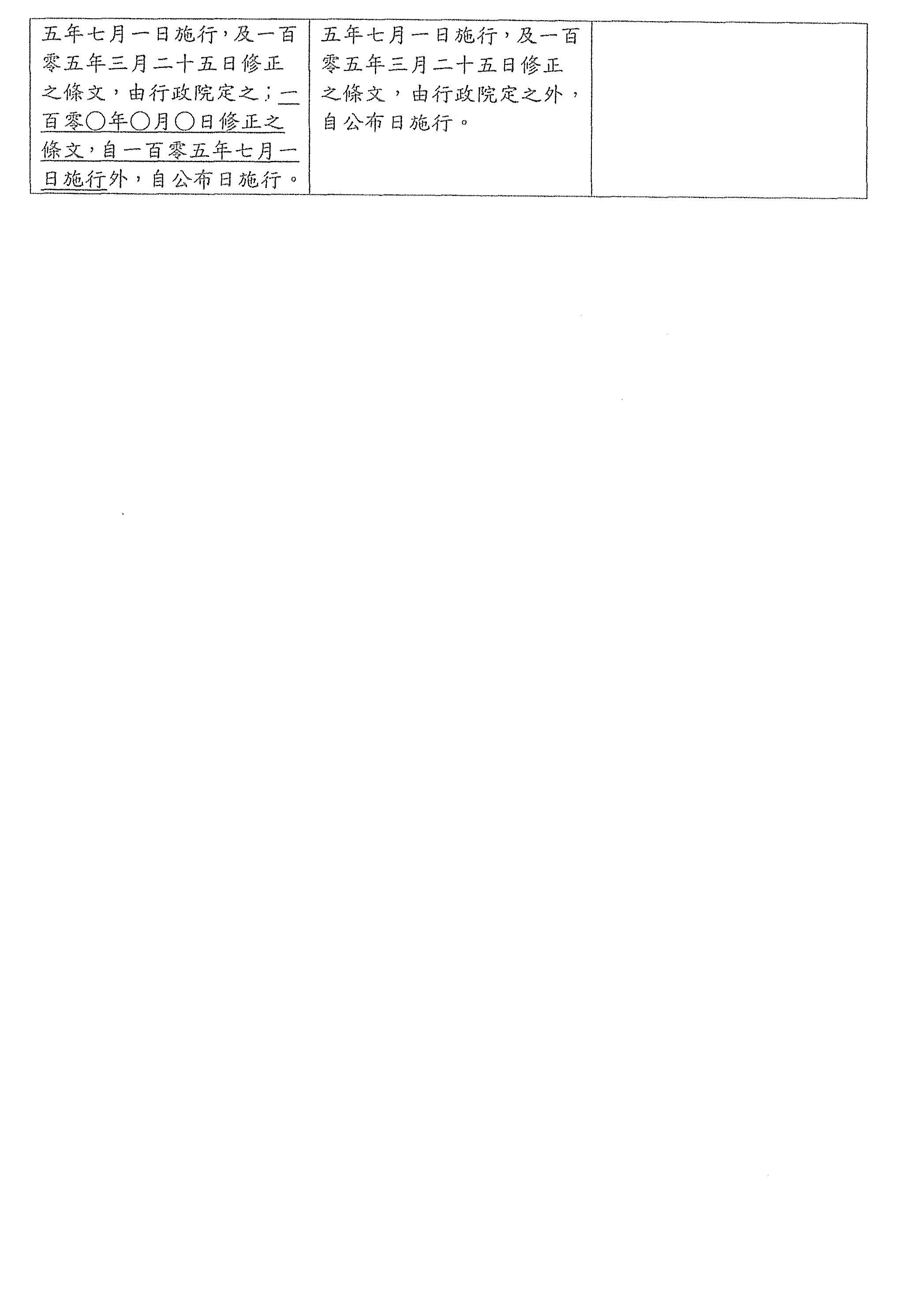 第二十條 本條例施行日期,除中華民國九十五年五月五日修正之條文,自九十五年七月一日施行,及一百零五年三月二十五日修正之條文,由行政院定之;一百零○年○月○日修正之條文,自一百零五年七月一日施行外,自公布日施行。