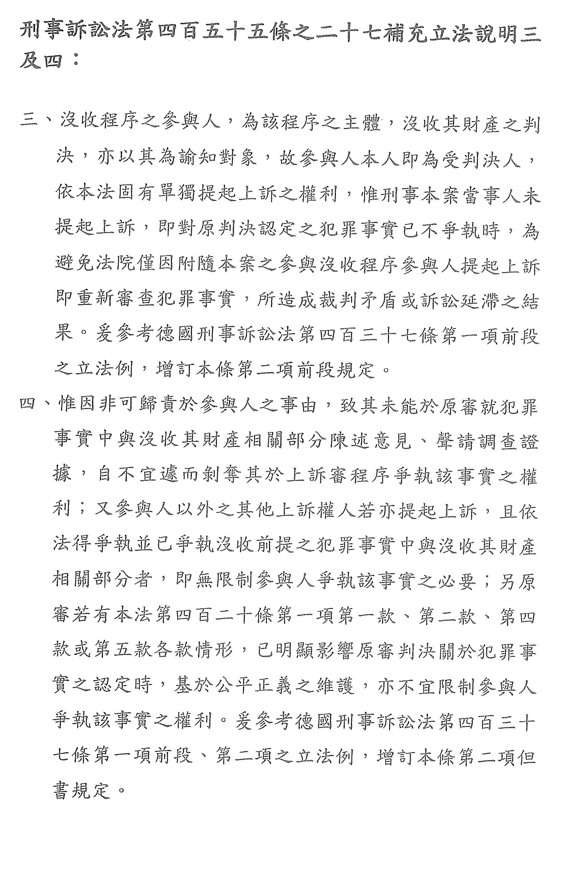 余副司長麗貞:我們參酌德國刑法第七十六條規定,因第七十三條a規定,在規定相關沒收的要件於裁判後始為該當或知悉的話,那麼在特定客體的沒收,如果無法完全執行的時候,可以在事後宣告這些的沒收與狹義的沒收。另外,在英美法的部分……