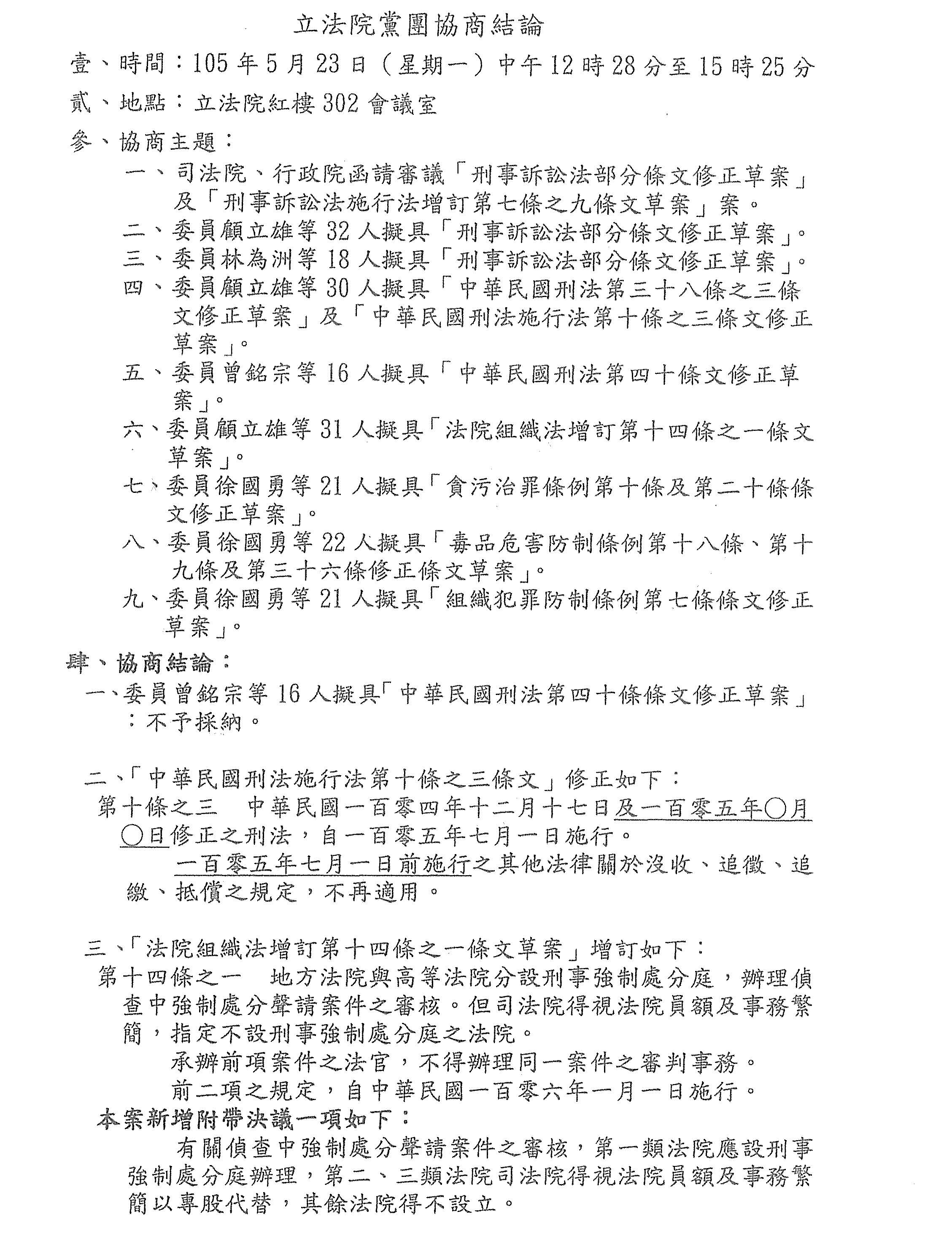協商主題 協商(1)司法院、行政院函請審議「刑事訴訟法部分條文修正草案」及「刑事訴訟法施行法增訂第七條之九條文草案」案(2)委員顧立雄等32人擬具「刑事訴訟法部分條文修正草案」(3)委員林為洲等18人擬具「刑事訴訟法部分條文修正草案」(4)委員顧立雄等30人擬具「中華民國刑法第三十八條之三條文修正草案」及「中華民國刑法施行法第十條之三條文修正草案」(5)委員曾銘宗等16人擬具「中華民國刑法第四十條條文修正草案」(6)委員顧立雄等31人擬具「法院組織法增訂第十四條之一條文草案」(7)委員徐國勇等21人擬具「貪污治罪條例第十條及第二十條條文修正草案」(8)委員徐國勇等22人擬具「毒品危害防制條例第十八條、第十九條及第三十六條修正條文草案」(9)委員徐國勇等21人擬具「組織犯罪防制條例第七條條文修正草案」。