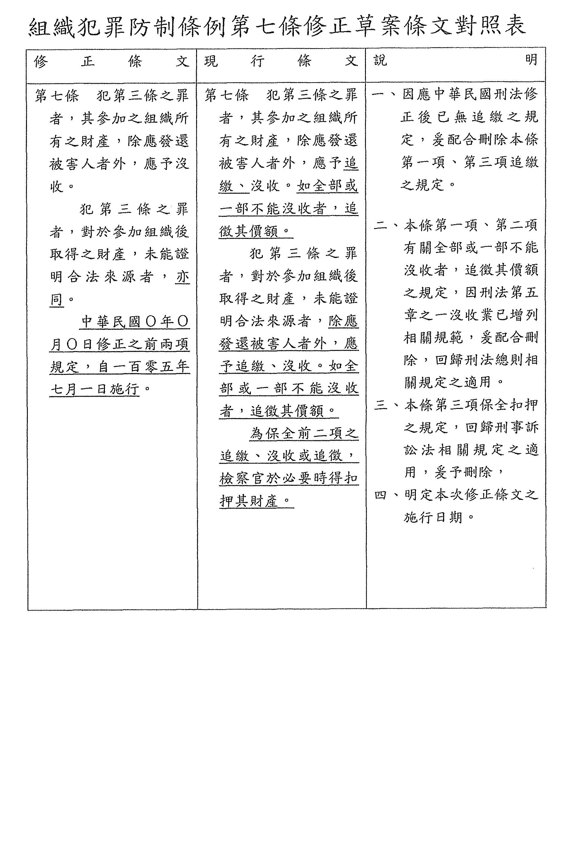 顧委員立雄:第一項有要改嗎?「犯第三條之罪者,其參加之組織所有之財產,除應發還被害人者外,……」,它的意思是說組織啦!組織的財產應予沒收就對了?就是按照現行條文,把「沒收」拿掉,把它的意思留下來就對了?
