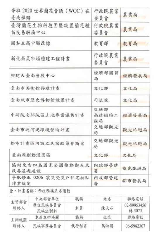 案由:本院委員陳亭妃,有鑑於台南市多項活動暨建設計畫,如「爭取2020世界蘭花會議在台南」、「台灣蘭花生物科技園區設置蘭花種苗交易服務中心」、「國私立高中職改隸」、「新化果菜市場遷建工程」、「興建大台南會展中心」、「台南市美術館興建」、「台南市城市歷史博物館設置」、「中研院南部院區土地專案讓售」、「台南市運河光環境營造」、「都市計畫區內設立民宿政策會商案」、「台南原創動漫園區」、「協助東吉四島國家公園推動觀光及改善基礎建設」、「爭取修正0206震災受災戶住宅補貼作業規定」、「西拉雅族正名運動」等十四項活動計畫,亟需中央政府協處及回復諸案中央各部會之進度,特向行政院提出質詢。