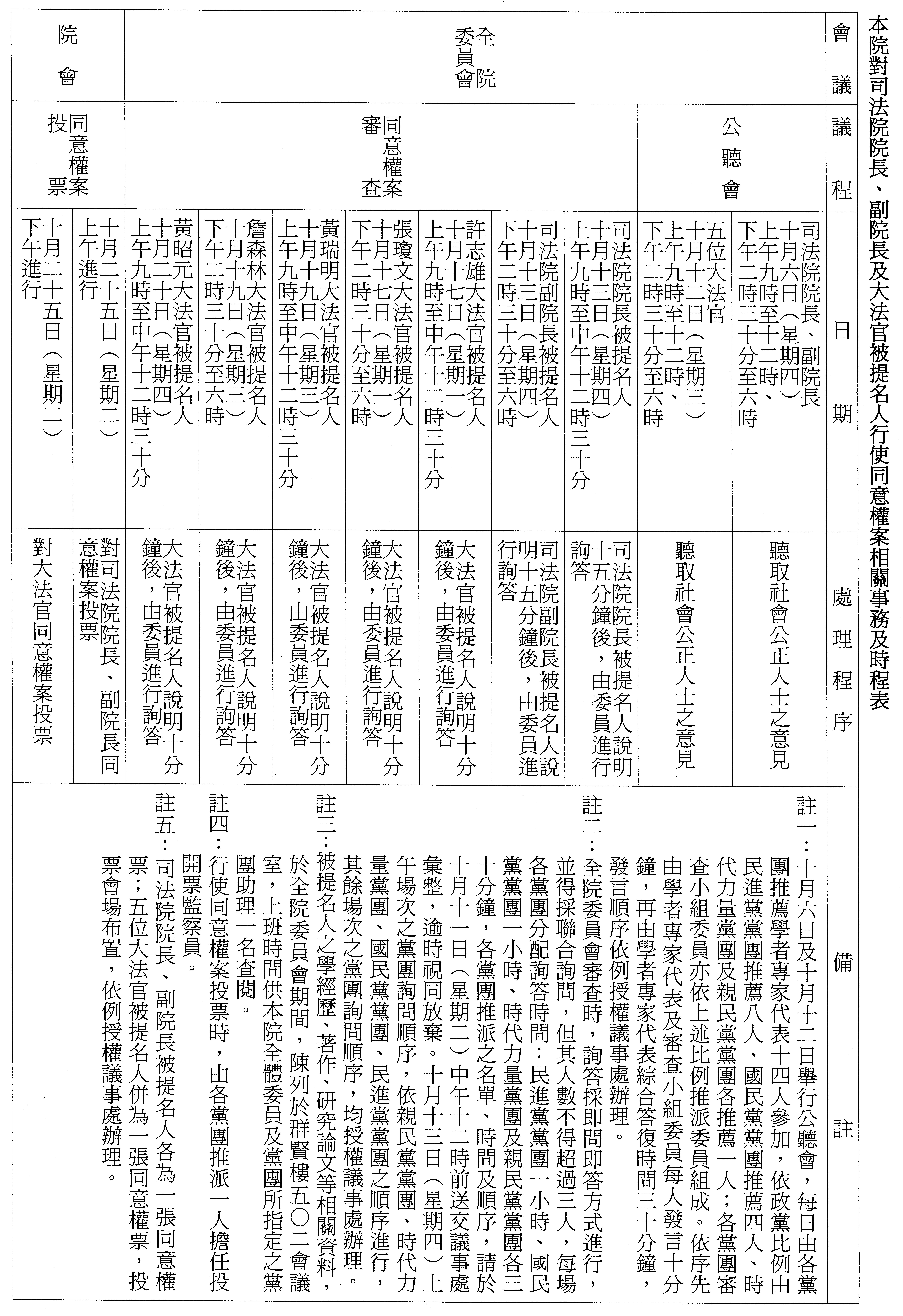 (二)10月13日(星期四)、10月17日(星期一)、10月19日(星期三)及10月20日(星期四)上午進行審查,並視為一次全院委員會,13日上午審查司法院院長被提名人、13日下午審查副院長被提名人,17日、19日及20日上午分別各半日審查5位大法官被提名人,每場各黨團分配詢答時間:民進黨黨團1小時、國民黨黨團1小時、時代力量黨團及親民黨黨團各30分鐘。各黨團推派之名單、時間及順序,請於10月11日(星期二)中午12時前送交議事處彙整,逾時視同放棄。審查完畢後,於10月25日(星期二)院會上午進行司法院院長、副院長同意權案投票表決;下午進行大法官同意權案投票表決,當日不處理臨時提案。(本同意權案相關事務及時程如附表)