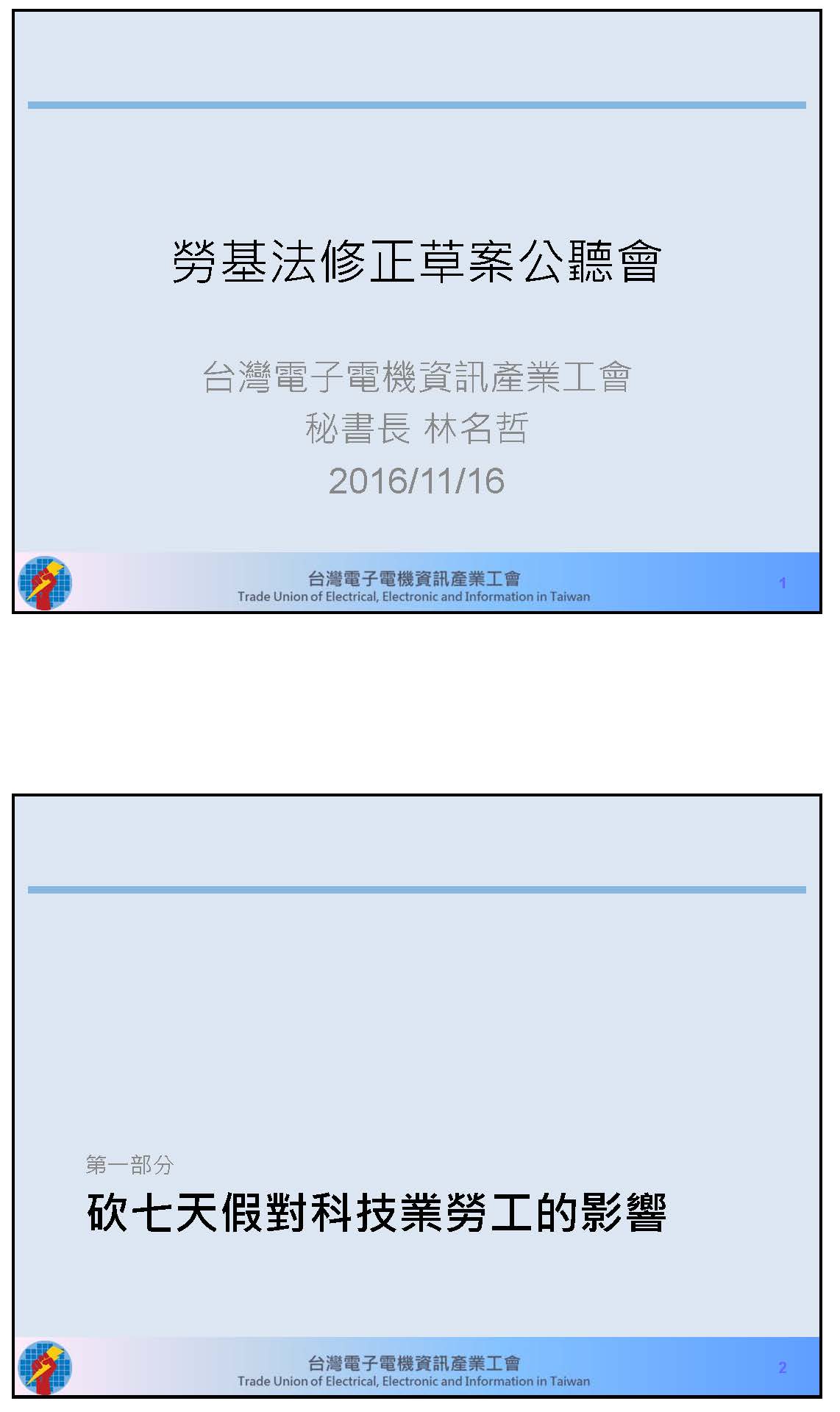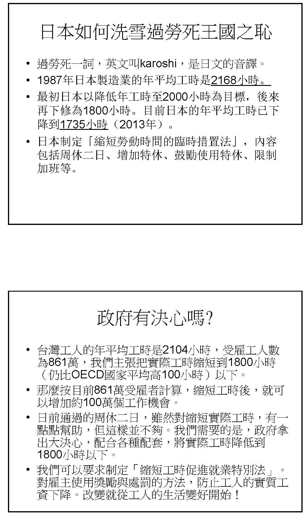 丁穩勝律師:主席、各位委員。姑且不論蔡英文總統的2016年勞工政見相較2012年是有多麼保守和退步,我們也不論蔡英文總統在接見雇主代表時,不小心沒有喝酒也吐露了真言,他認為台灣的勞工休假太多。我們都不要管這些事情,我們就看他2016年的政見,事實上,有一個非常重要的政見就是要降工時,他是想要透過假日,也就是休息日加班的方式,以達到降工時的效果。可是事實上,前面兩位專家學者也都談過,不但不會有任何降工時增加休假的效果,反而會製造反效果,以下是我們的論述。