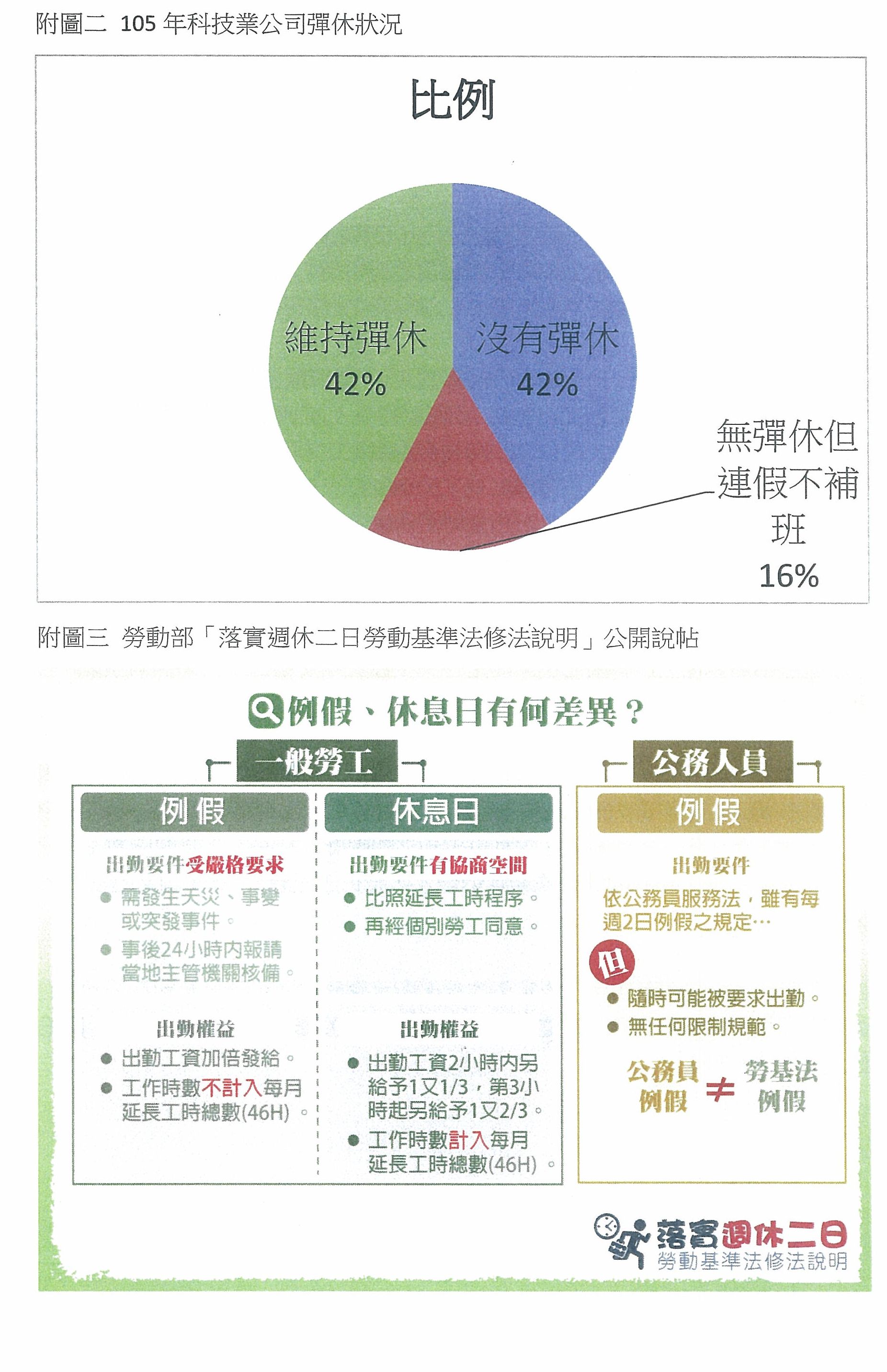 第二點,剛剛郭部長特別提到,其實國內有很多企業已經開始實施週休二日。我們瞭解產業界的需求之後,發現有些規模比較小的事業單位還有服務業,希望有更大的彈性空間。依照勞動部104年職類別的薪資調查,就如郭部長提到的內容,工業部門大概有61%已經實施週休二日。統計數據顯示,事業單位的人數規模越小,未實施週休二日的比例越高;按照我們目前主管的工業部門來看,10人到20人這樣規模的公司未實施週休二日的比率最高。此外,我們也考量到還有不少規模比較小的企業和服務業轉型比較困難,特別像是微型個人營業體的企業,他們由於人手不足,經常面對排班壓力,所以希望能給予他們彈性加班的空間,讓企業的生產和運作可以維持。