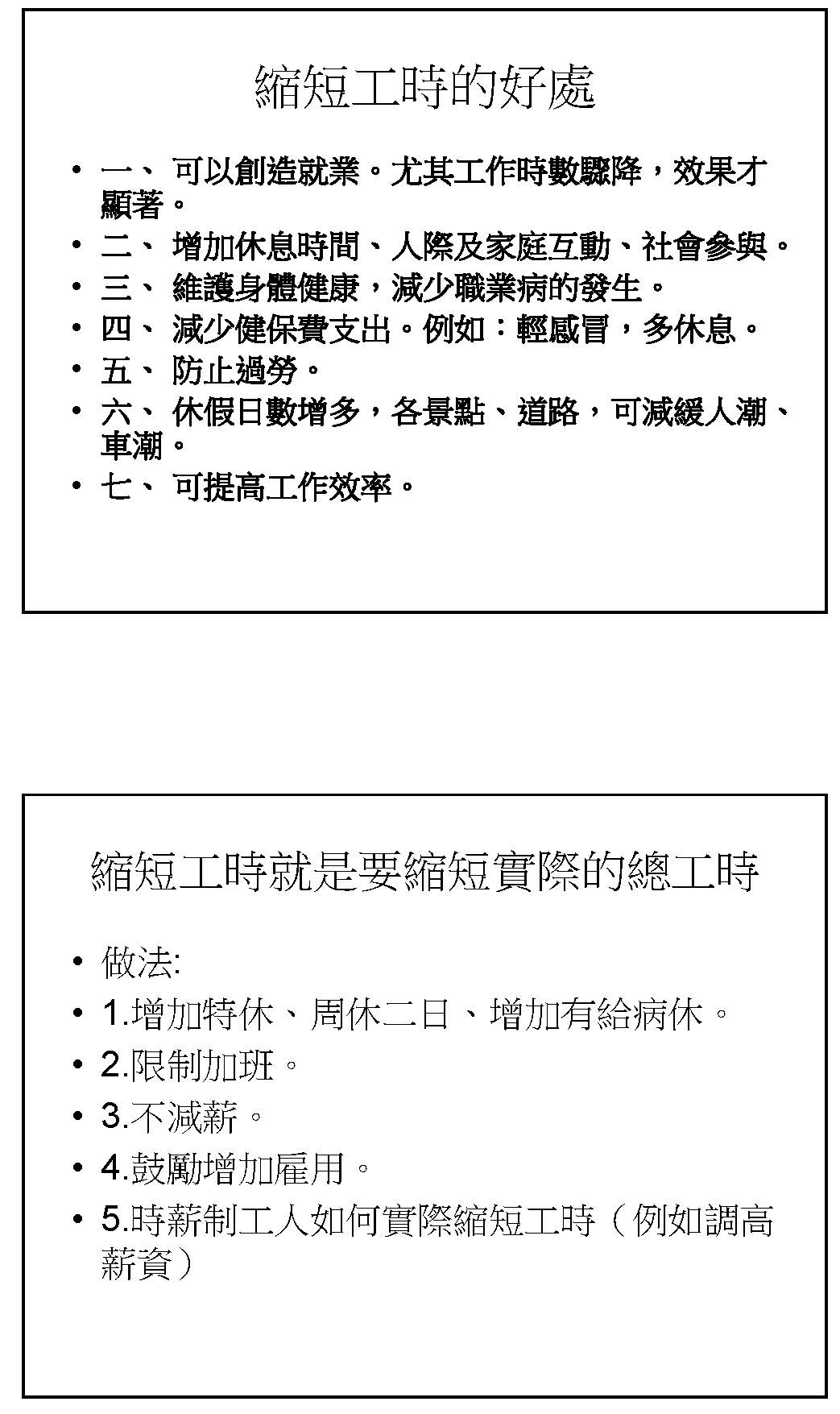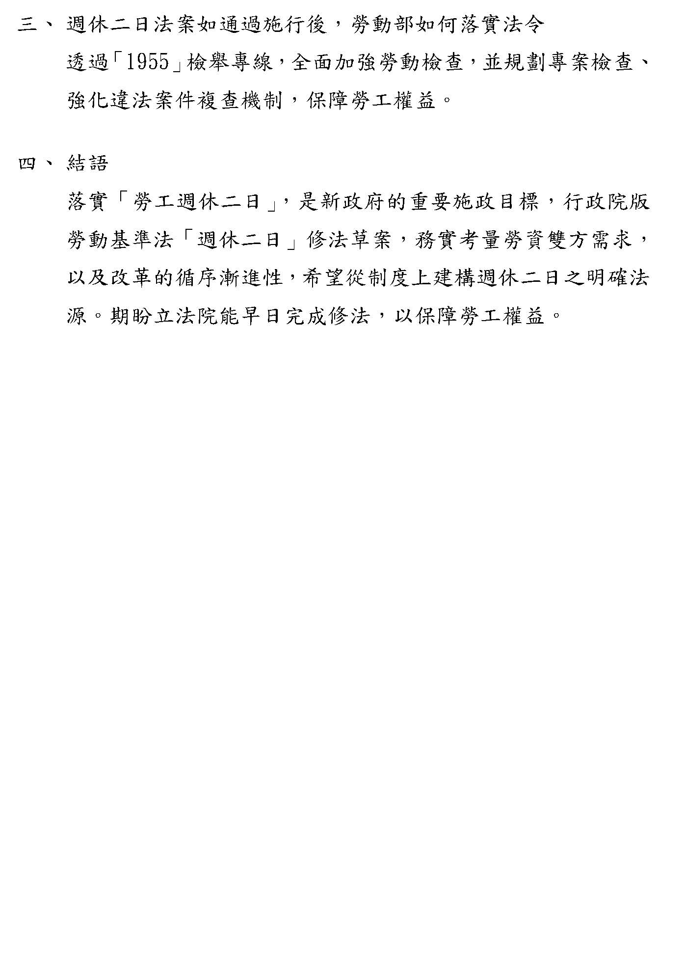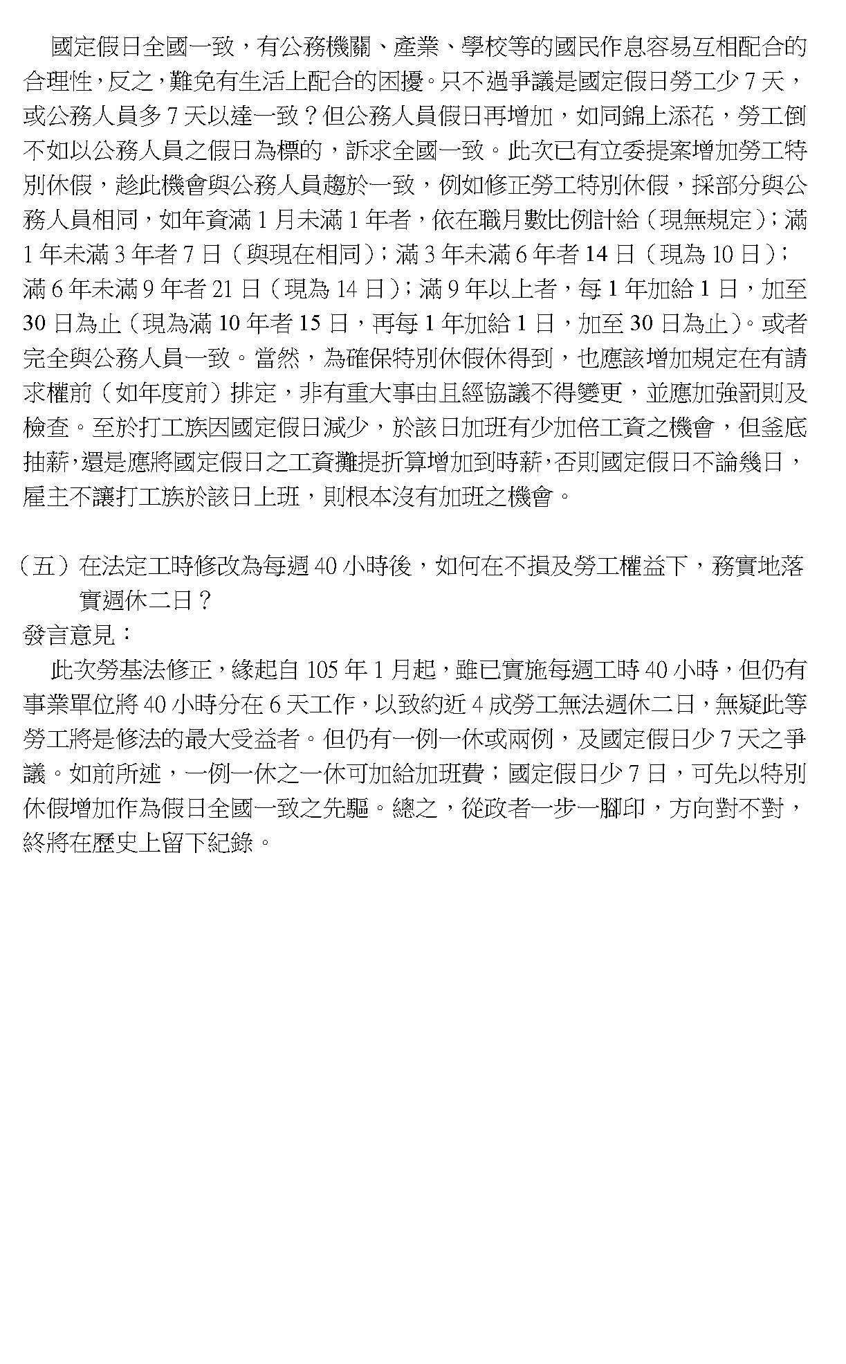 第五,在法定工時改為每週40小時之後,如何在不損及勞工權益之下務實的落實週休二日,我們要告訴執政黨:就是給我兩例、不要囉嗦。以上,謝謝大家。