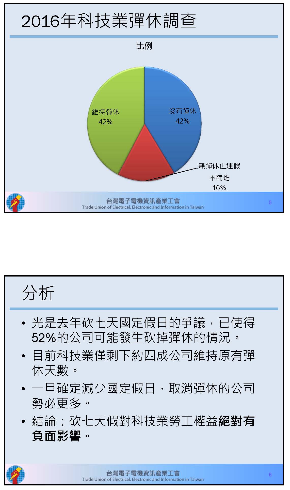 我們工會從去年開始就做了一個統計,去年在前任的陳雄文部長任內,他就說要砍七天假,因此從去年到今年,我簡單只講結論,去年光是砍七天假的風聲就讓很多公司開始把彈休拿掉,而今年我們做的統計大概問了一百多家公司,目前大概只有4成公司仍然維持現有的彈休。跟大家報告,因為我們暫時還有19天國定假日,萬一之後確定砍了七天假,一定會有更多公司把這些彈休全部取消掉,而這個結論很簡單,砍七天假對科技業勞工絕對是負面的影響。