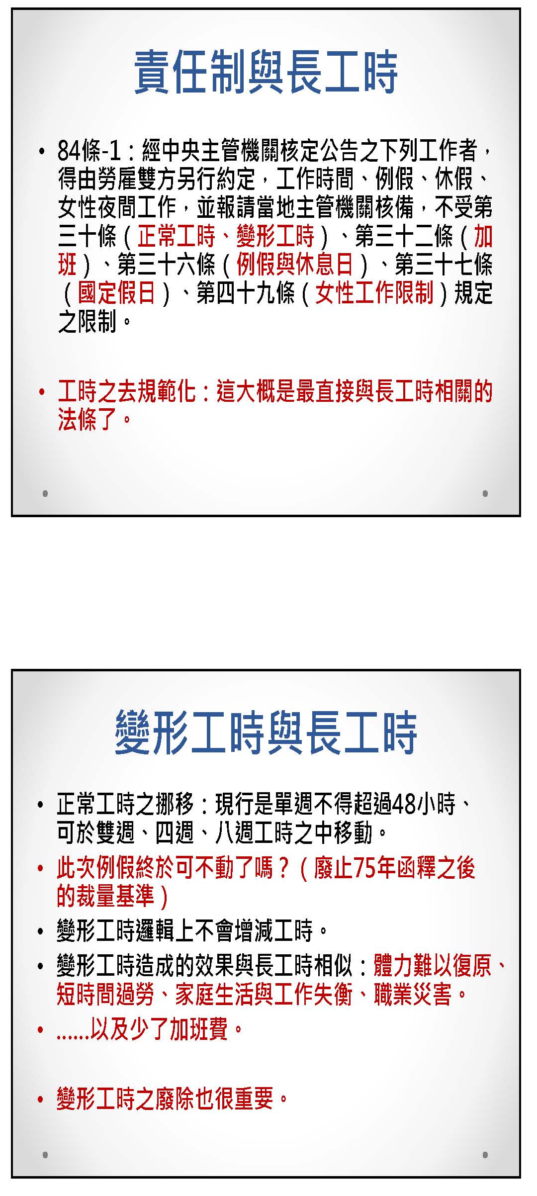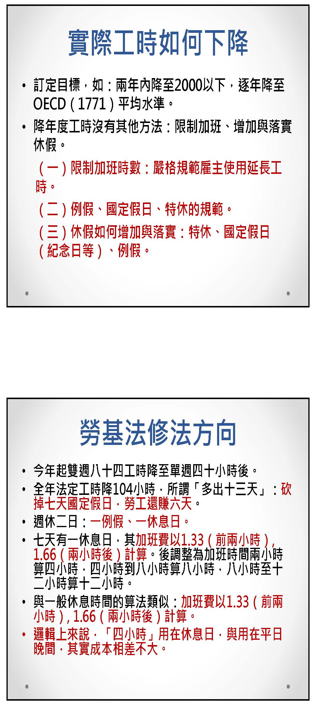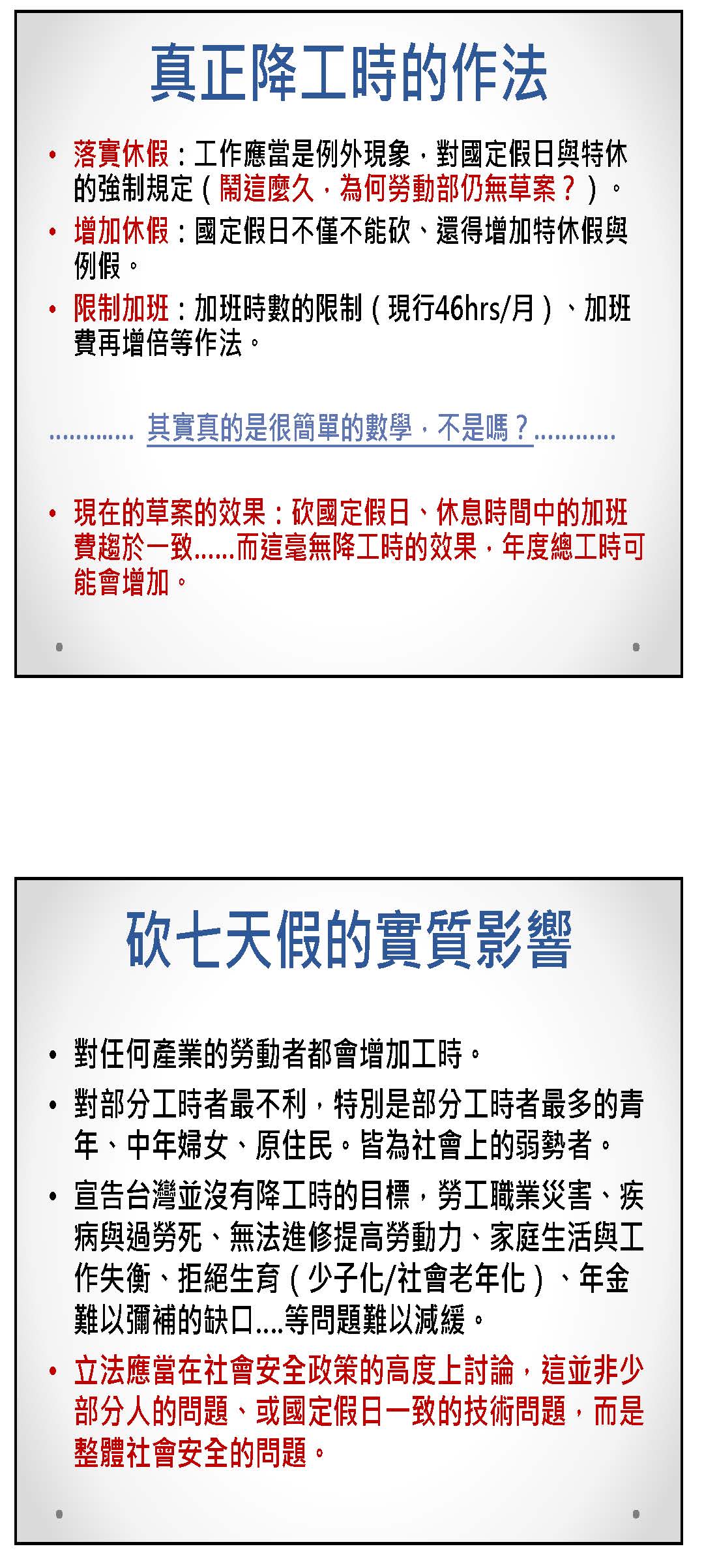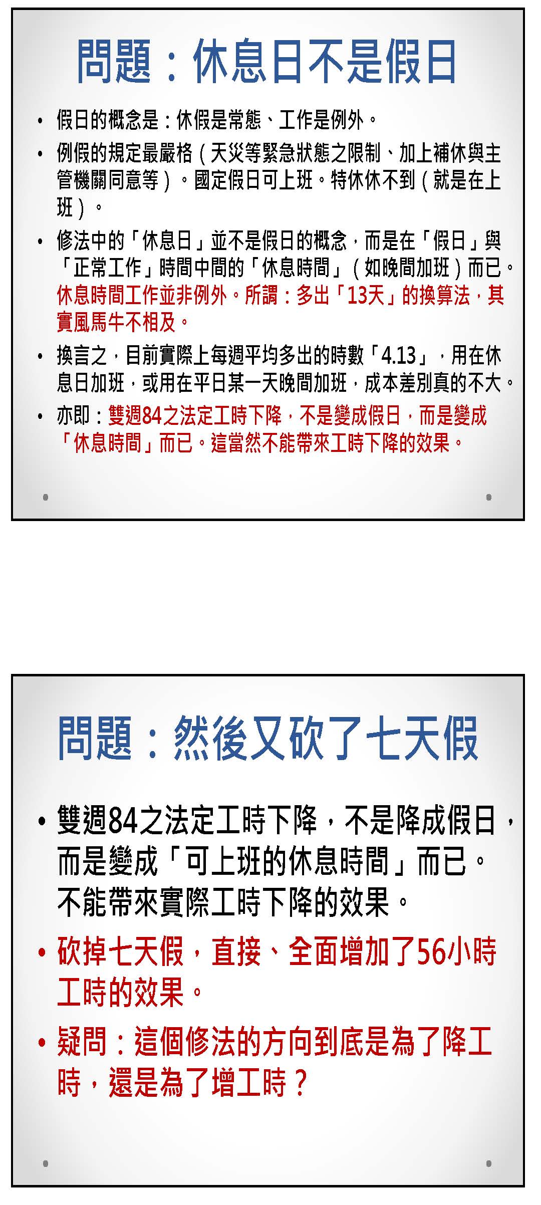 我們現在來看所謂的非工作日,非工作日有3類,第1類就是每7天休1天例假日,第二類就是19天的國定假日,第三類也就是在2000年我們工時縮短之後所產生的零碎工時、所產生的不工作之休息日。我們今天的爭議點就在於,民進黨所提出來的版本對於休息日的加班計算,不但違背了勞動部在90年的函釋,把休息日上班的加班費是每小時從加0.33到加0.67,我想請問各位,如果民進黨的政策是要確保週休二日,是不是他們也特別看重休息日有一個完整的、不用上班的時段?那麼顯然這個休息日的價值應該是高於所謂的休假日,所以加班費當然就應該要高於休假日。所以根據我們的分析,從法律的解釋也可以得到相同的結果,第一個,資方如果要動用每7天1天的例假日,所要付出的代價最高、限制最多,必須是天災、事變、突發事故,資方叫勞工來上班必須要加給1天錢,而且還要再補假1天。第二個就是所謂的週休二日,就是每一週多出來的第2天的休息日,它的代價要比國定假日來得高,為什麼?因為這是routine的、是循環性的發生,它是可以預測的,它跟勞工的休息有充分的關聯,所以勞工在這一天加班,不管是按照勞動部在86年或90年的函釋,都可以得出現在勞動部修法的結論,也就是前2個小時除了當天不用上班就可以領得的工資以外,還要再另外加1.33跟1.67,這在解釋論上是沒有問題的。這一次勞動部所謂先進的立法,不過就是把法律上應該的解釋變成法律而已,所以我個人認為並沒有任何的進步性,對勞工沒有任何的影響。