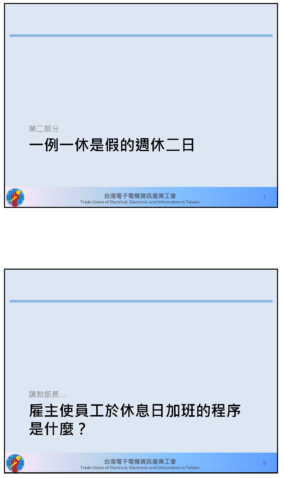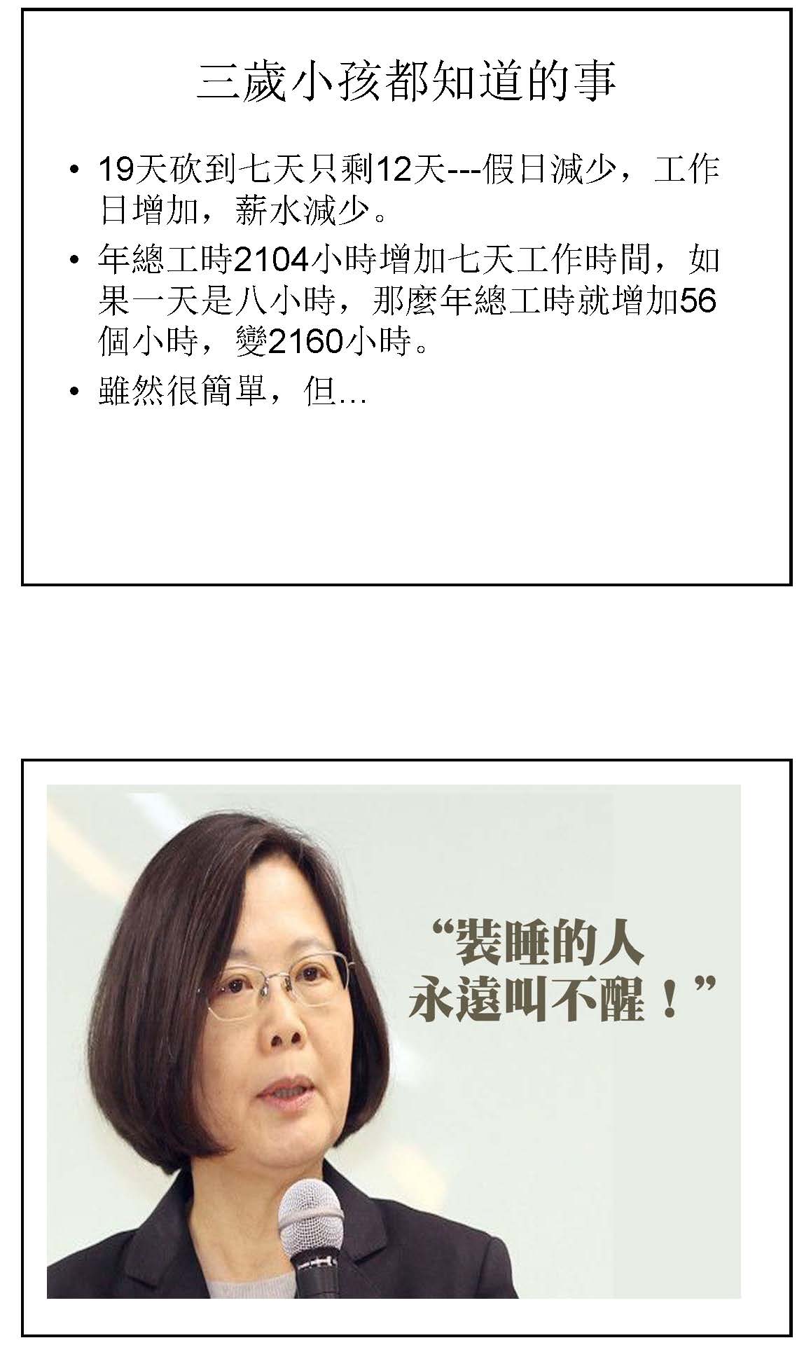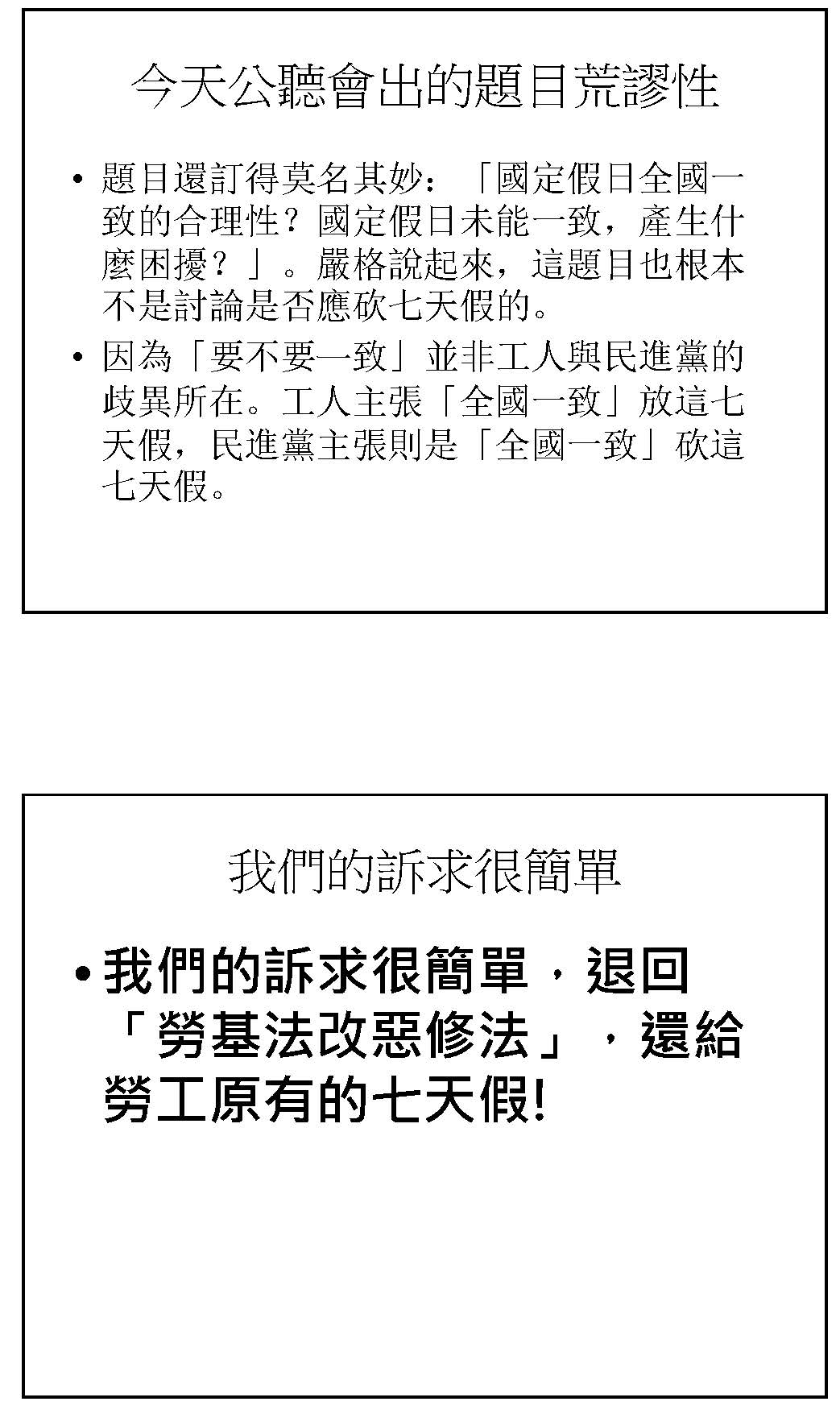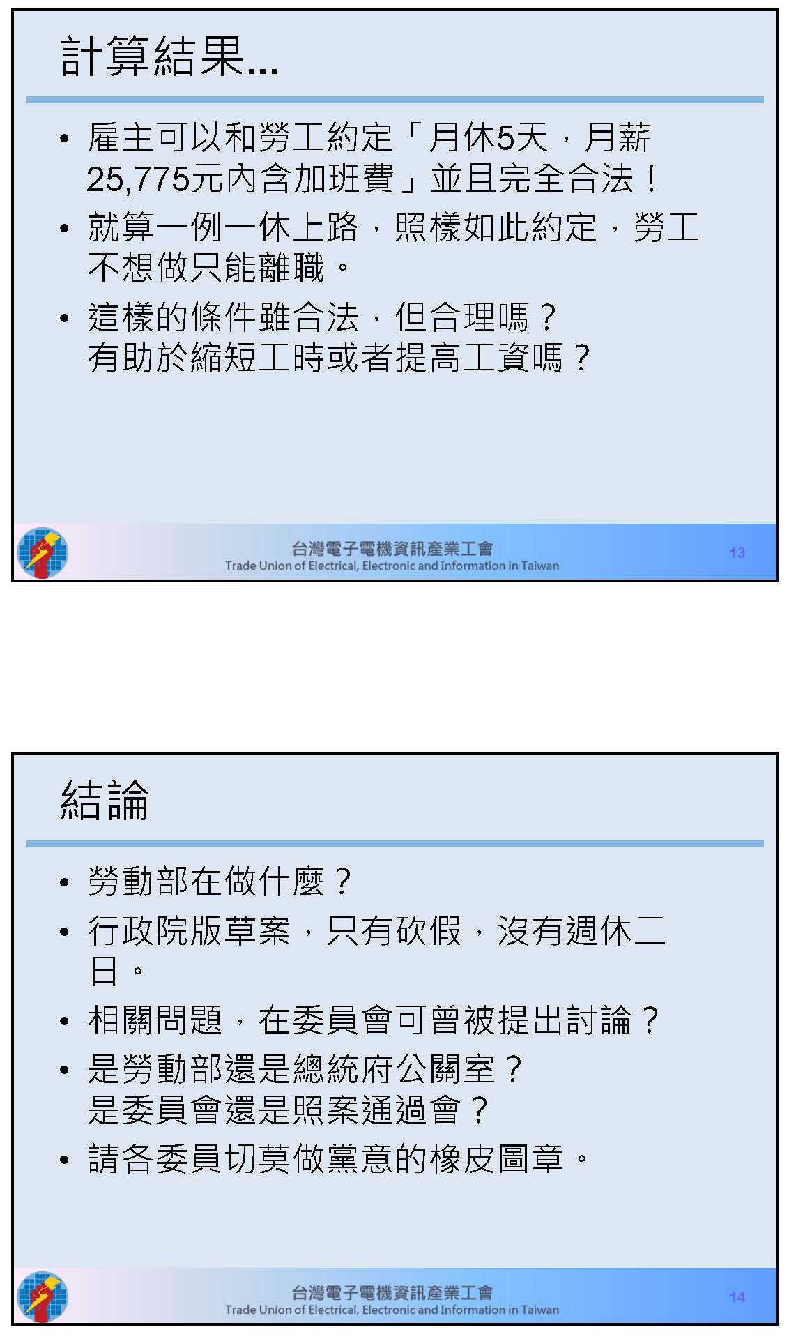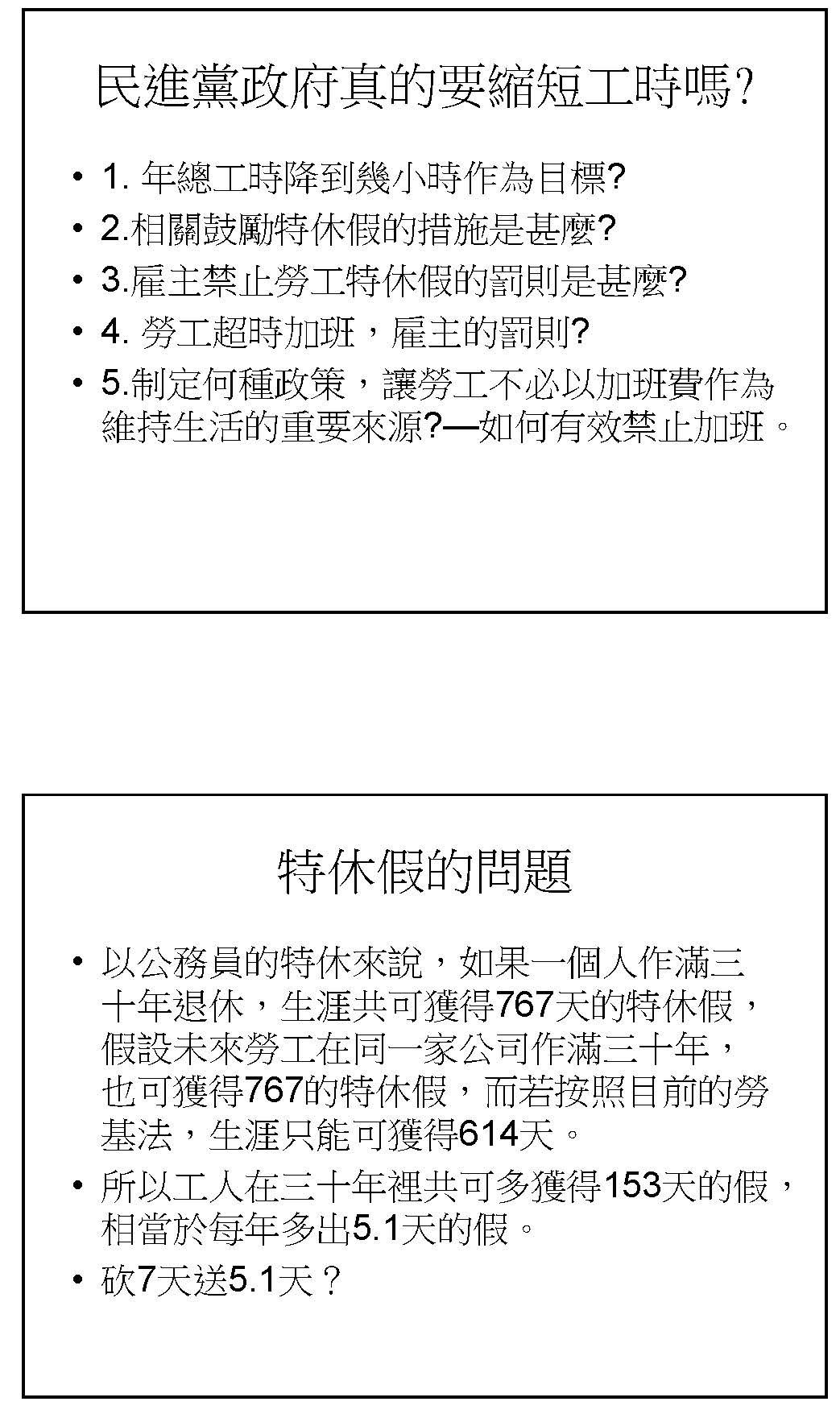 我們現在來看所謂的非工作日,非工作日有3類,第1類就是每7天休1天例假日,第二類就是19天的國定假日,第三類也就是在2000年我們工時縮短之後所產生的零碎工時、所產生的不工作之休息日。我們今天的爭議點就在於,民進黨所提出來的版本對於休息日的加班計算,不但違背了勞動部在90年的函釋,把休息日上班的加班費是每小時從加0.33到加0.67,我想請問各位,如果民進黨的政策是要確保週休二日,是不是他們也特別看重休息日有一個完整的、不用上班的時段?那麼顯然這個休息日的價值應該是高於所謂的休假日,所以加班費當然就應該要高於休假日。所以根據我們的分析,從法律的解釋也可以得到相同的結果,第一個,資方如果要動用每7天1天的例假日,所要付出的代價最高、限制最多,必須是天災、事變、突發事故,資方叫勞工來上班必須要加給1天錢,而且還要再補假1天。第二個就是所謂的週休二日,就是每一週多出來的第2天的休息日,它的代價要比國定假日來得高,為什麼?因為這是routine的、是循環性的發生,它是可以預測的,它跟勞工的休息有充分的關聯,所以勞工在這一天加班,不管是按照勞動部在86年或90年的函釋,都可以得出現在勞動部修法的結論,也就是前2個小時除了當天不用上班就可以領得的工資以外,還要再另外加1.33跟1.67,這在解釋論上是沒有問題的。這一次勞動部所謂先進的立法,不過就是把法律上應該的解釋變成法律而已,所以我個人認為並沒有任何的進步性,對勞工沒有任何的影響。