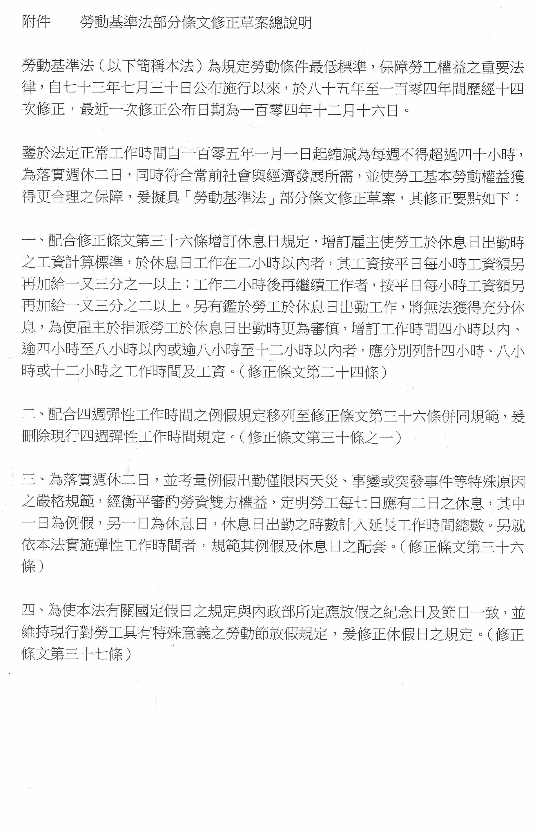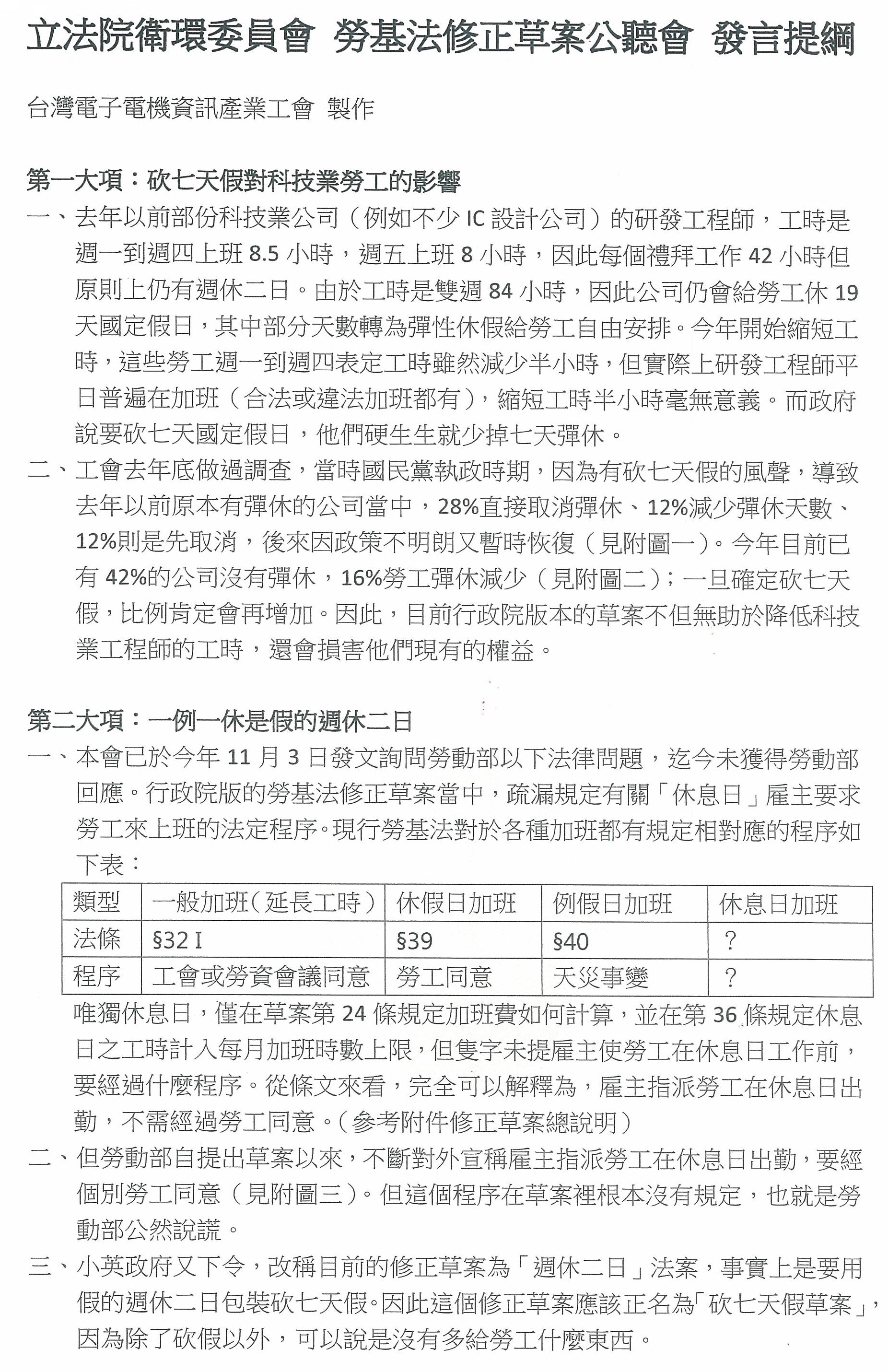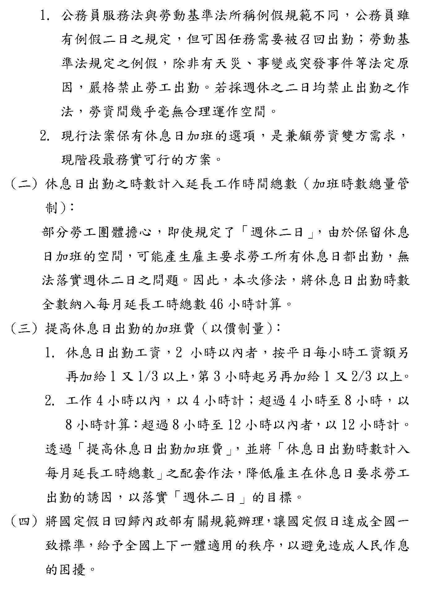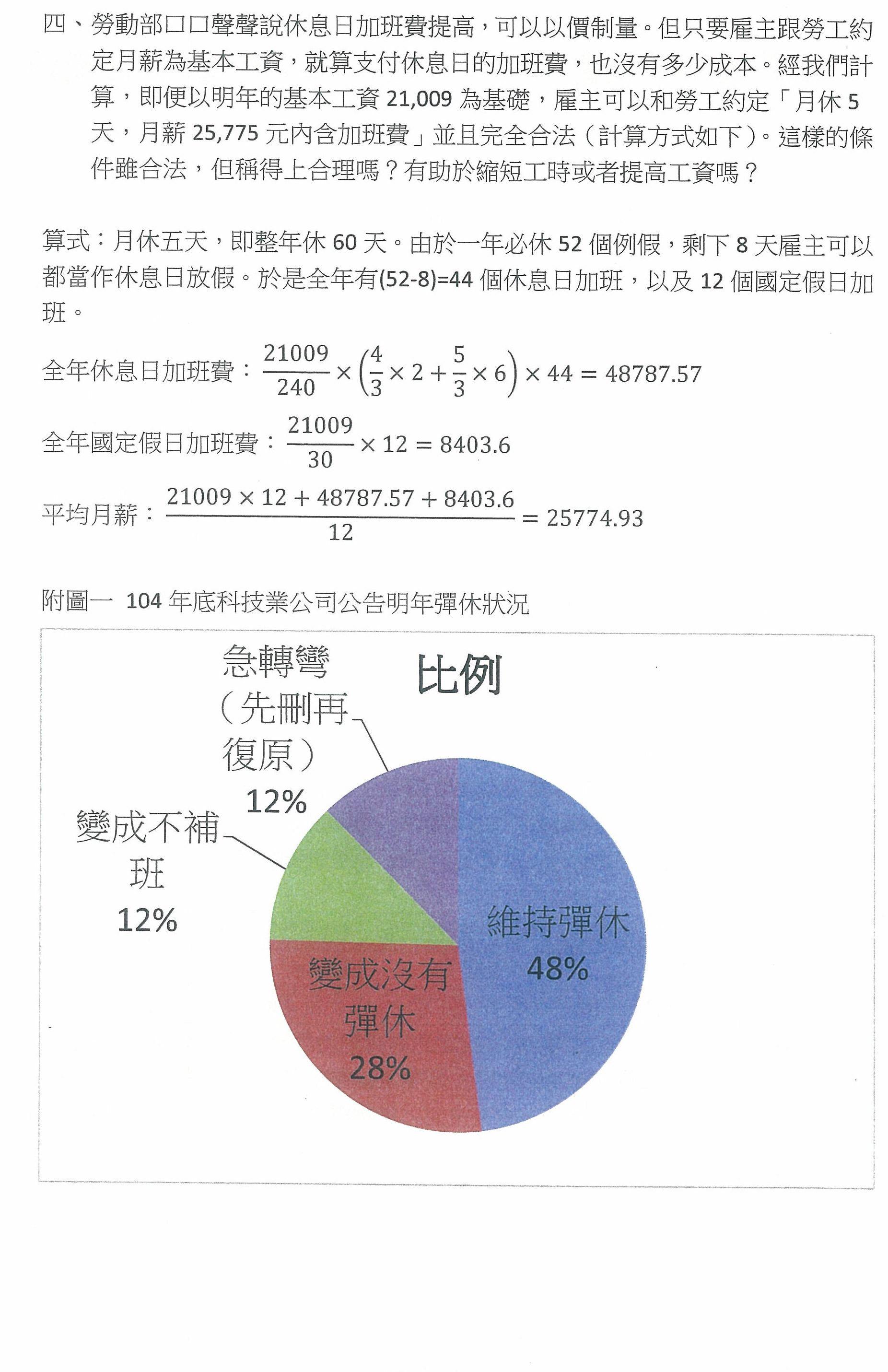 關於第二個提綱,現在行政院版已經提高休息日的加班費,以實務上而言,提高的幅度不算多,因為跟晚上的加班費差不多。實際上,以前業界加1倍加班費就找不足勞工來加班,即使現在業界按勞基法休假日加發1倍,實質上,大概多加到1.5倍。經過換算,即使目前的版本,以8小時計算,大概是1.58倍,例如加班當天日薪是1,200元變成多出1,900元,此舉與現行業界給休假日的加班費差不多,目前業界很多都是給1.5倍。