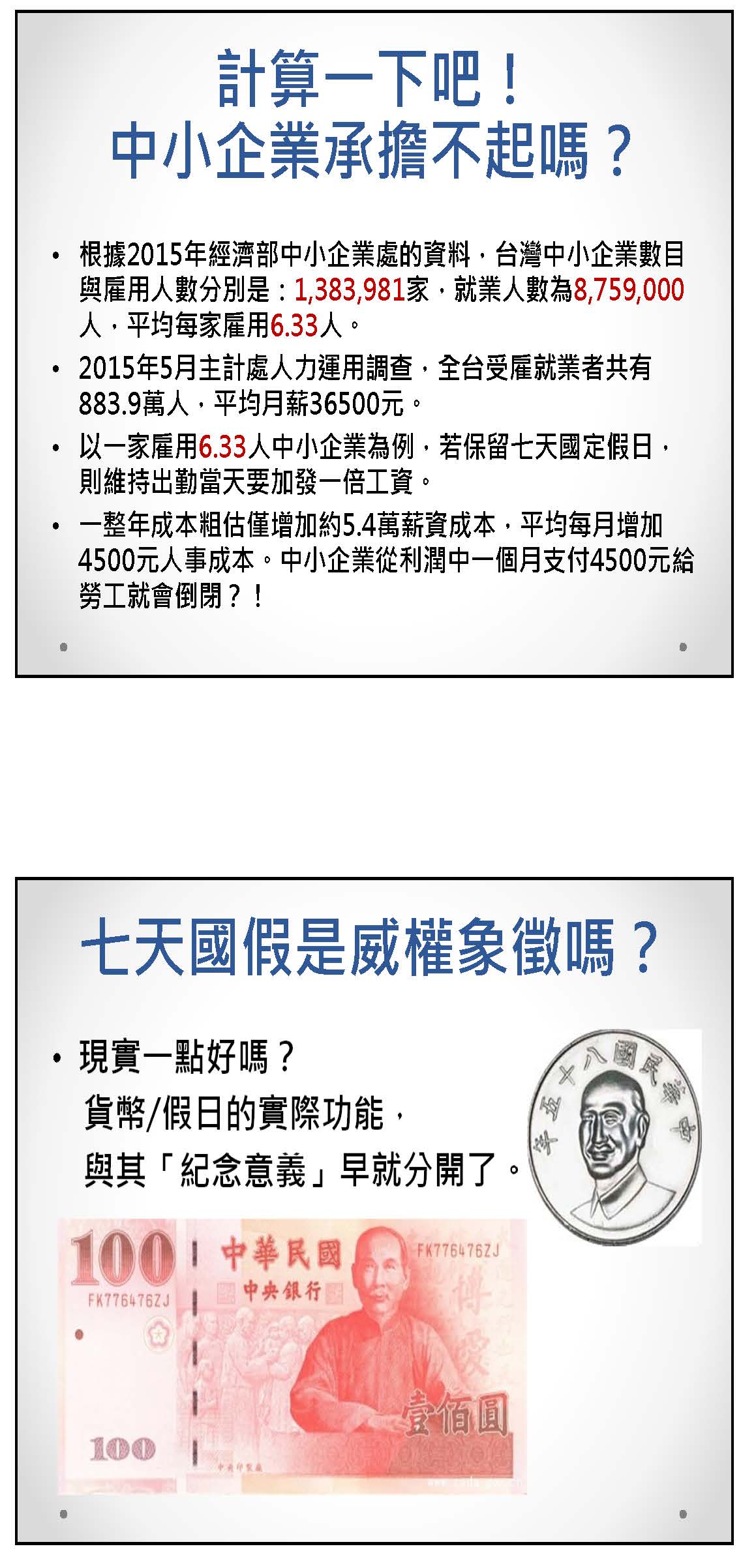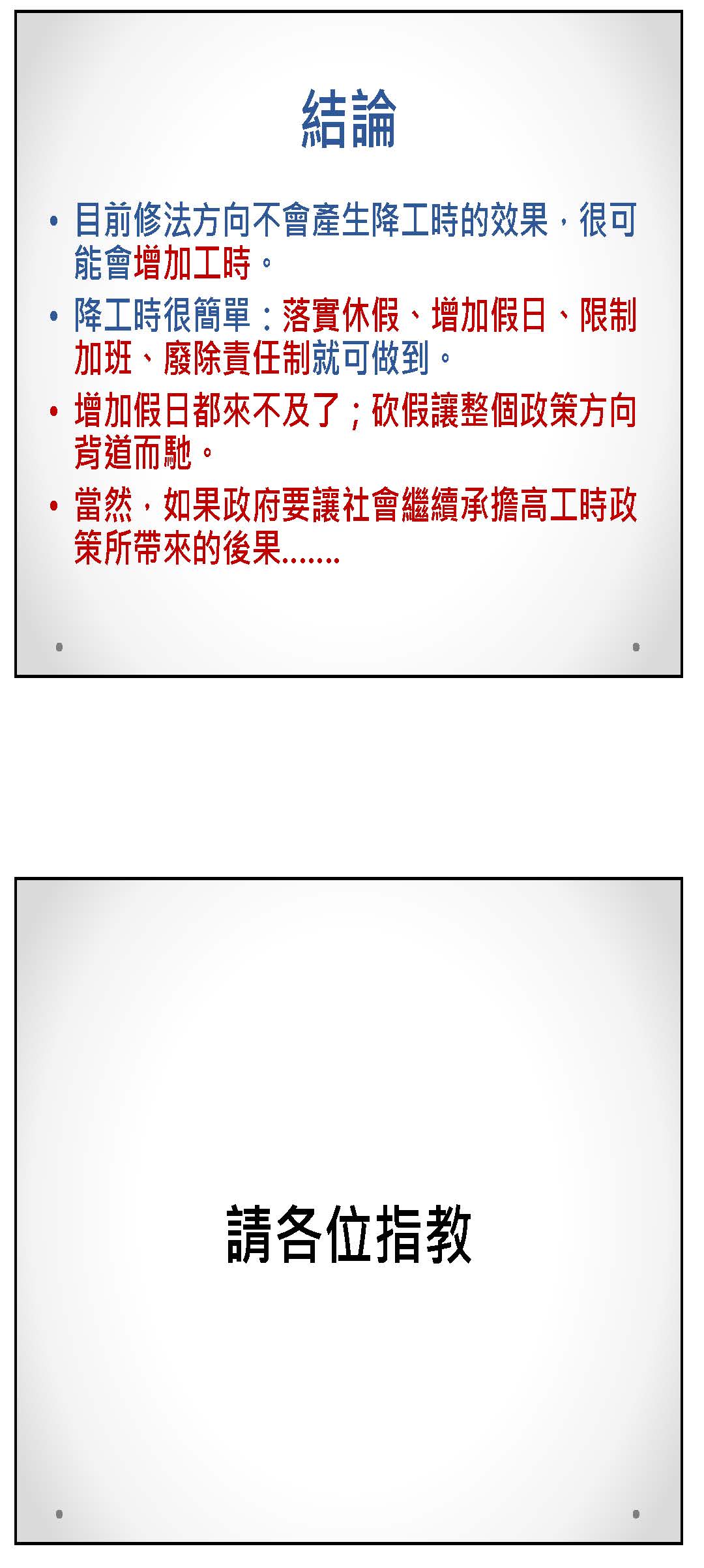 我剛才說過,此一修法應該在社會安全政策的高度上討論,而不是著眼在少部分的國定假日一致的問題,不是這些問題啦!計算一下吧,中小企業真的承擔不起嗎?我們算過了,平均一個中小企業一個月只多付4,500元而已,怎麼會付不起呢?7天假是威權象徵嗎?你10元硬幣不要用了好不好?你100塊紙鈔不要用了好不好?什麼威權象徵!實際一點,貨幣跟假日的實際功能跟它的紀念意義早就不一樣,早就分開了嘛!責任制這部分,我就不講了。結論是:目前修法的方向不會產生降工時的效果,很可能還會增加工時。降低工時很簡單,落實休假,甚至增加休假;限制加班;廢除責任制,要降工時,增加假日都來不及了,你還砍假。
