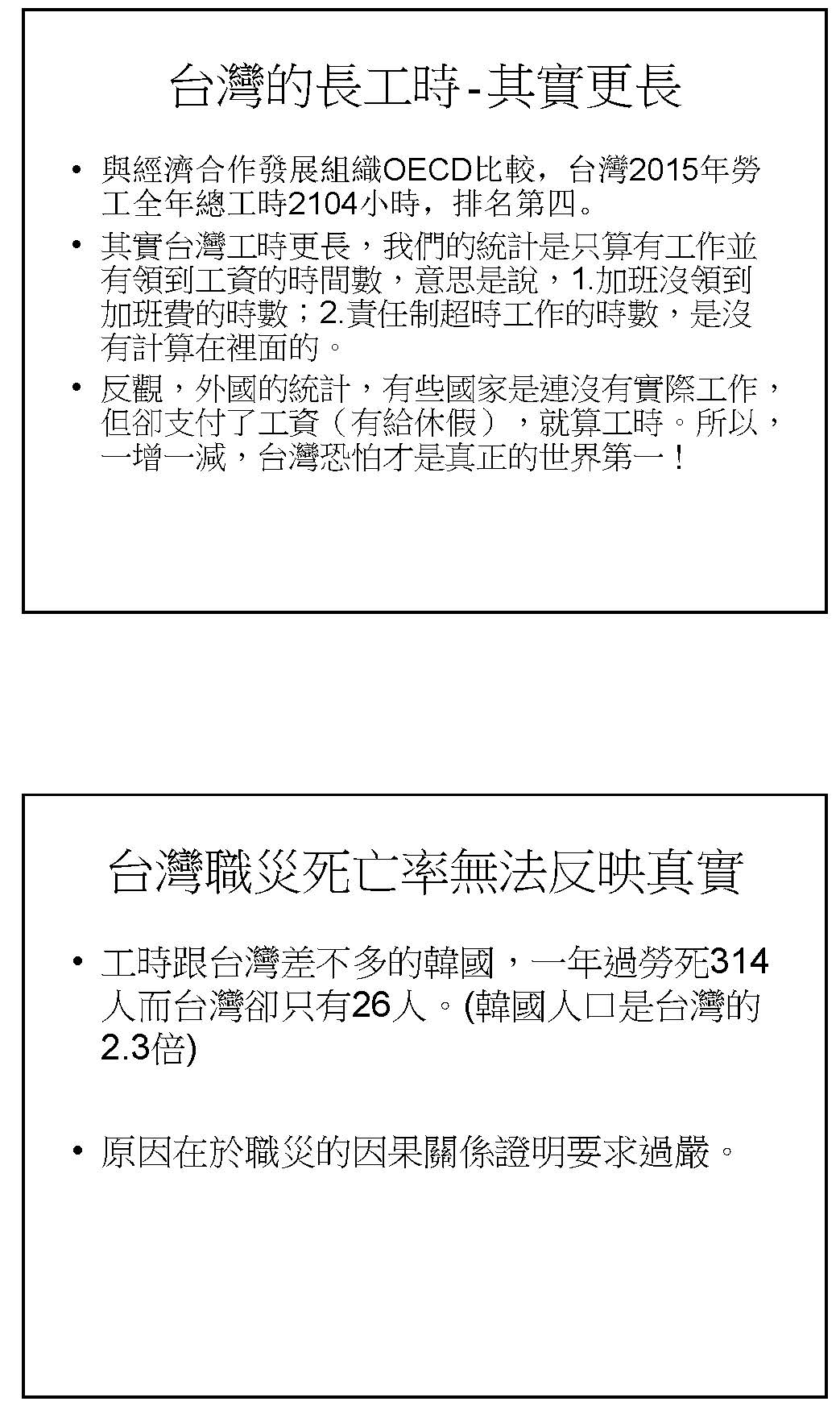 陳政亮副教授:主席、各位委員。我今天要報告的是如何改善台灣長工時的現況。台灣跟OECD國家工時的比較,基本上都在前幾名,以2014年2,134.8小時跟OECD的國家平均1,771小時相比,多了三百多個小時,大約多了四十幾天的工作時數,如果加上休假,大概是比人家多工作一個半月到兩個月左右。在台灣的工時那麼長的狀況之下,對台灣社會造成了很大的影響,第一個影響是就勞工個人而言,他的體力會下降;第二部分是職業災害,因為體力下降、注意力不集中會有很多職業災害的問題;再來就是疾病跟過勞死。就在上個月勞保局公布的資料,2011年到2015年,國內過勞死的人數有163人,每11天就有一個人過勞死,這是台灣的現況。