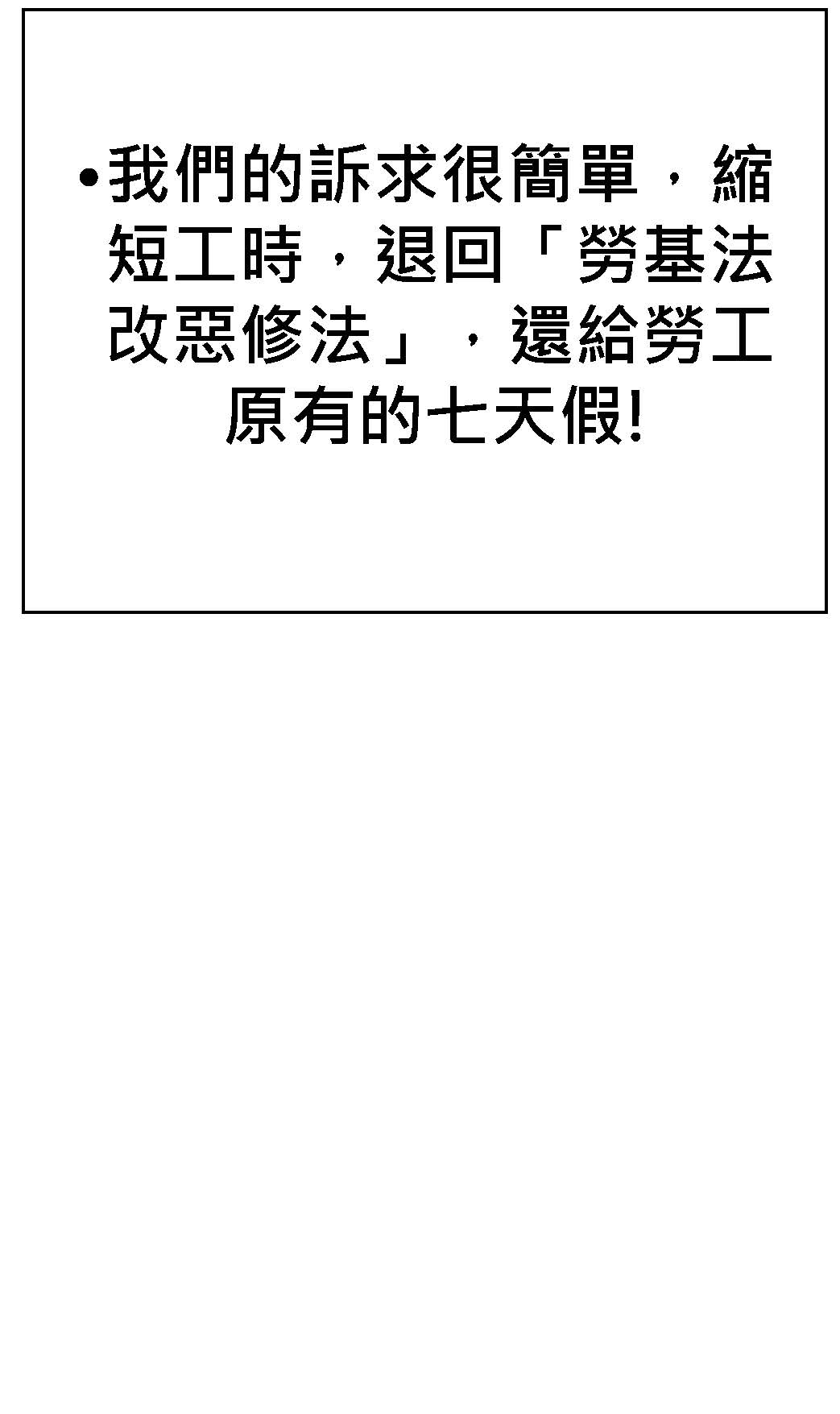 在此簡單問大家一個問題,如果今天雇主叫你禮拜六來工作,你不能拒絕,若你想拒絕、要請假,這不叫做放假,因此,第一,勞動部這個說帖從頭到尾都是在說謊,他們已經騙了大家將近半年;第二,關於整個草案,總結來說,它並不是所謂一例一休,也不是週休二日的草案,它只是砍七天假的草案,這個草案只有一個目的,就是砍七天假!