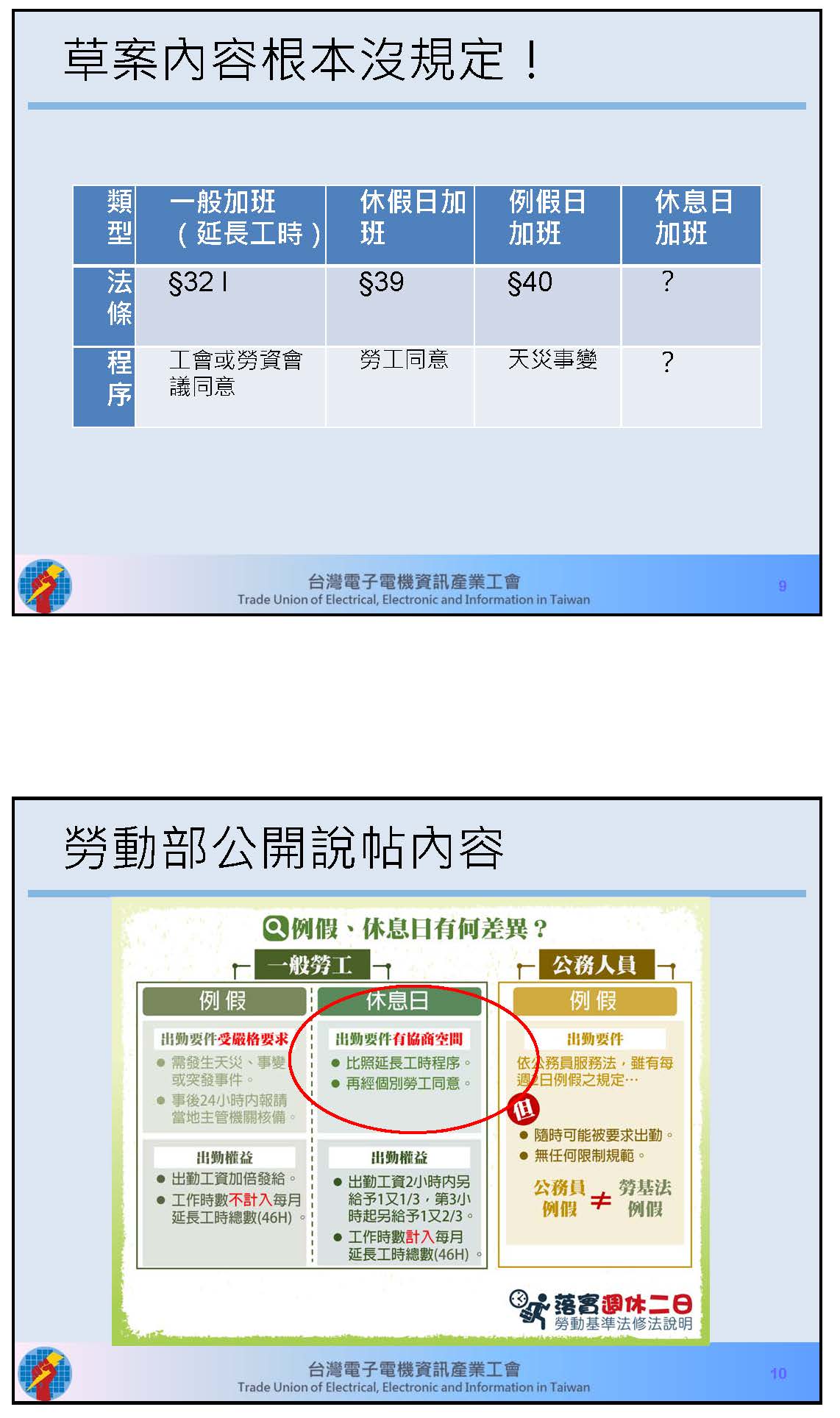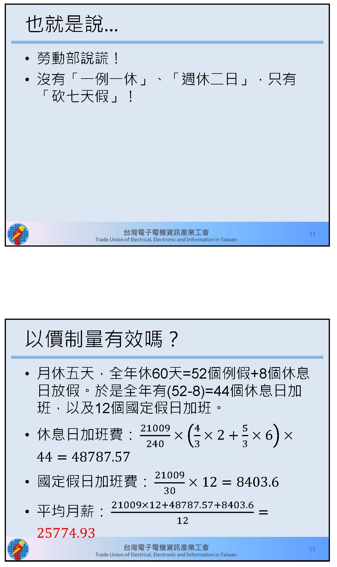 民進黨政府對這次修法最大的訴求就是在給勞工加薪,提高加班費,來換砍掉勞工7天假,但是我們認為這樣的講法事實上有誤導之嫌。上週我們在行政院前面開記者會,我也曾經就這個問題講過,我在這邊再重復解釋一次,在現行法之下的非工作日有三種,一種是例假日,就是7休1,一種是休假,就是國定假日、特休,一種是休息日。事實上這三種非工作日,在勞基法中工資的計算只有就例假日和休假日來規定,休息日在目前的法律中是沒有規定的,這個緣由是來自於2001年工作時間從單週48小時修正為雙週84小時,產生了每2週就會有4小時零碎工時,然後又因為企業搭配週休二日的實施,就會有週六休息日的出現,在這個前提之下,民國90年勞委會作出函釋,說明法律沒有規定的休息日中勞工出勤加班費要如何計算,指出勞工如果在休息日去上班,加班費的計算要依照勞基法第二十四條的規定辦理。我們當然知道勞動部的解釋和企業主的講法,現在平均日薪的算法是月薪除以30天,勞動部的算法是休息日和例假日就算不用出勤也本來就有工資,所以勞動部的算法是,依照勞基法第二十四條,勞工去上班,只有多加0.33和0.67,經過勞動部的解釋,結果變成這樣。我今天要強調的是,我們認為這樣的解釋方式是非常有問題的,首先,日薪是月薪除以30,在這個點上就是占勞工便宜,吃勞工豆腐,勞動部美其名說,也有公司勞工休息日、例假日不用上班。事實上它的目的是擴大除以日薪的基數,以降低勞工平均日薪及平均時薪加班費所算出的數字,也就是如果扣除休息日、例假日,平均月薪除以實際上班日22或24天,實際日薪會比較高,所算得每位勞工的加班費也會比較多,原本在計算上,就已經吃勞工一次豆腐。