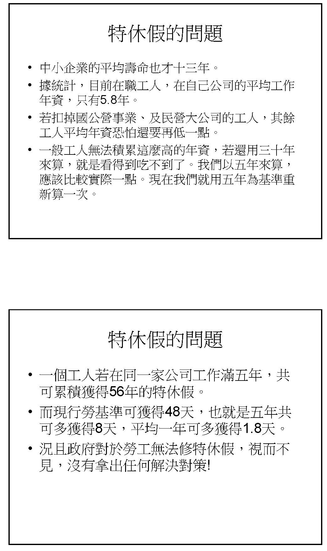 根據勞基法第三十八條的規定,特休假是鼓勵勞工在同一個企業服務的待遇,所以特休假會隨著年資而增加。然而臺灣的企業型態是以中小企業為多(這點其實剛剛我有聽到一位資方代表的意見),導致特休假淪於看得到、吃不到。昨天「工鬥」在群賢樓801會議室舉辦的公聽會也表達了很多的聲音,而且特休假通常需要雇主同意才可以休,如果未休也不能折抵薪資。以年資7年來看,公務員有21天假,勞工只有14天,相差了7天的假期;年資10年的部分,公務員有28天,但是勞工只有14天,相差了一倍。況且勞工離職以後年資與年假就要重新計算,但是公務員換單位的話,年資卻可以合併計算。如果全國年假一致卻只砍勞工的7天假,其他福利並沒有比照,增加勞工和公務人員的對立只是在破壞族群的和諧。所以本席在明天逐條審查時會有一個提案,就是要還給我們的勞工這7天假,而且公務員應該比照勞工放這7天假。