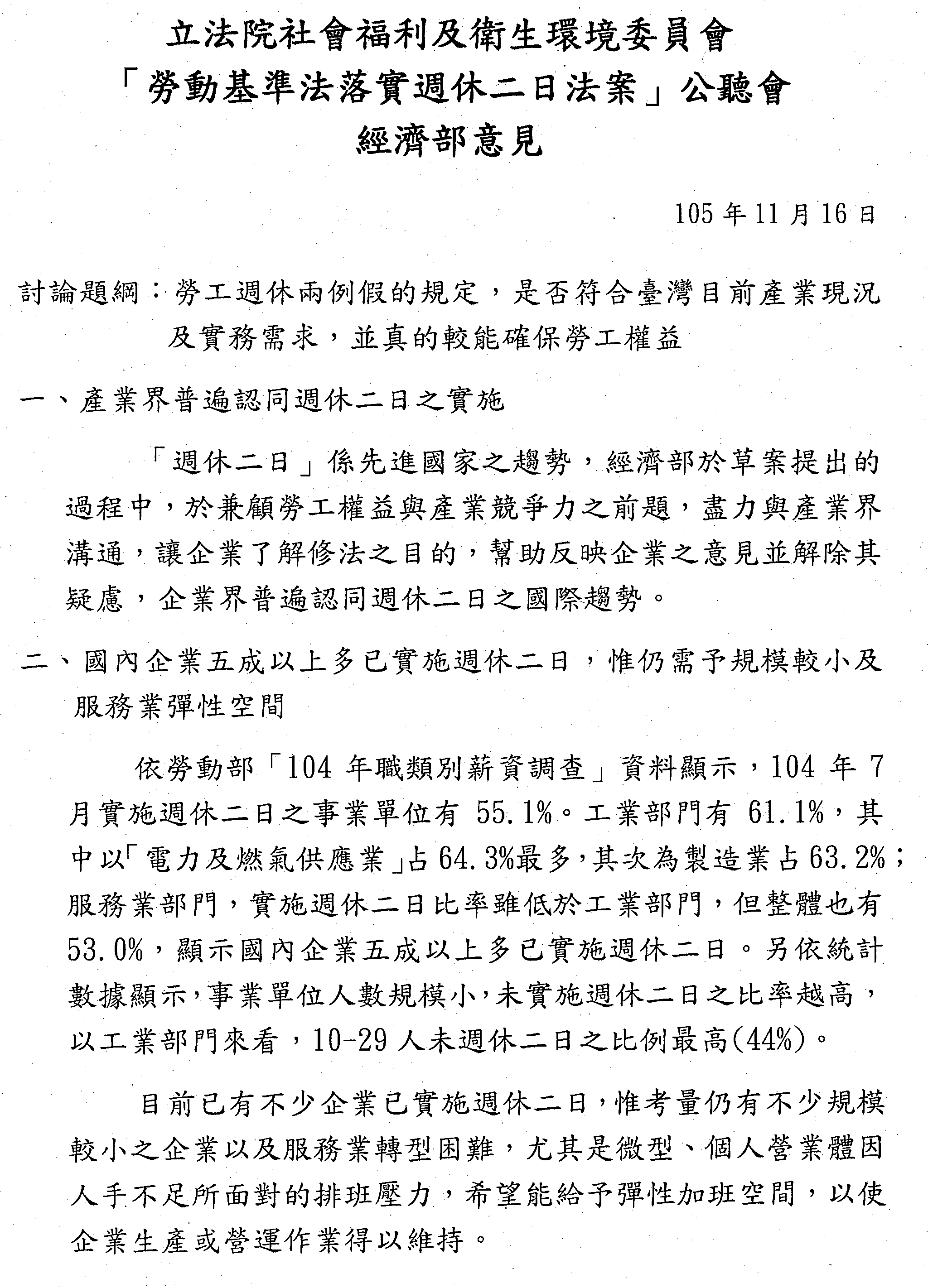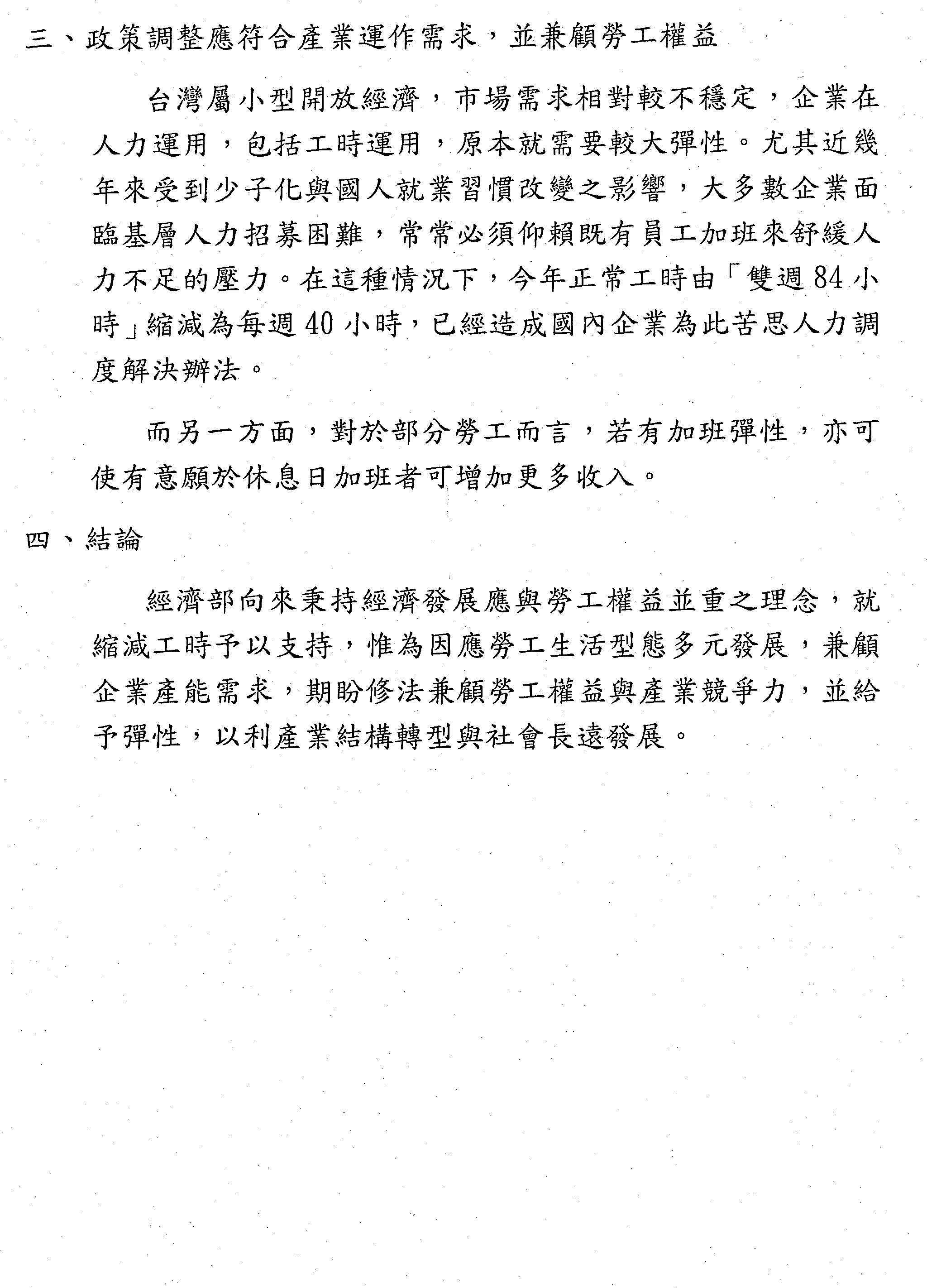 經濟部向來秉持經濟發展和勞動權益必須並重的理念,就是減少工時,予以支持,但是為因應勞工型態、生活型態的多元發展,也兼顧企業的需求,希望修法能兼顧勞工權益與產業競爭力,並給予較大的彈性,以利產業結構轉型和社會長遠的發展。以上。
