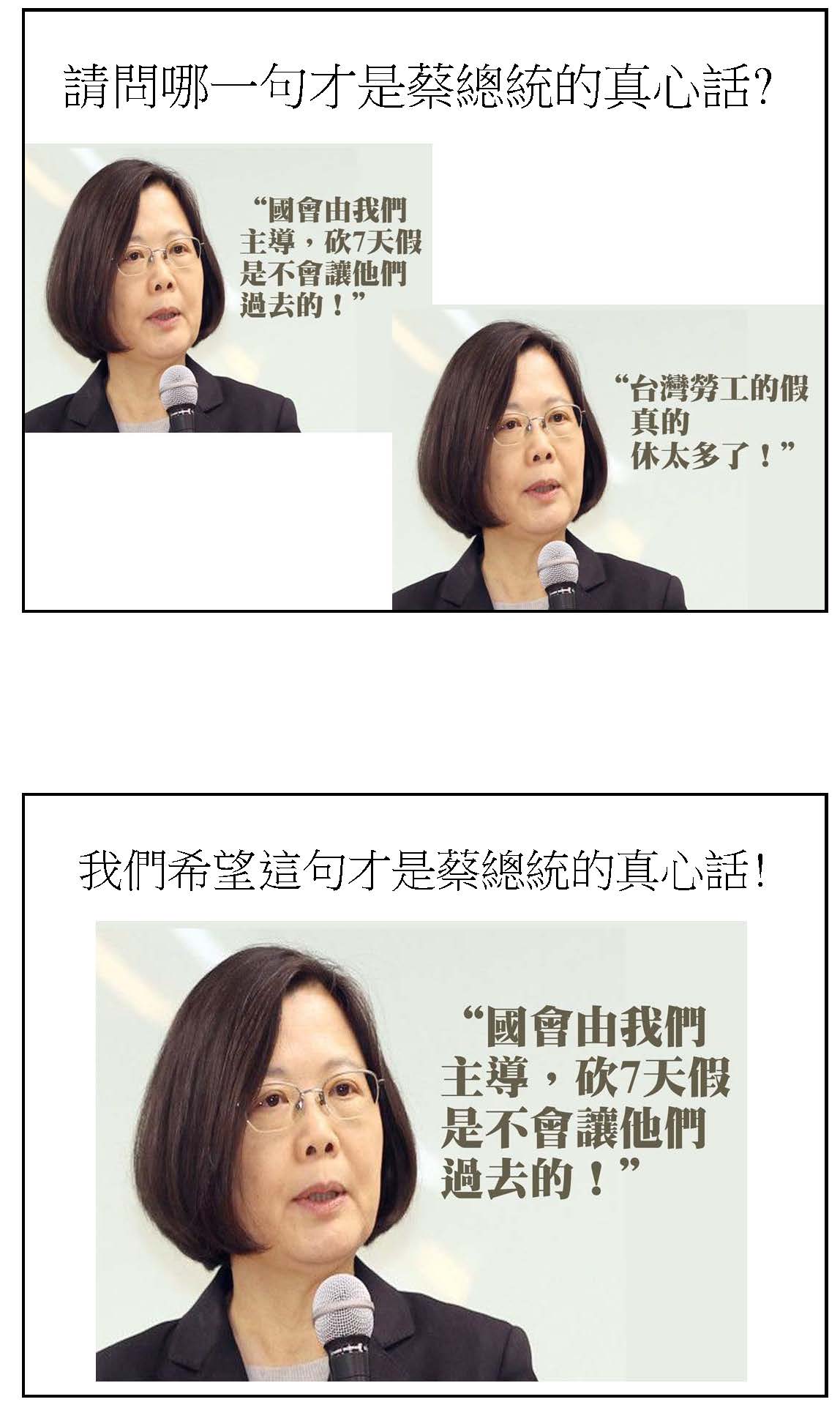 我們來回顧一下蔡英文總統競選時所提出的勞工政見,第一條就是要真正落實週休二日,其次是要研擬提高加班費的計算標準。可惜民進黨執政之後卻沒有兌現諾言,硬推有重大爭議的一例一休,甚至還說勞動部推得不好,其實是「週休二日」,通過之後,勞工的7天假都要砍掉。