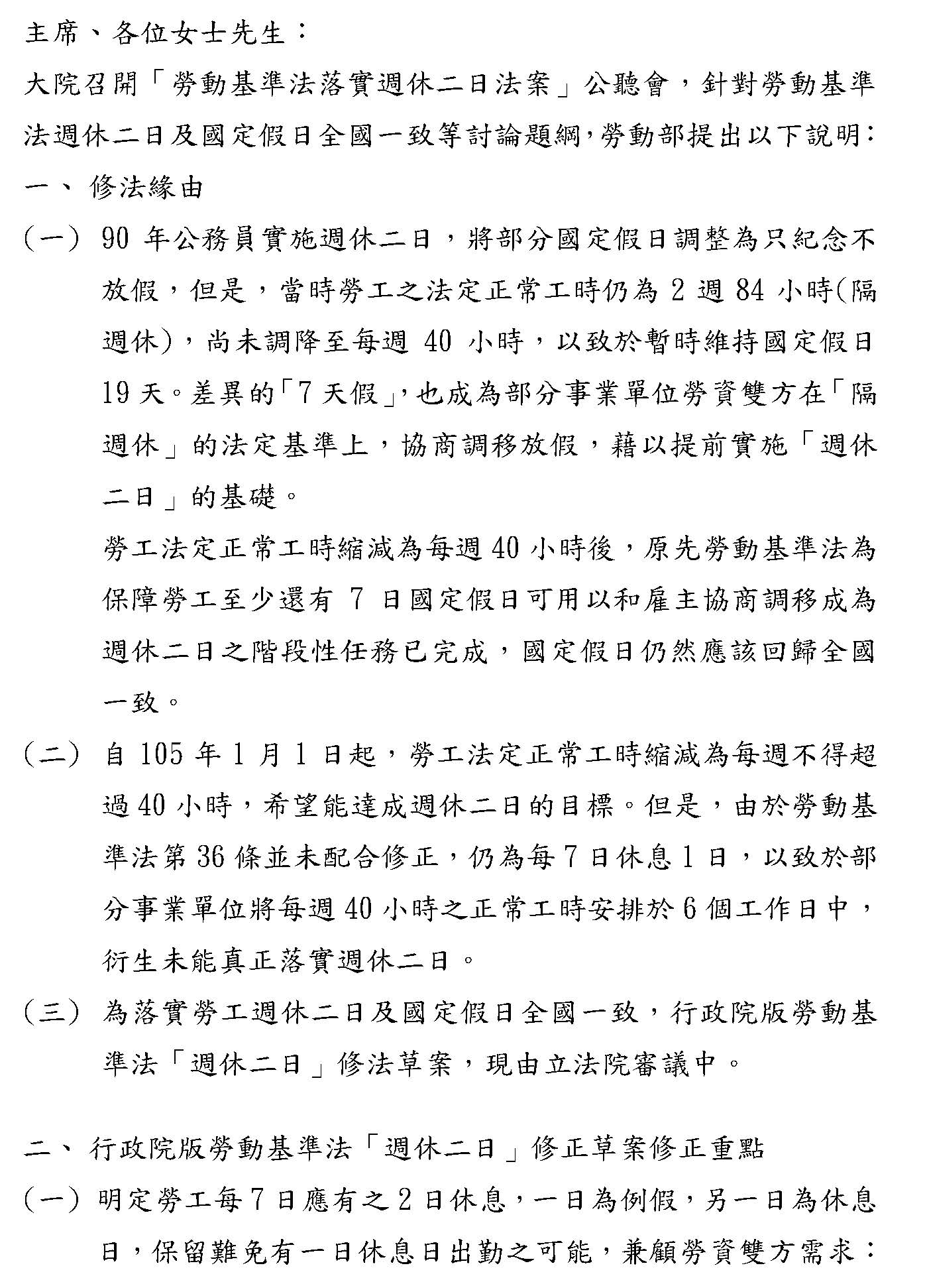 主席:本次公聽會是針對「勞動基準法落實週休二日法案」所舉行的公聽會,首先謝謝各位專家學者及政府單位人員出席本日會議,有鑑於勞動基準法落實週休二日為目前社會非常關注的議題,所以本委員會特別在今日召開公聽會。