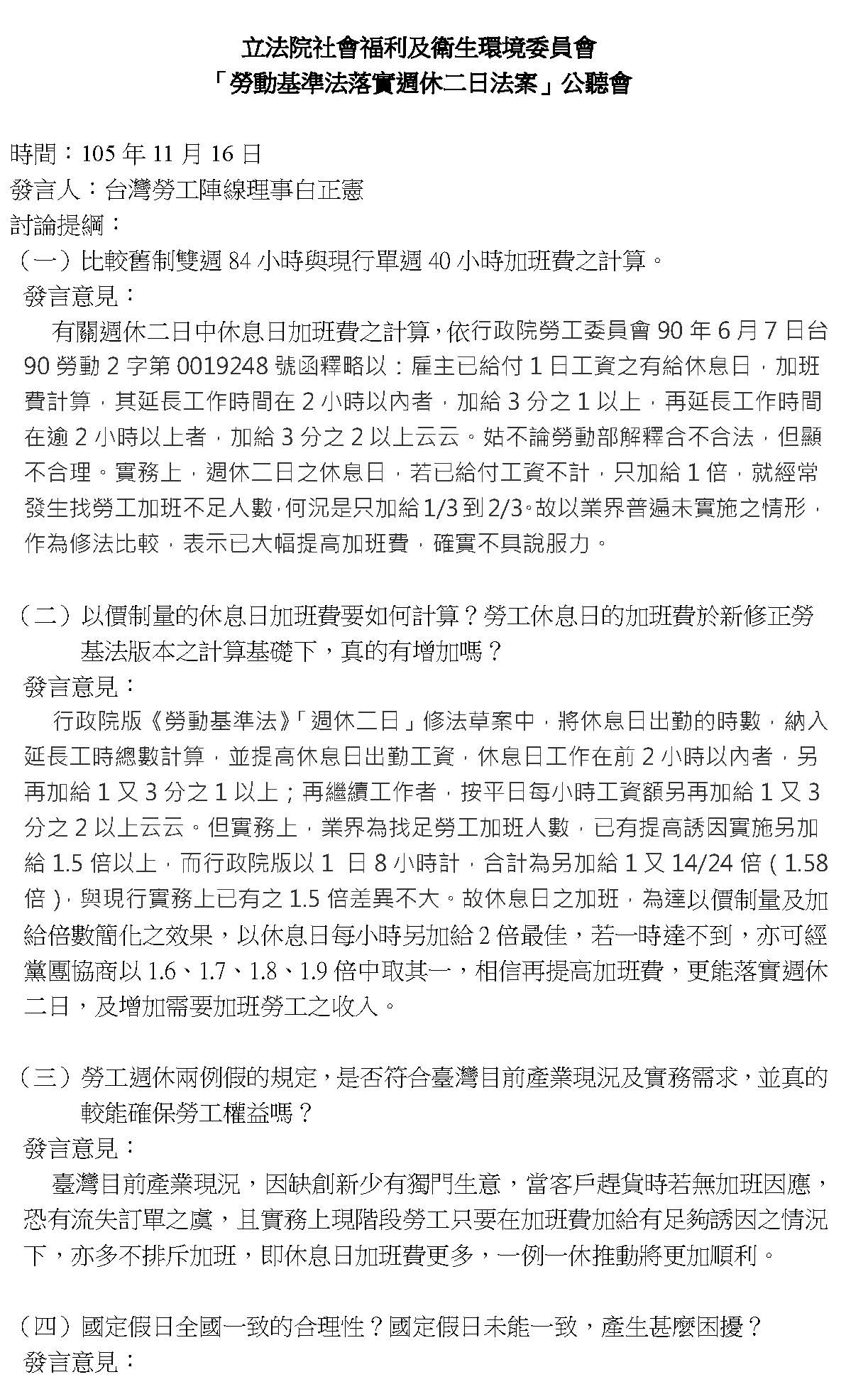 白正憲顧問:主席、各位委員。今天我還是依據題綱的順序來表示意見。關於第一個提綱,剛剛前面幾位已經提了很多以前勞委會90年的解釋,它合法與否是另一回事,的確是不合理。我們知道休息日的加班跟晚上延長工時加班的差異,在休息日加班,勞工必須多付出交通時間及交通費,結果拿到的加班費比晚上加班還少!這種解釋不合理,的確會一再受到質疑,所以再依照這樣的基礎與現在的修法比較時,號稱我們現在已經大幅提高加班費,此舉確實沒有說服力。