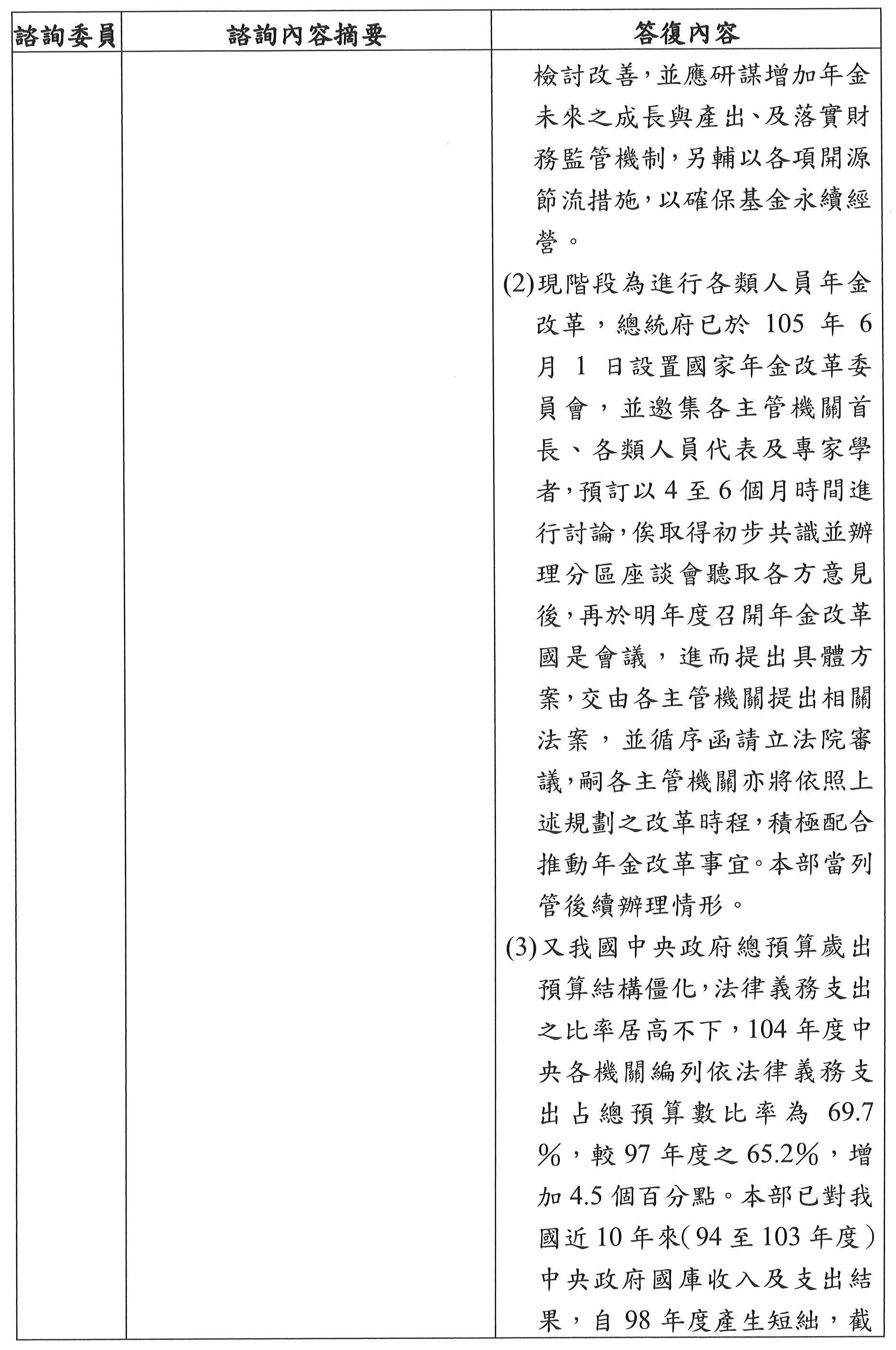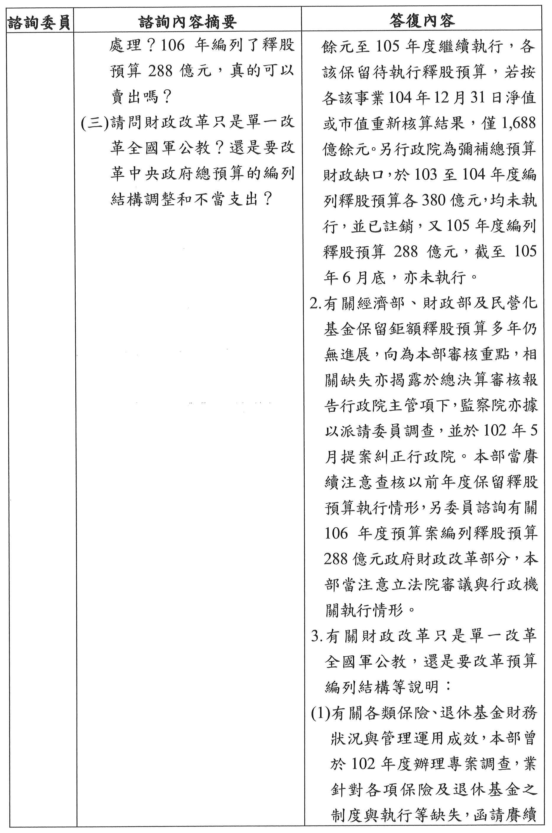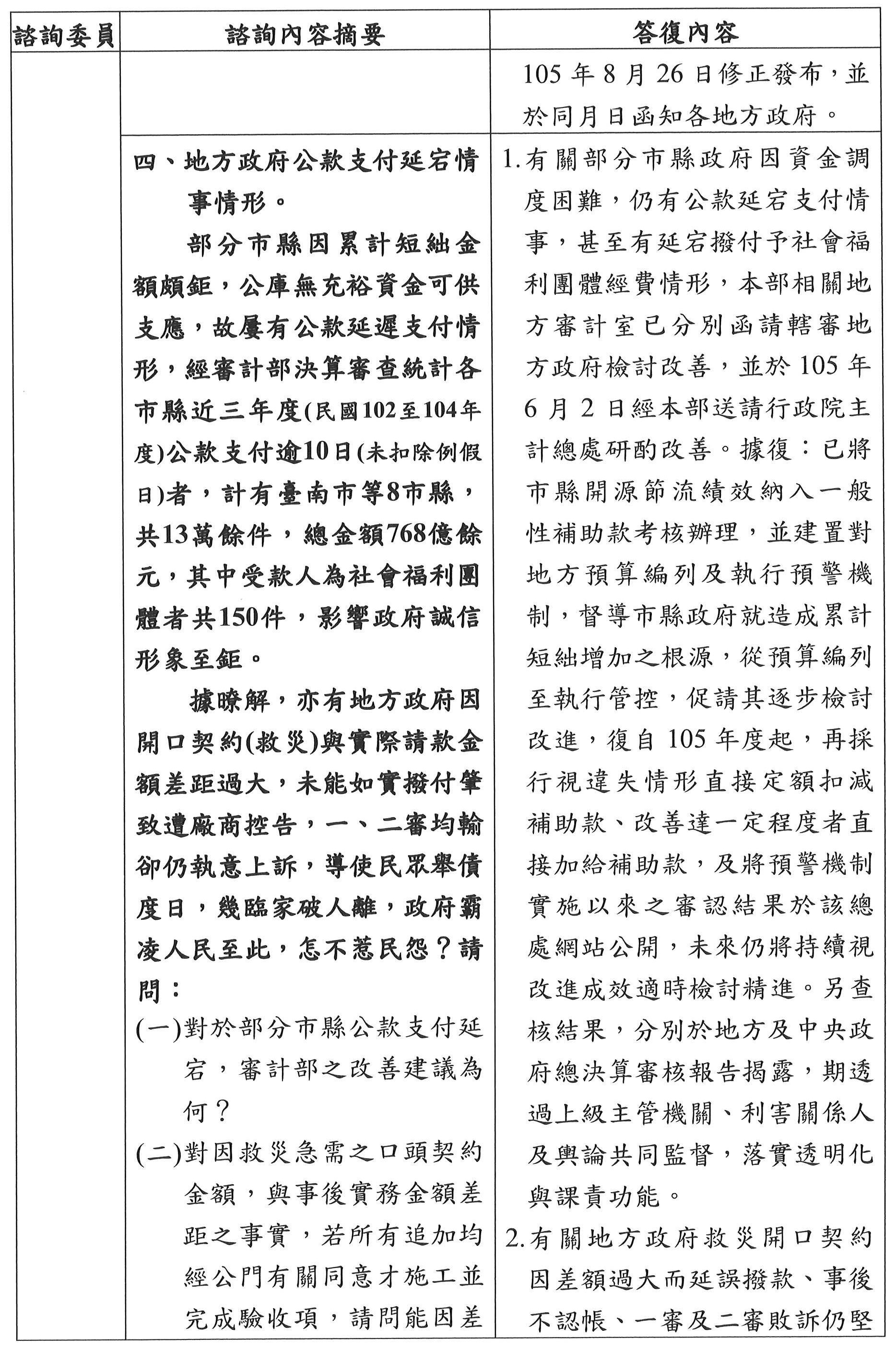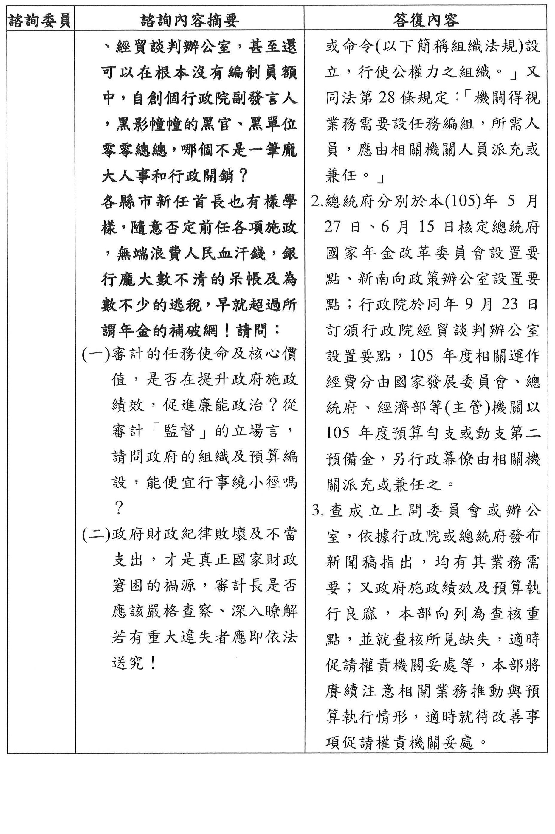 (立法院函 中華民國105年10月21日台立院議字第1050705289號 施政報告質詢2號)