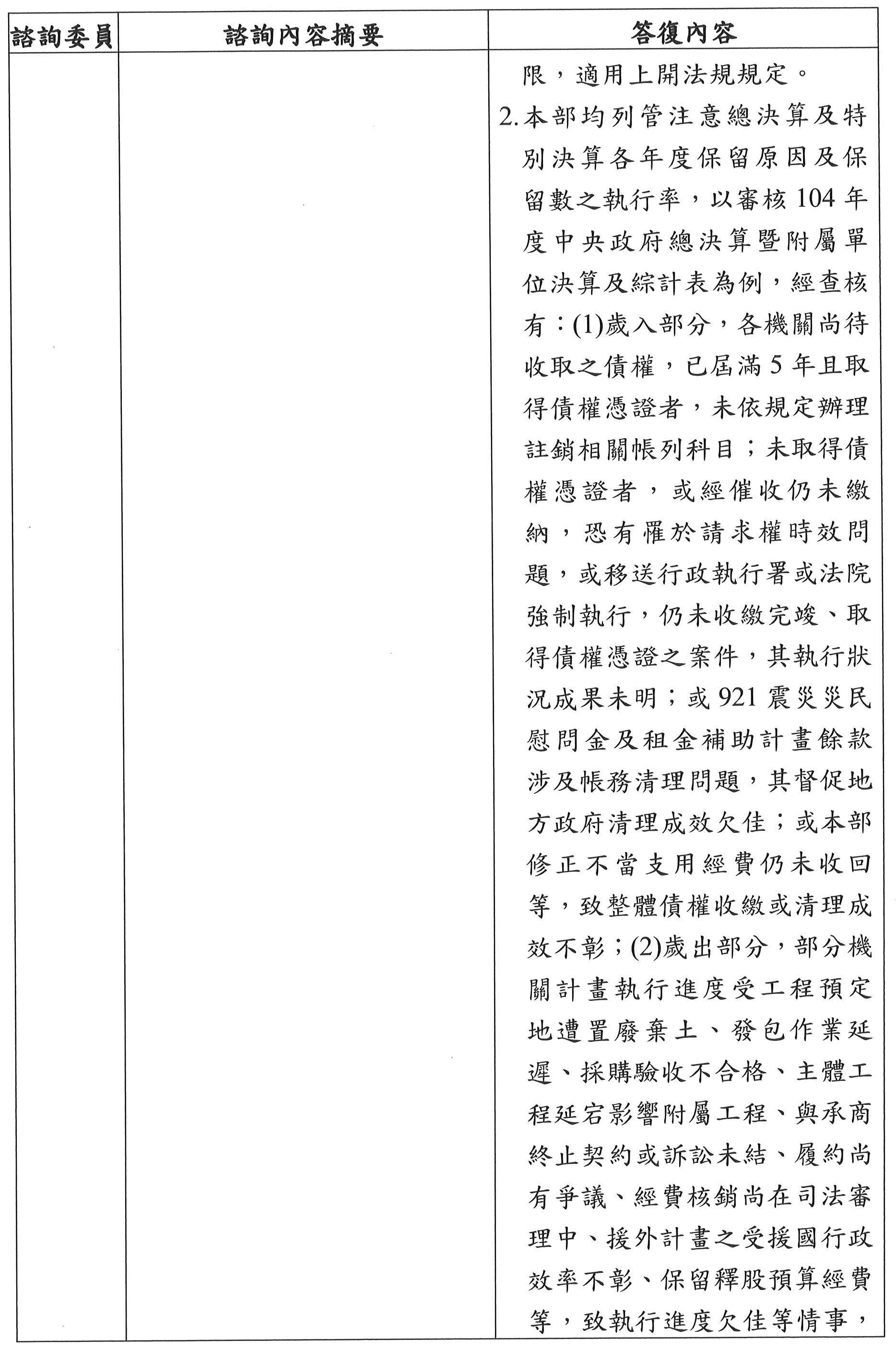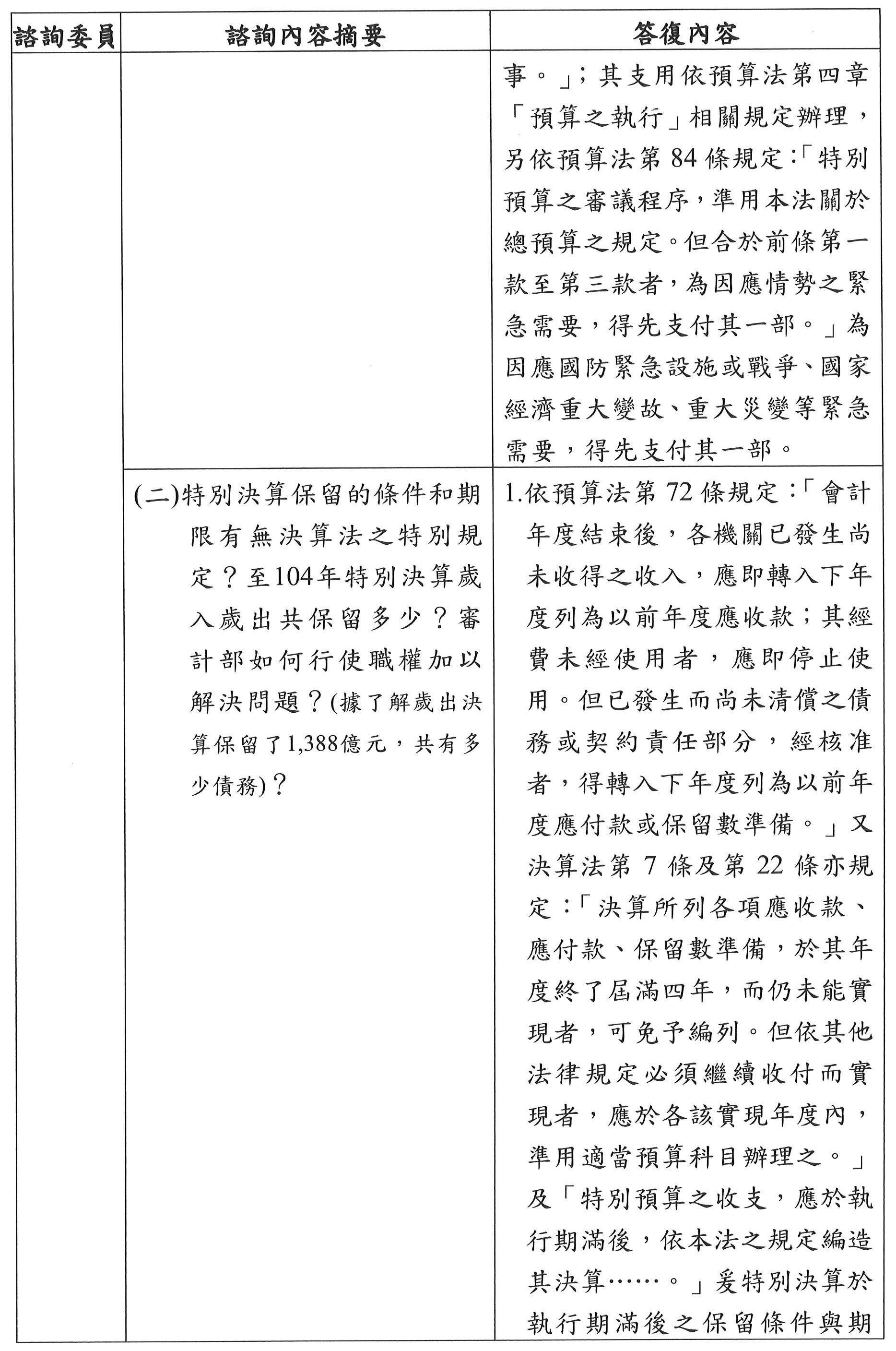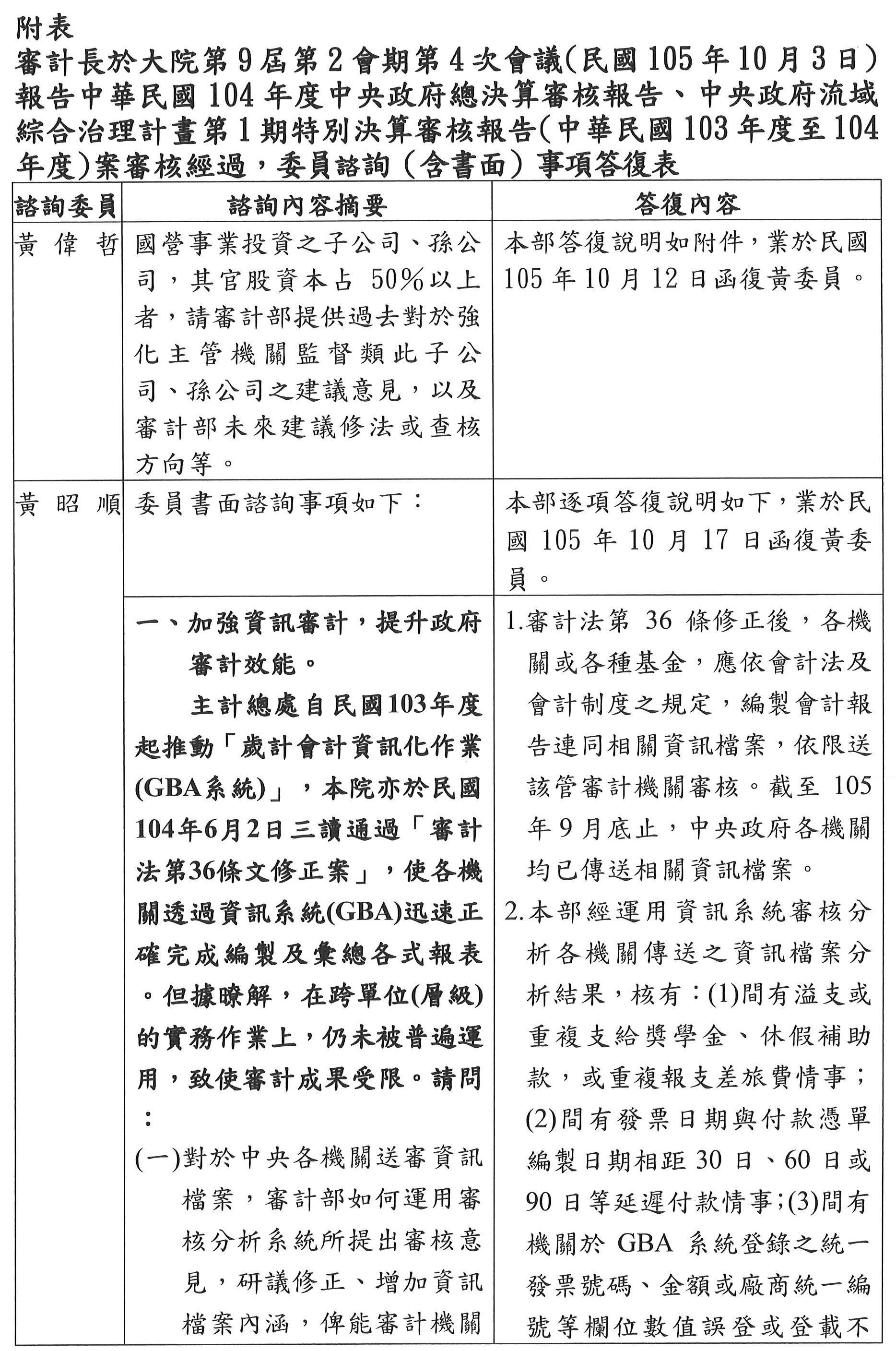 一、審計部函送委員黃偉哲、黃昭順等2人就「中華民國104年度中央政府總決算審核報告、中央政府流域綜合治理計畫第1期特別決算審核報告(中華民國103年度至104年度)」等案審核經過所提諮詢之書面答復,請查照案。