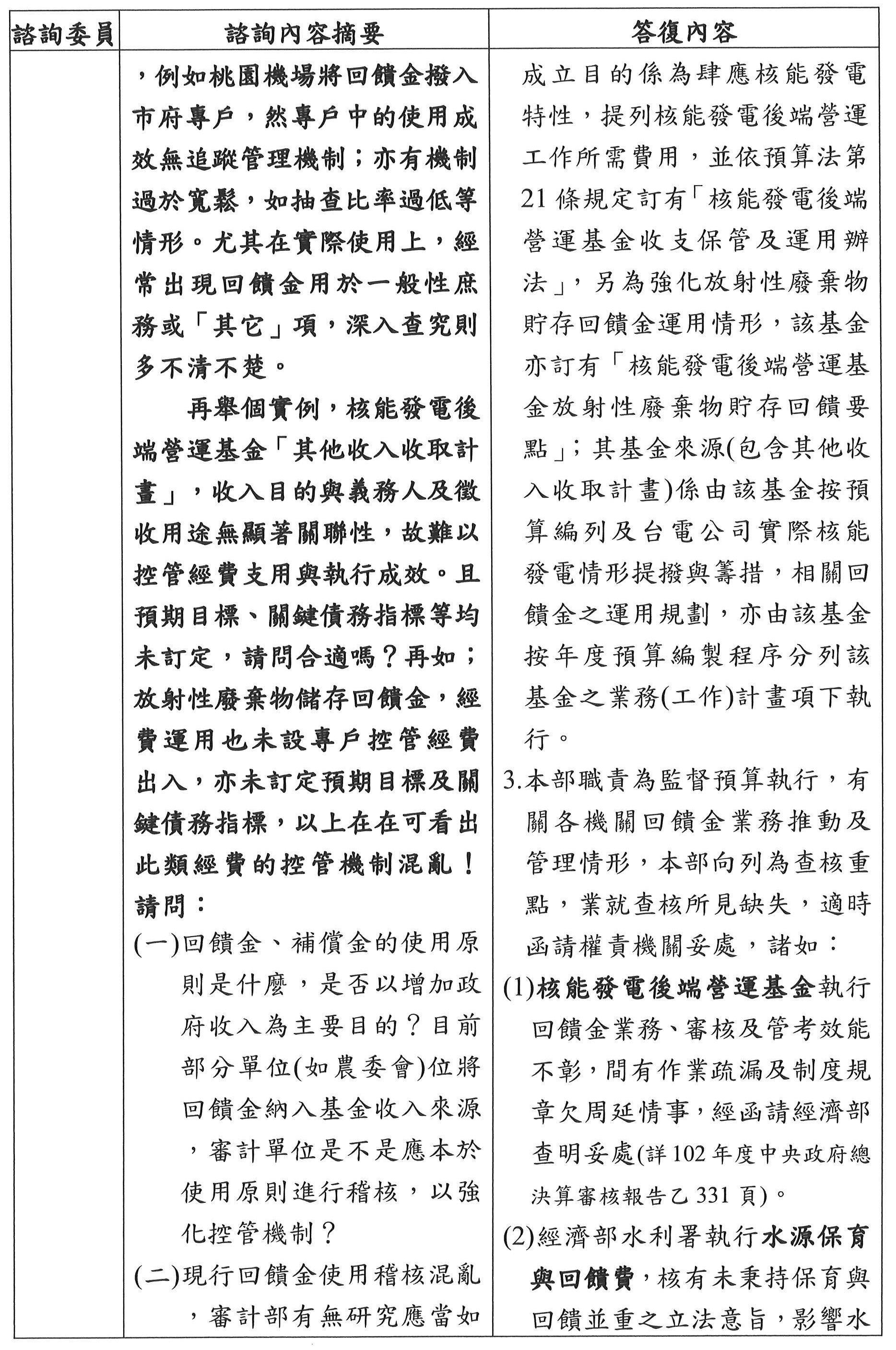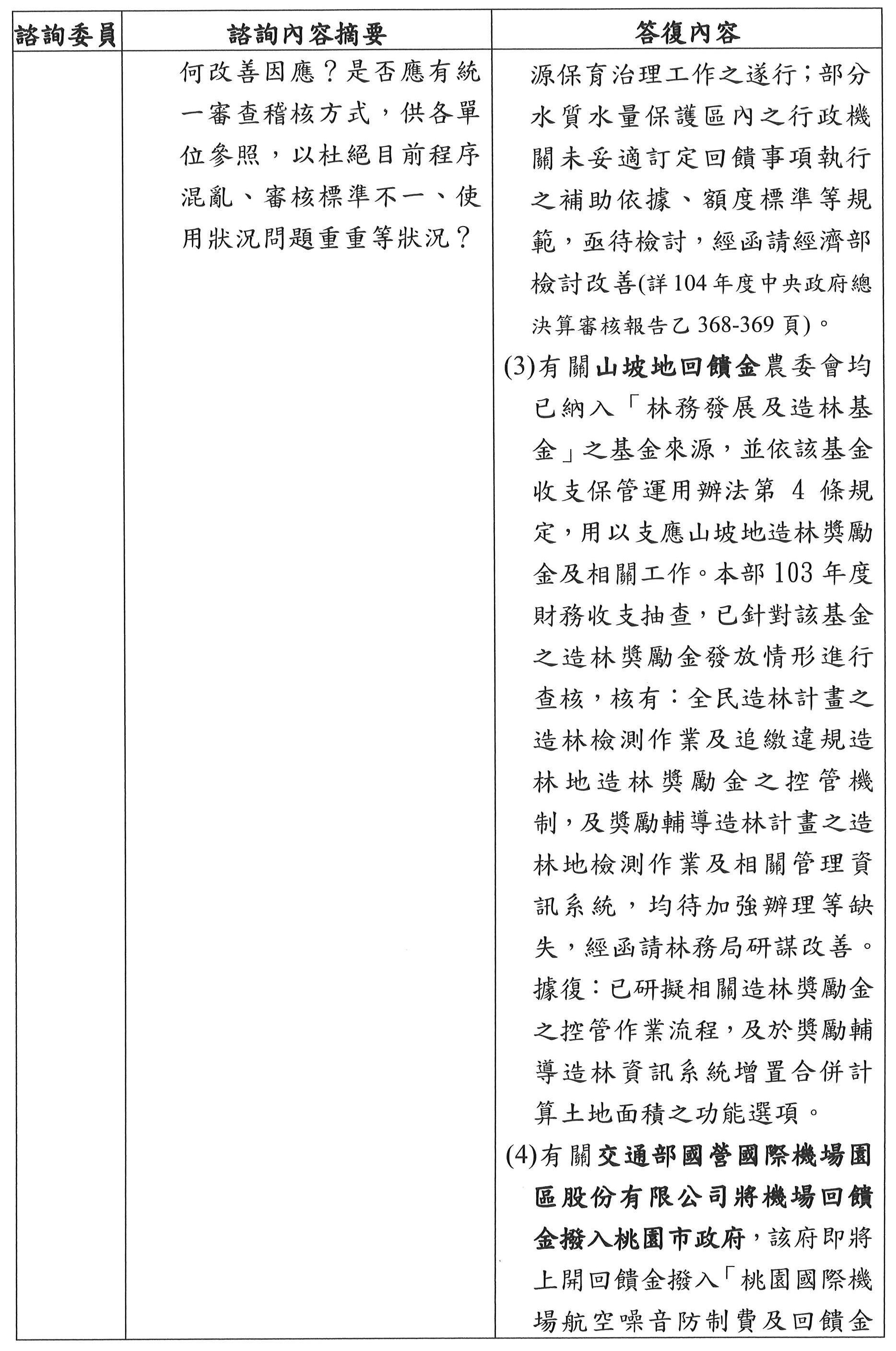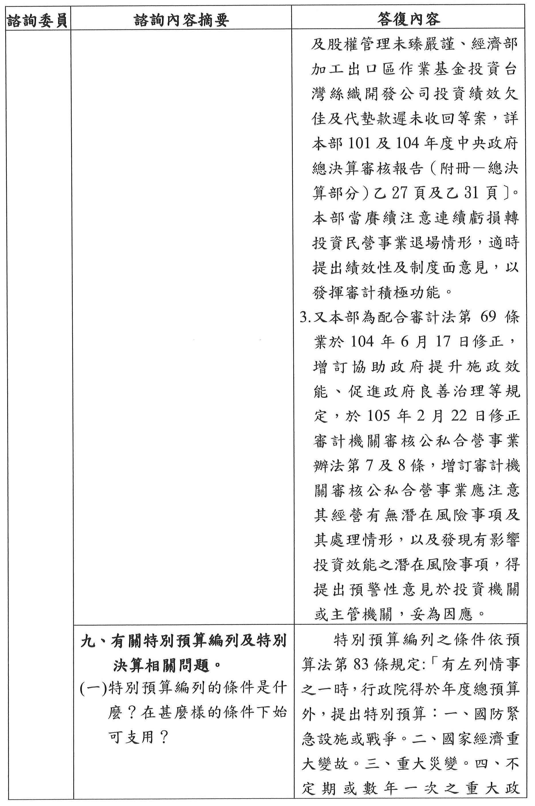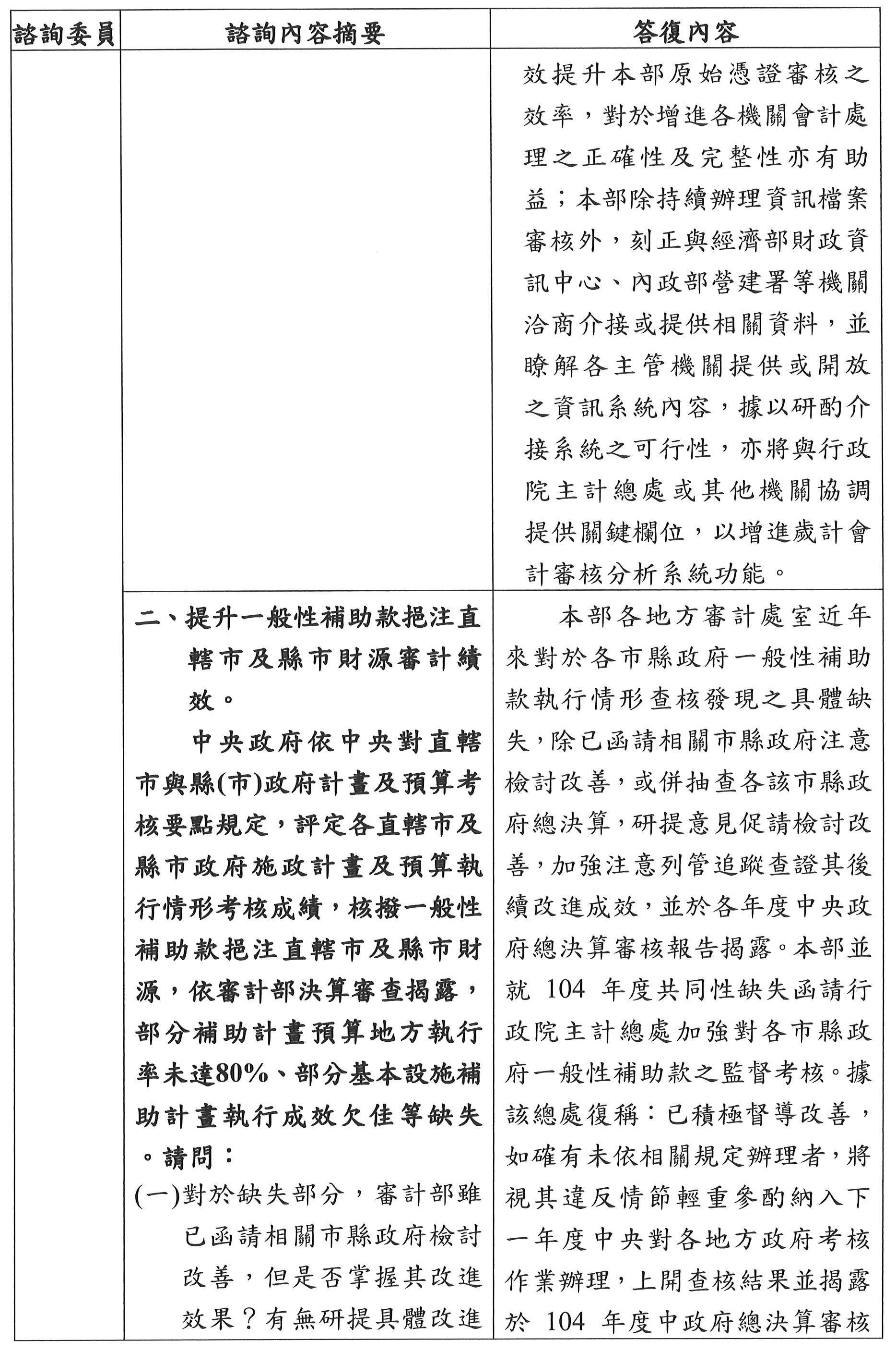 一、審計部函送委員黃偉哲、黃昭順等2人就「中華民國104年度中央政府總決算審核報告、中央政府流域綜合治理計畫第1期特別決算審核報告(中華民國103年度至104年度)」等案審核經過所提諮詢之書面答復,請查照案。