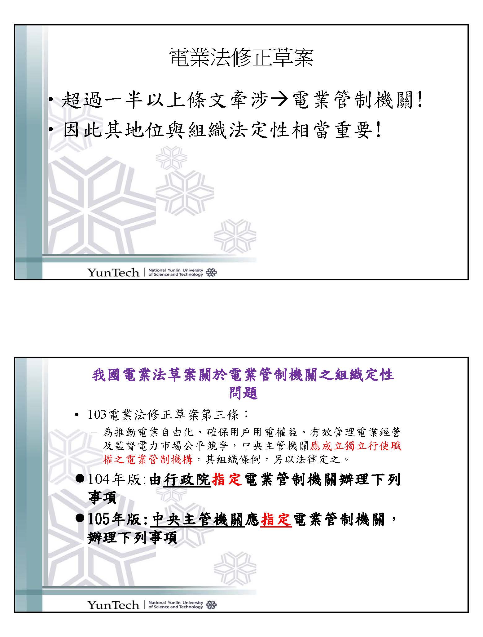 我要跟各位報告,事實上我從103年、104年、105年就開始做我國近來電業法及過去二十年來電業法的追蹤,請大家看新的版本,而其實不用看就知道電業管制機關很重要,但是我要跟各位講它有多重要,所有條文中有一半以上都跟電業管制機關有關,電業管制機關要做的事情可多了,它要發執照、它可以廢照,在新的草案中,它還可以撤換負責人,它還要罰錢、還有行政檢查權,有這麼多的事情!事實上在一百多條的條文中,牽扯、直接寫到電業管制機關的就有50條,那麼這個機關重不重要?但是我們看一下現在的草案,電業管制機關到底該長成甚麼樣子呢?綜觀103年、104年、105年的版本,我簡單跟各位講一個結論,就是愈訂愈混亂!這裡面反映出一些問題,但是我跟各位報告,第一,到底是「行政院」還是「中央主管機關」?是置在行政院之下,還是置中央主管機關之下?這裡所稱的「中央主管機關」指的就是經濟部,這就牽扯到層級,層級到底是要拉到二級以上或是三級?再來是「指定」,我要跟各位報告,以電業法為作用法而要去指定一個組織生出來或是被創設出來,這在法律上有非常大的疑問,而且「指定」是一個事實行為,而不是一個法律用詞,如果今天真的通過這個條文,那是要指定現有的機關,還是可以指定一個還沒有出生的機關?我可以指定上一級機關,還是指定下一級機關?這個機關的名稱應該叫做甚麼?這個機關的最高行政首長該叫做甚麼、他的官階是甚麼、配置的員額是多少?這是空白啊!如果回到剛才所說,一個電業管制機關在電業法修正案中有一半以上的條文提到,而且有這麼多的強制處分力,但是這個機關長甚麼樣子、權限該有多高都沒有規定,難怪會問推動電業自由化到底是玩真的還是玩假的?或者未來推動這項政策時,對於被改組的,不論是台電、民營電廠、業者或民眾都會憂心忡忡,因為這個機關到底長甚麼樣子是有問題的。