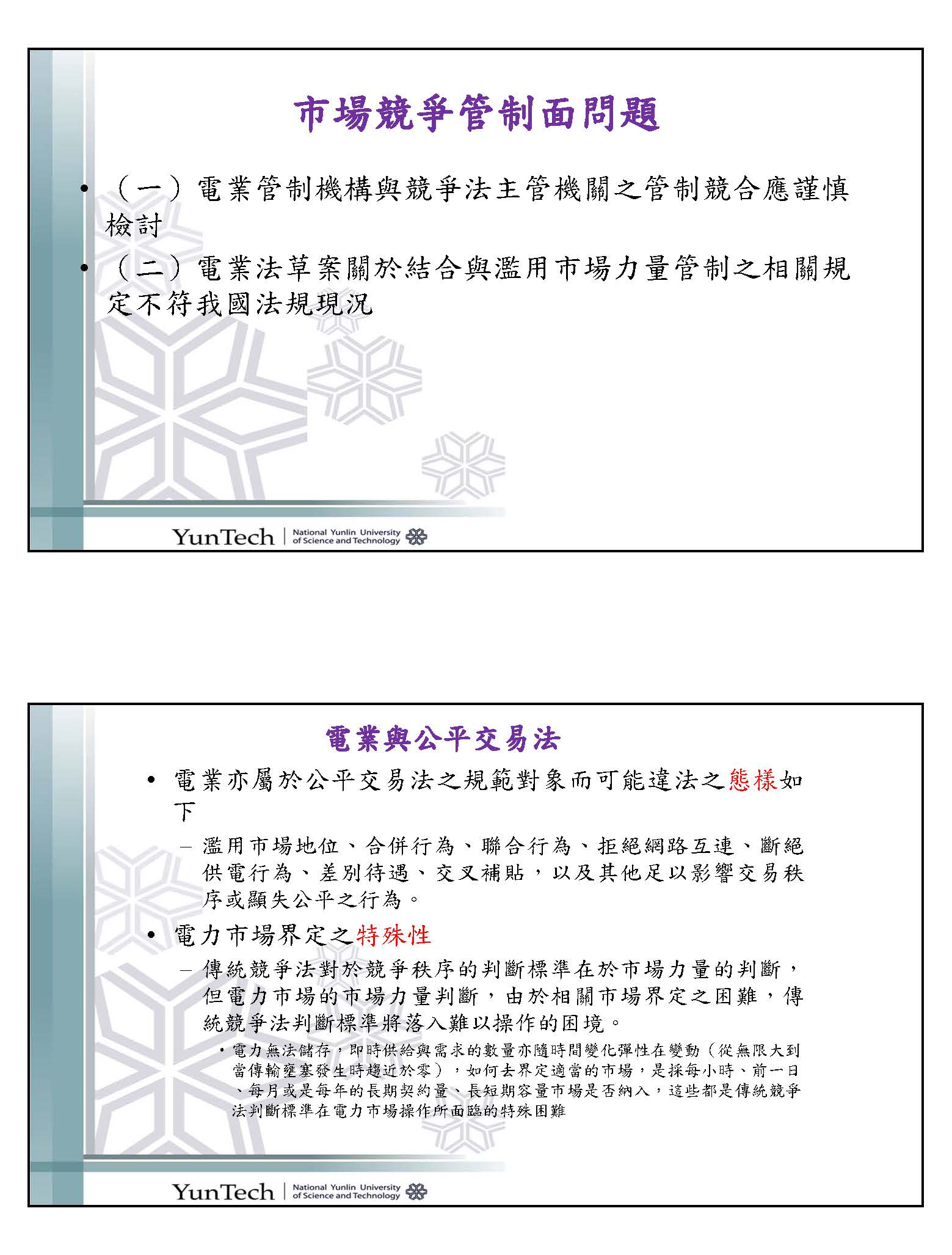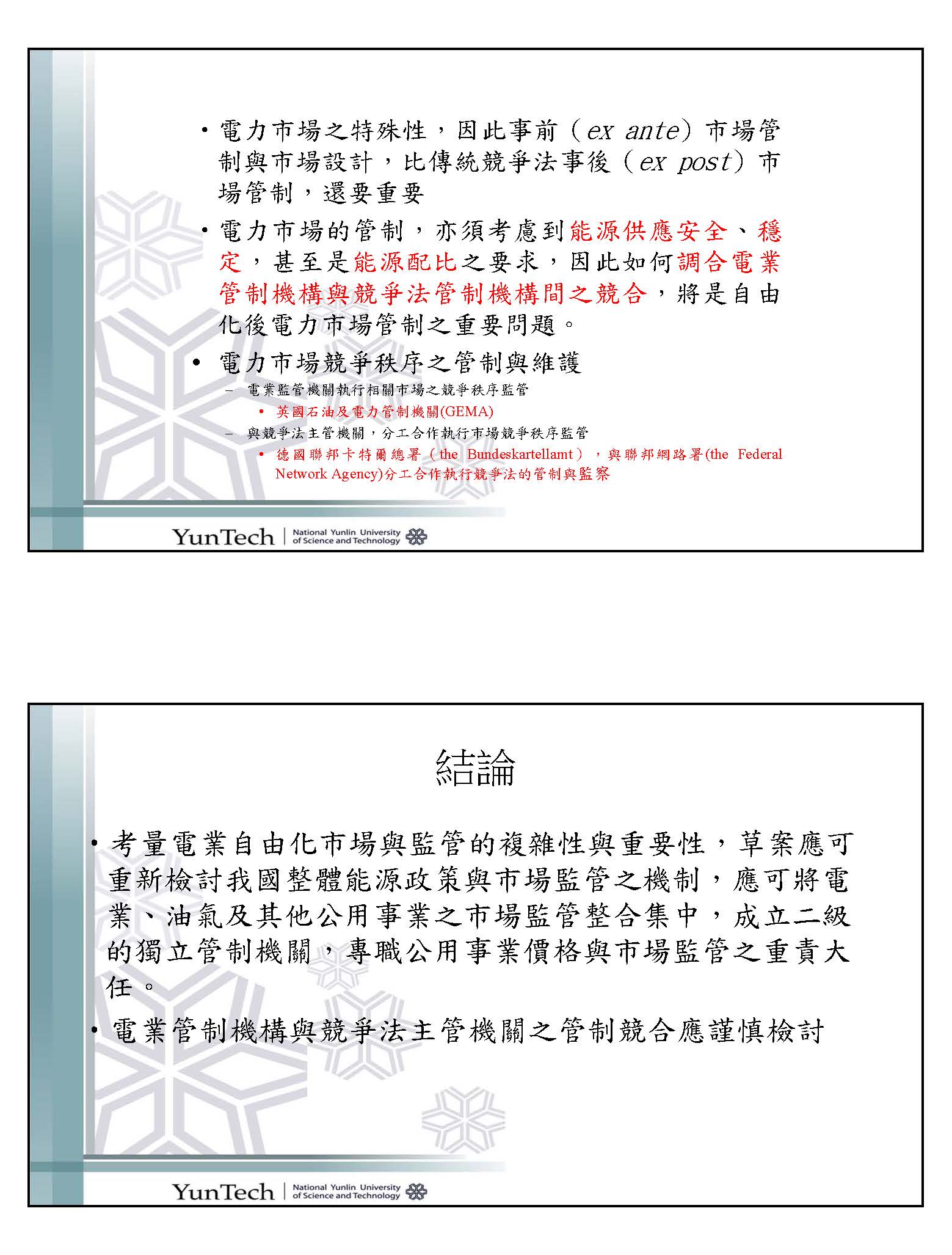 再來是市場管制競爭的問題,世界各國在管制電業的時候,因為電業是很大的事業,但也有很多很細的,畢竟它有不同的能源,所以這裡面會碰到一個問題,就是跟公平會之間的關係。你今天有聯合行為、壟斷行為、有各種不同類型的競爭行為,但是現在出現一個問題,因為有很多的行為在我們能源市場是必要的,可是卻違反現在的公平交易法,如果以後發生這種事情的話要怎麼辦呢?到底是公平會要聽未來能源監管機關的,還是監管機關可以表示意見呢?在國際上,英國是分開來的,德國有關能源市場是由聯邦卡特爾署跟能源監管機關一起下去管的。
