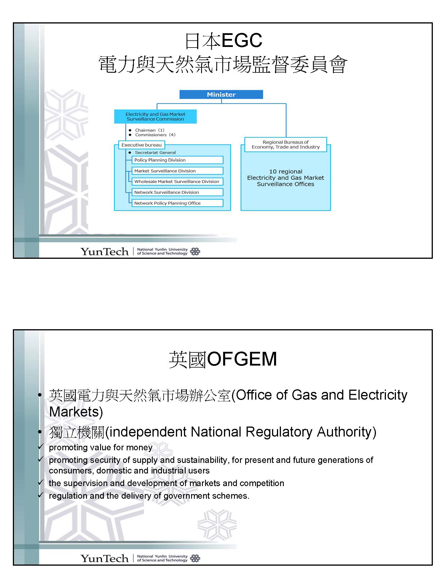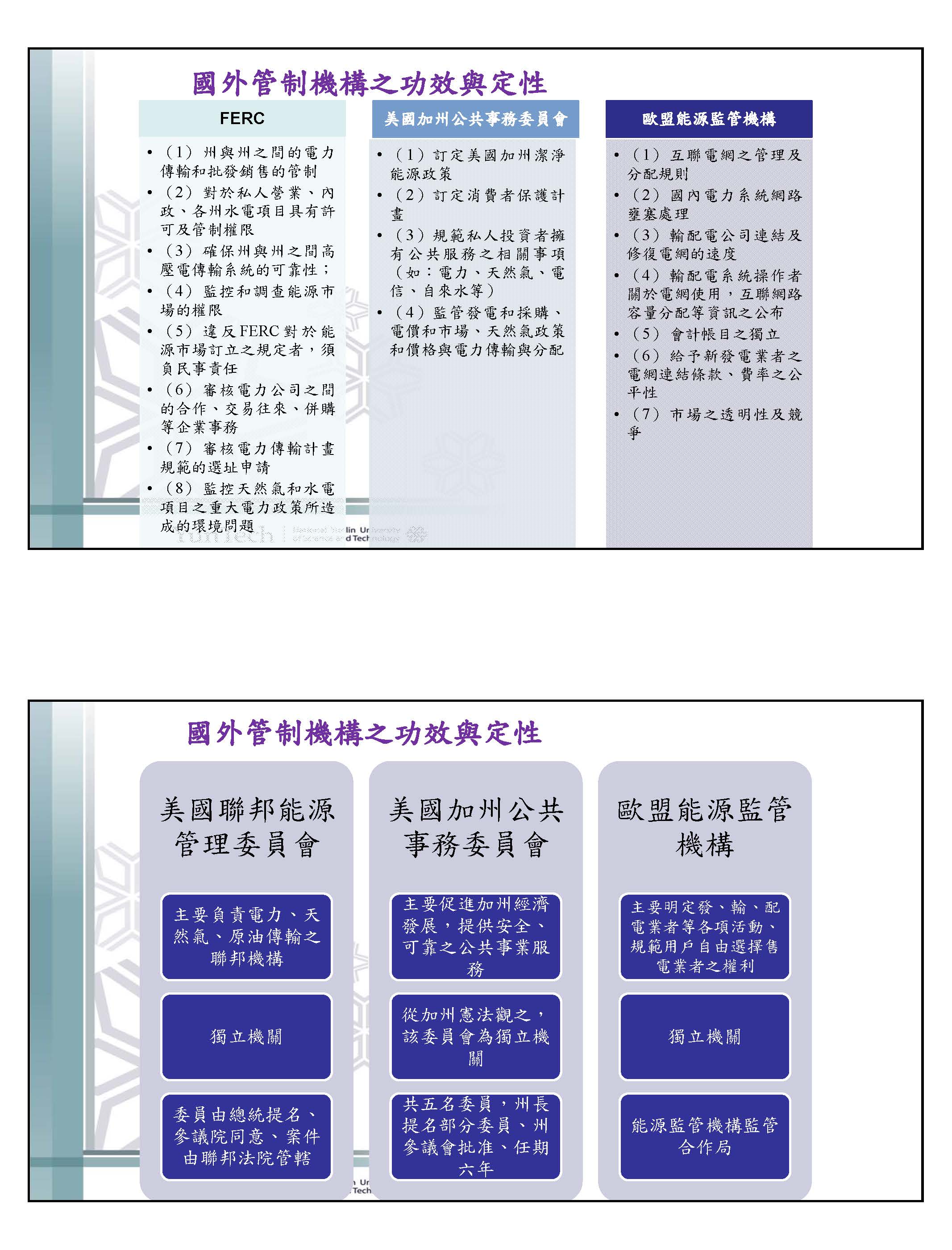 有關獨立管制機構,如果有時間的話,我很樂意以教授的身分跟各位報告。從文獻回顧及各國的經驗來看,推動電業自由化非常重要的一點,除了政府的決心以外,強而有力的獨立電業管制機構才是重點、關鍵;這一點不是我講而已,IEA在2005年的報告也是這樣講。加州在檢討電業自由化後產生的缺電危機,也出現同樣的結論,就是電業管制機構的功能強不強、獨立性夠不夠、專業性夠不夠,將是推動電業自由化能不能順利成功、會不會崩盤的重要關鍵。我很快的舉幾個例子,像是美國有FERC,各州也都有獨立機關;歐盟以一個區域來講,能源監管機構也是一個獨立機關;日本則為EGC,日本在新能源戰略、新能源法通過之後,在第三階段改革它的電業自由化,這是2005年最新通過的,日本也是成立電力與天然氣市場監督委員會,它是獨立機關,完全獨立在管制市場,也就是市場與政策是分開的,市場的監理機關要面對它該有獨立性與功能。另外,英國的OFGEM,大家都很熟悉,它也是一個獨立機關,它也是把電力、天然氣與其他能源的市場一起做管制。