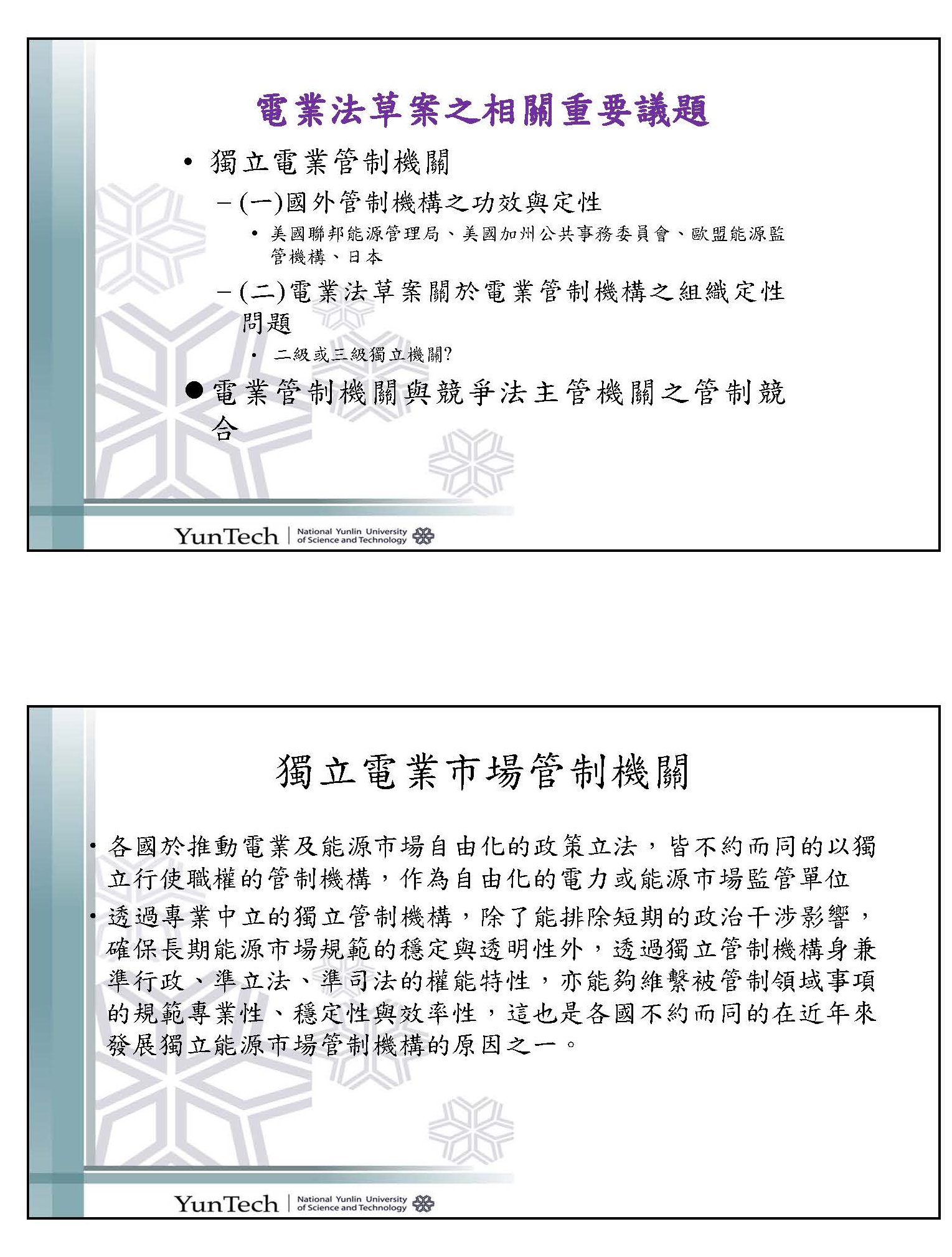 剛才很多先進針對這麼大的事情提出各種看法,我是一個法政學者,因為時間有限,我簡單就兩個我認為比較大的重點跟各位報告,第一個,是獨立管制機構的問題,第二個如果有時間的話,我再跟各位報告,就是電業管制機關跟競爭法主管機關在市場管制上競合可能出現的問題。
