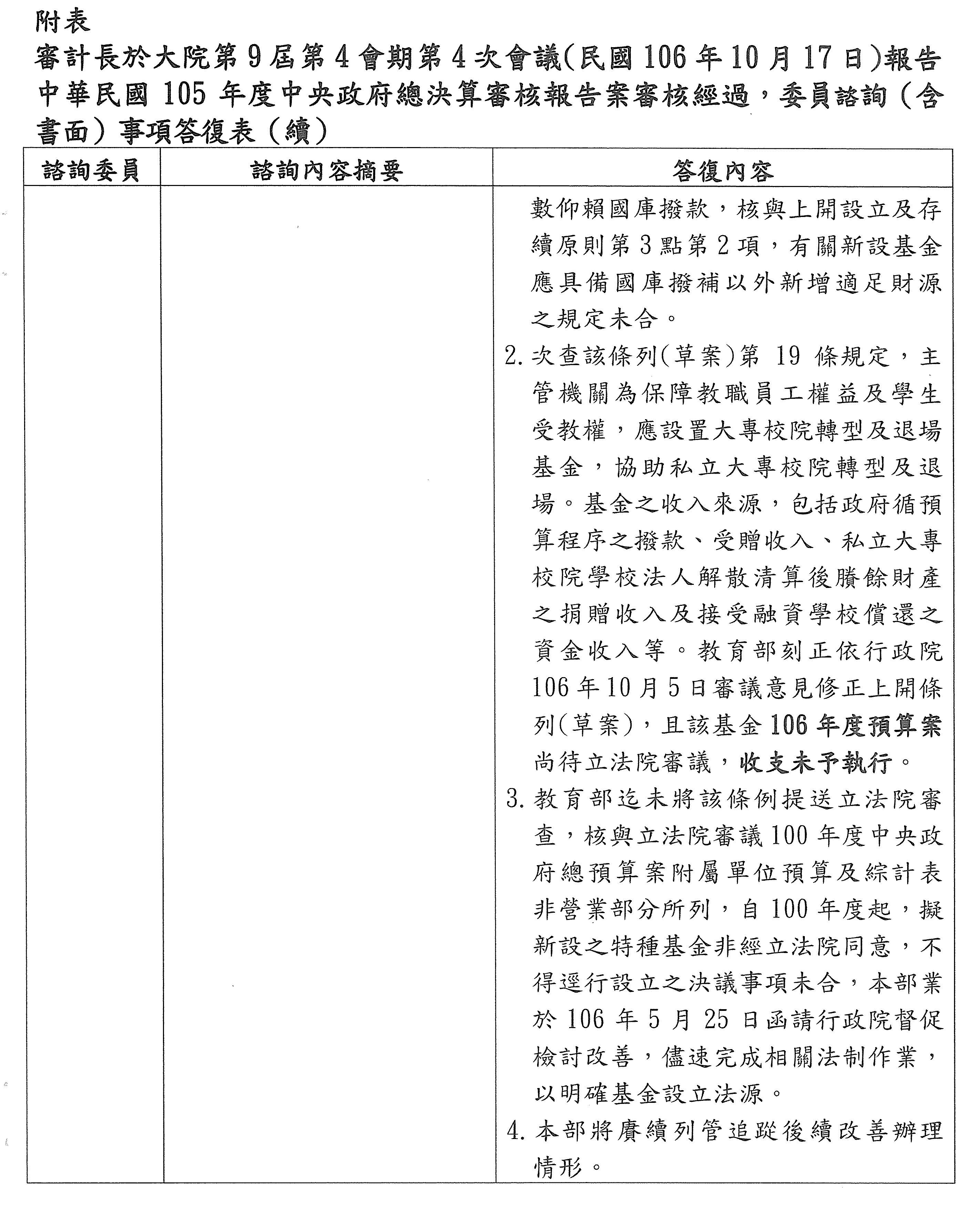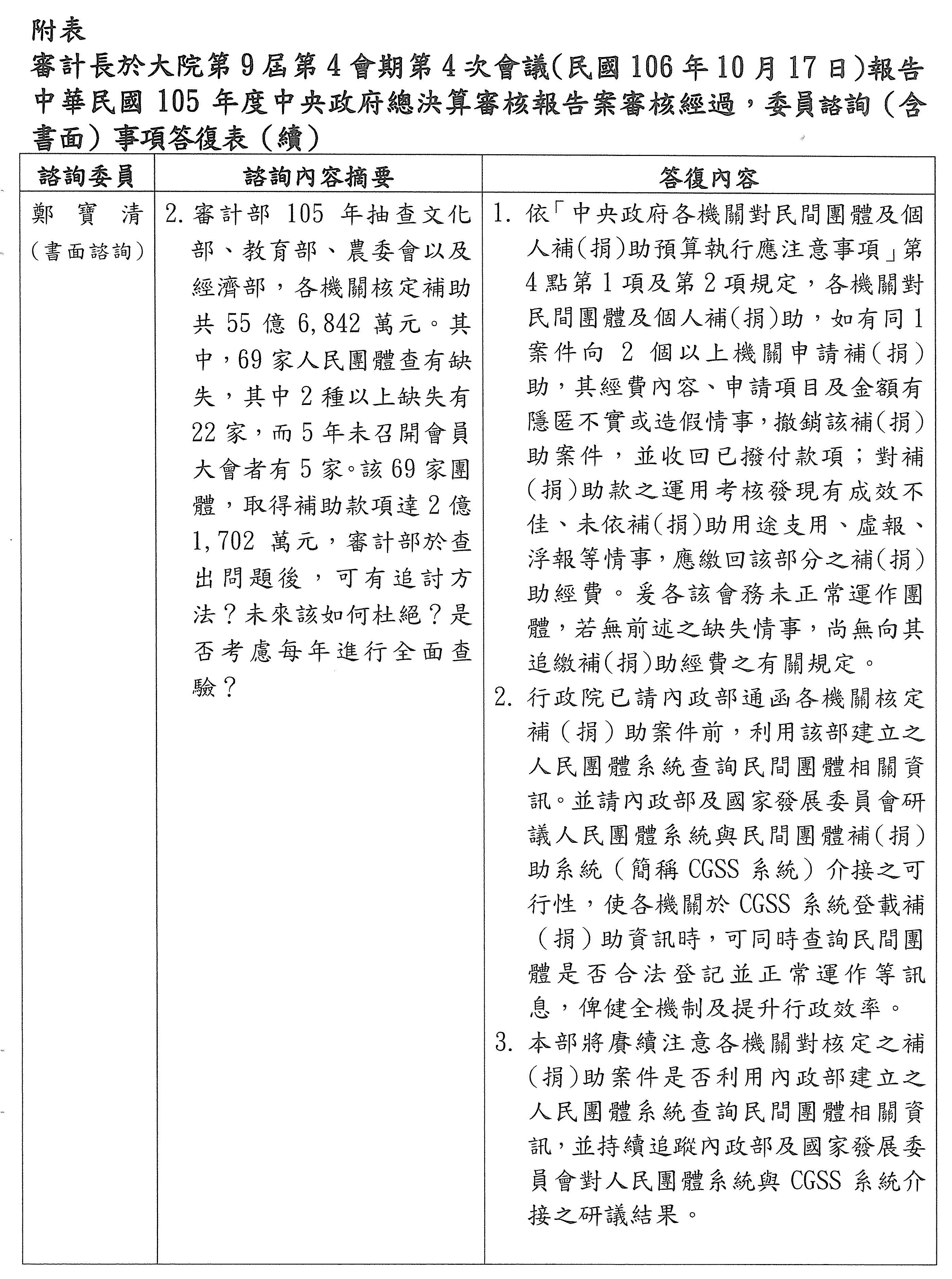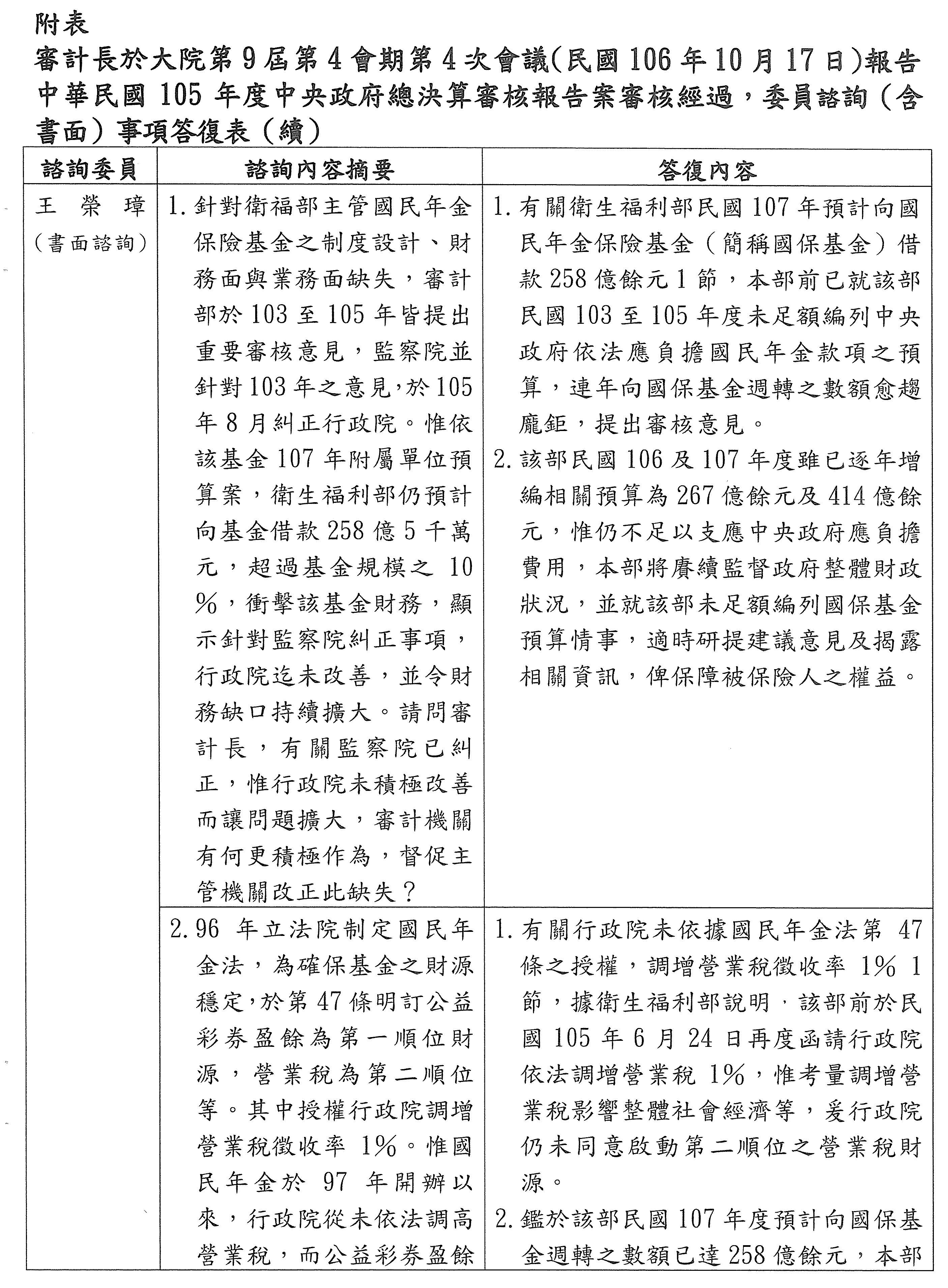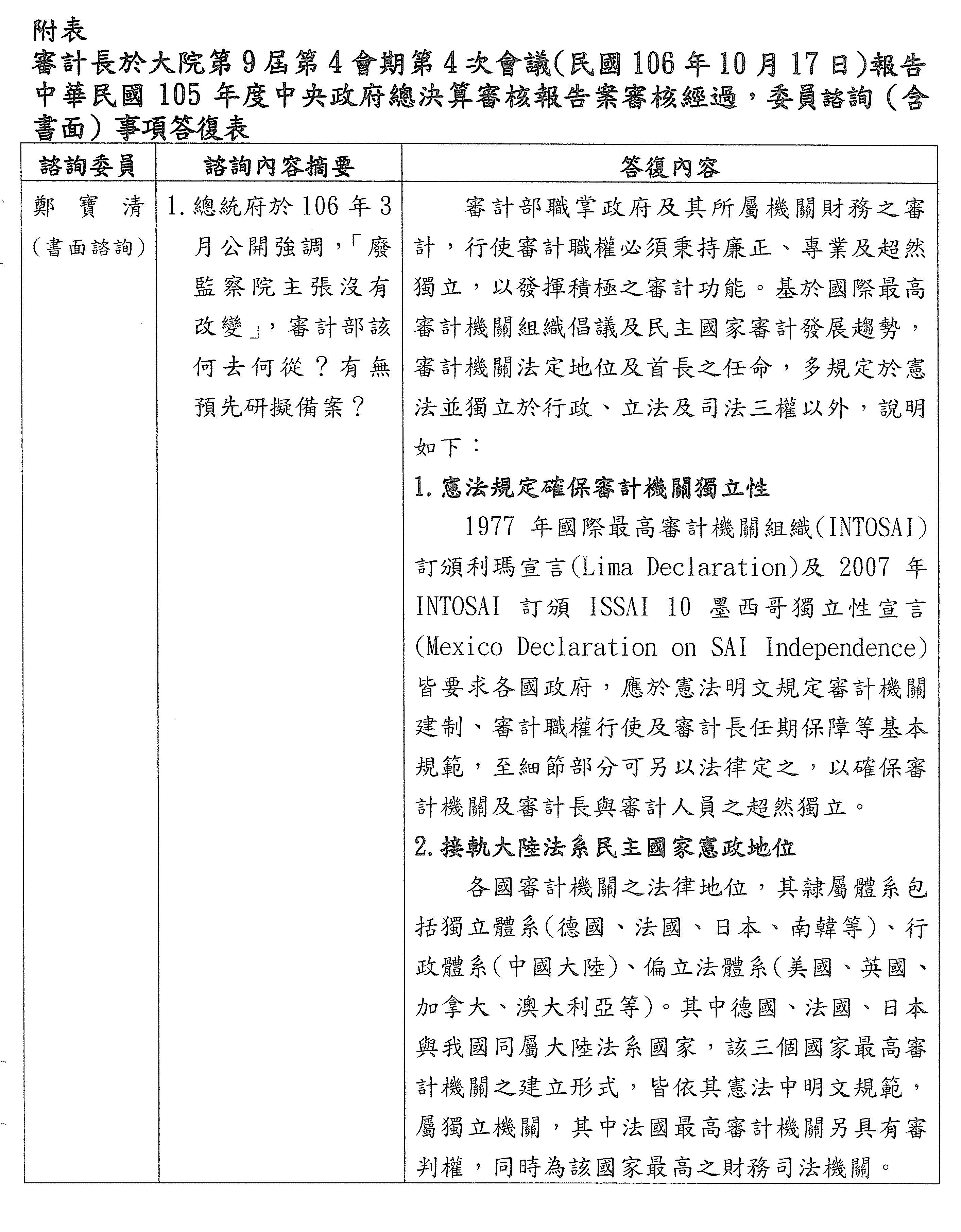 (一)審計部函送委員鄭寶清、王榮璋、賴士葆等3人就「中華民國105年度中央政府總決算審核報告案」審核經過所提諮詢之書面答復,請查照案。